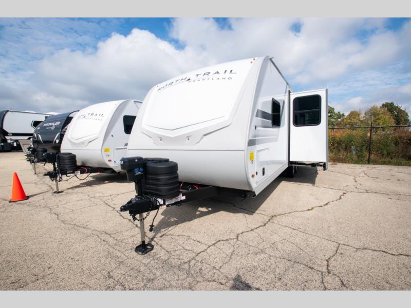 Built for comfort, durability, and modern convenience, these Heartland North Trail travel trailers offer everything you need for a premium camping experience. Each model features a strong American-made Norco Z-frame with an aerodynamic front profile and front diamond plating for added protection. The exclusive TrusstXL Roof System and CoreShield vacuum-bonded walls with Azdel provide superior insulation. Inside, enjoy residential comforts like seamless countertops, solid hardwood maple cabinet doors, LED lighting throughout, and 60 x 80 in. queen beds or 60 x 76 in. Murphy beds. Tech-ready features include an LED smart TV, USB ports, TPMS monitoring, and a 200W solar panel with 30 AMP digital controller. With a Quiet Series A/C, on-demand 60K BTU water heater, with these trailers you are equipped to make every trip comfortable and adventure-ready.