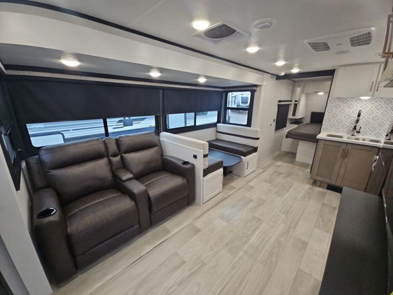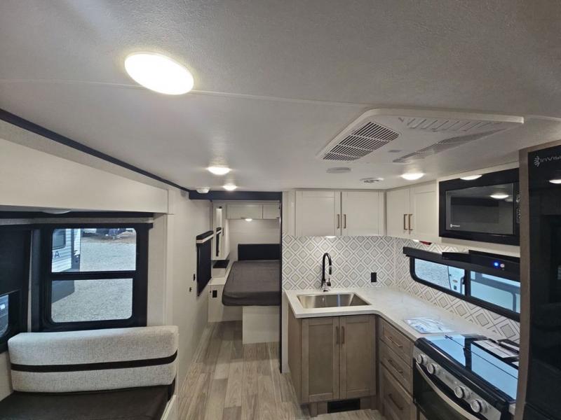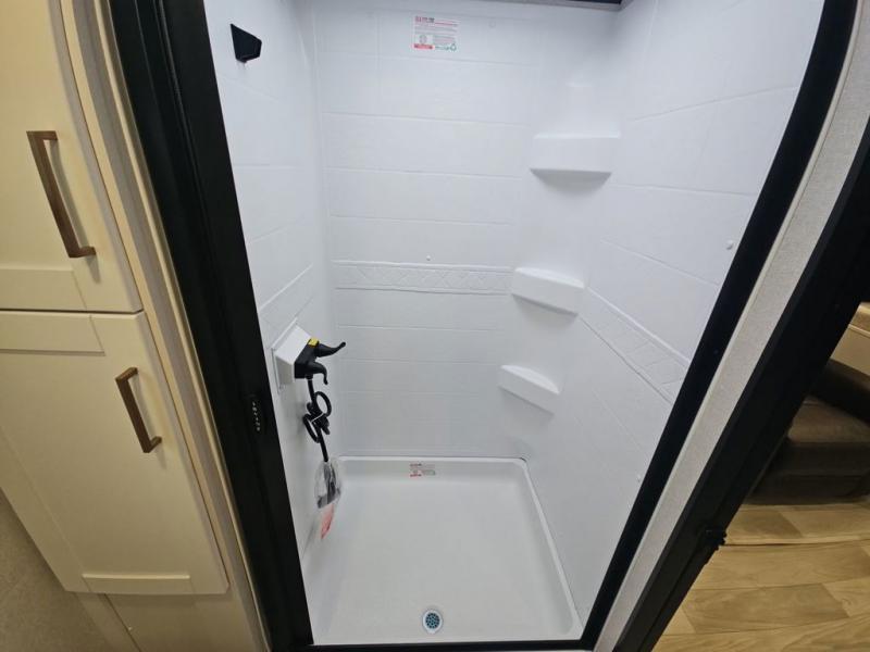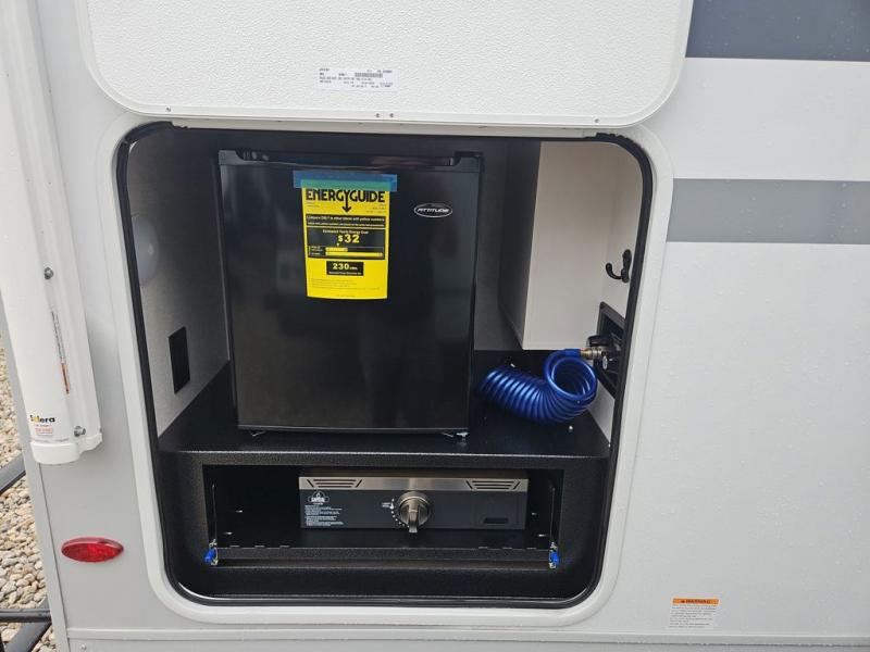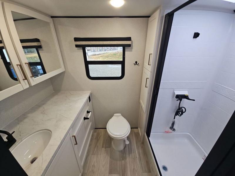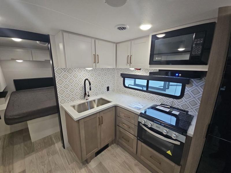 At the front of this travel trailer, you'll find a private bedroom featuring a 60" x 80" queen bed for a restful night’s sleep, in between nightstands on each side for added convenience. Moving into the center of the trailer, the main living area offers a spacious slide-out with a 60" tri-fold sofa perfect for lounging, and a 40" x 70" dinette ideal for meals, game nights, or gathering with friends and family—both of which convert into extra-sleeping space if needed. Across from the slide, the L-shaped kitchen is thoughtfully designed for ease and efficiency, featuring a stainless steel sink on one end, seamless countertop space for prepping meals, a three-burner range, and an 11 cu. ft. refrigerator for all your cooking essentials. Just beside the refrigerator is the entertainment center, with a walk-in pantry tucked behind it to store all your dry goods and snacks. At the rear, the full bathroom provides generous counter space, making it easy and comfortable to get ready each day.