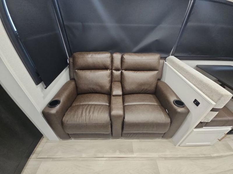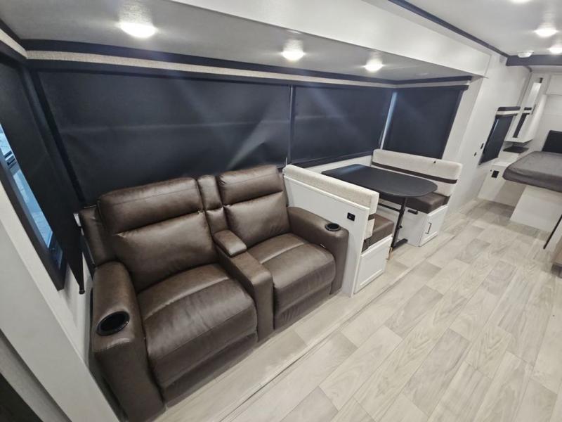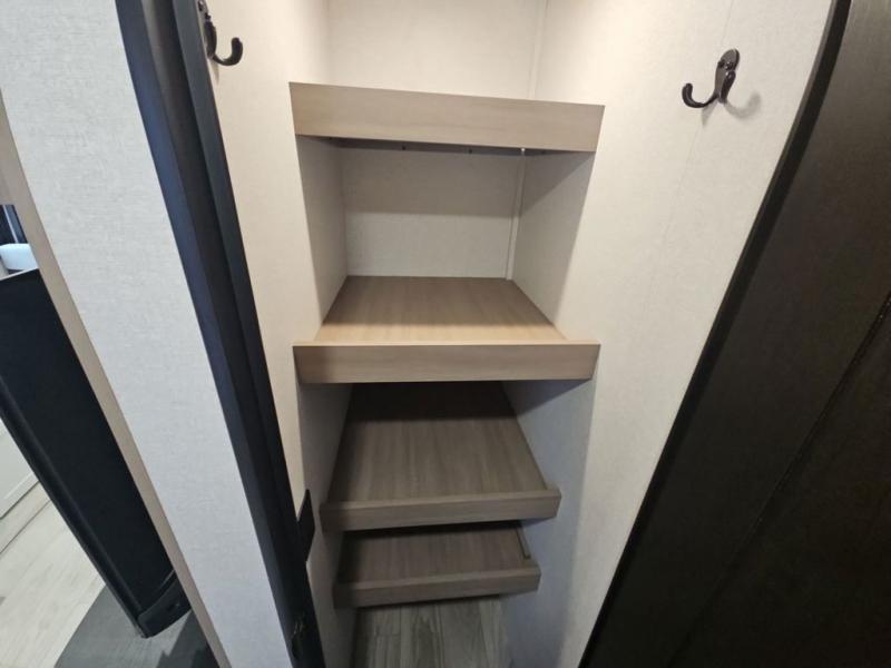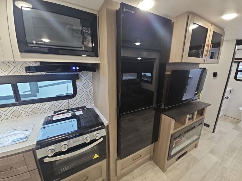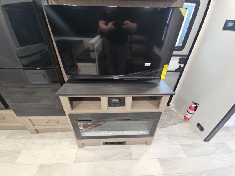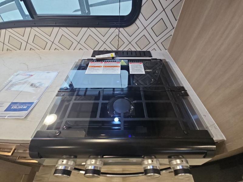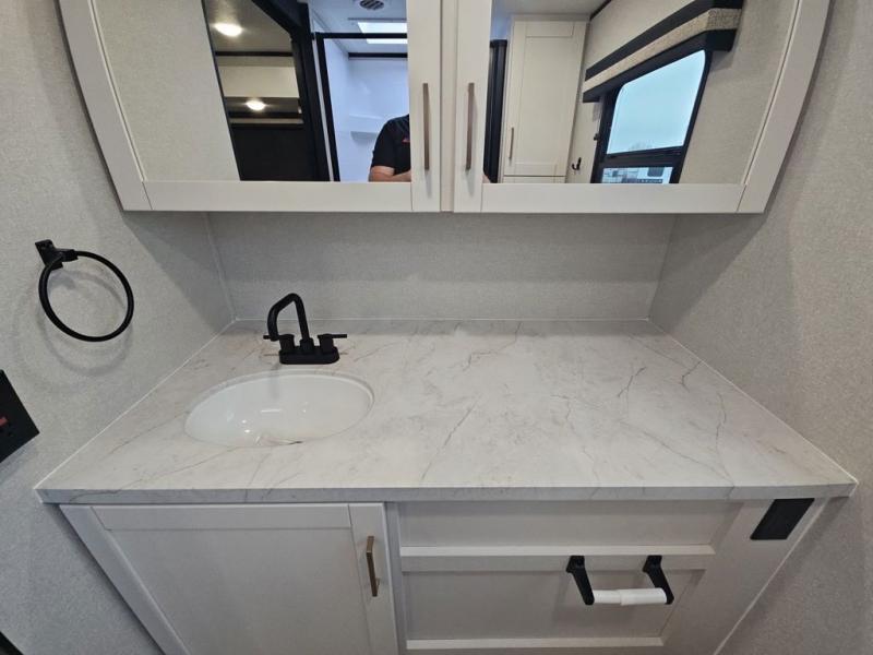 At the front of this travel trailer, you'll find a private bedroom featuring a 60" x 80" queen bed for a restful night’s sleep, in between nightstands on each side for added convenience. Moving into the center of the trailer, the main living area offers a spacious slide-out with a 60" tri-fold sofa perfect for lounging, and a 40" x 70" dinette ideal for meals, game nights, or gathering with friends and family—both of which convert into extra-sleeping space if needed. Across from the slide, the L-shaped kitchen is thoughtfully designed for ease and efficiency, featuring a stainless steel sink on one end, seamless countertop space for prepping meals, a three-burner range, and an 11 cu. ft. refrigerator for all your cooking essentials. Just beside the refrigerator is the entertainment center, with a walk-in pantry tucked behind it to store all your dry goods and snacks. At the rear, the full bathroom provides generous counter space, making it easy and comfortable to get ready each day.