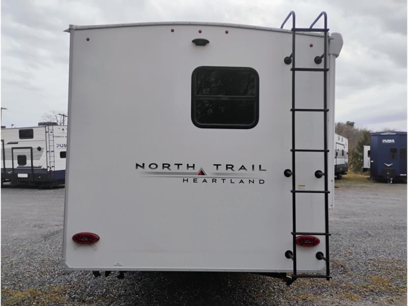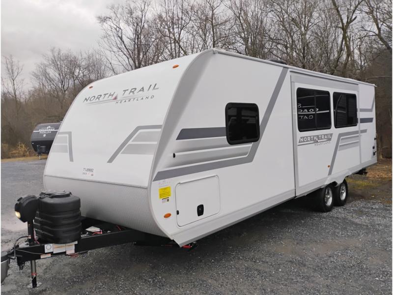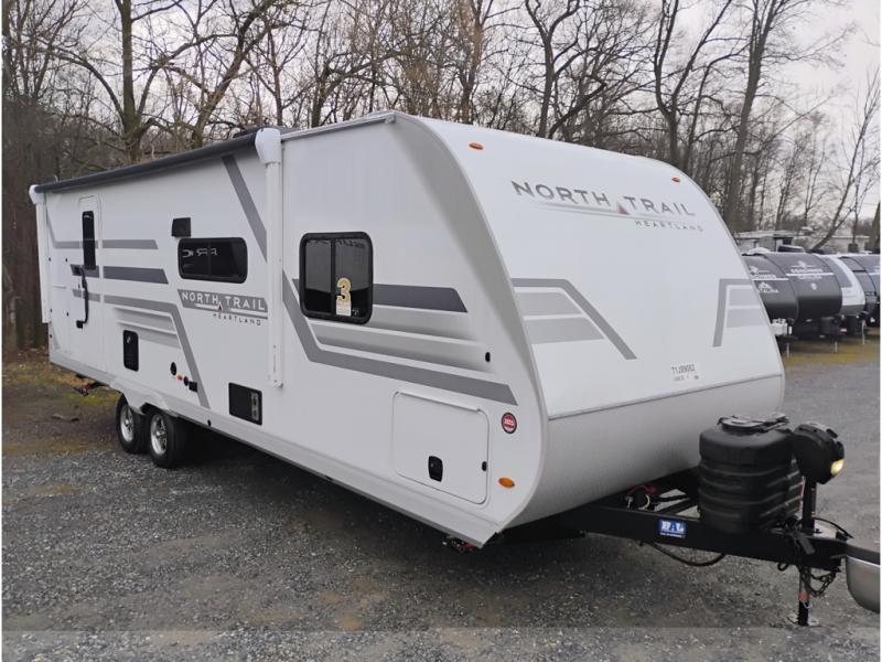 Built for comfort, durability, and modern convenience, these Heartland North Trail travel trailers offer everything you need for a premium camping experience. Each model features a strong American-made Norco Z-frame with an aerodynamic front profile and front diamond plating for added protection. The exclusive TrusstXL Roof System and CoreShield vacuum-bonded walls with Azdel provide superior insulation. Inside, enjoy residential comforts like seamless countertops, solid hardwood maple cabinet doors, LED lighting throughout, and 60 x 80 in. queen beds or 60 x 76 in. Murphy beds. Tech-ready features include an LED smart TV, USB ports, TPMS monitoring, and a 200W solar panel with 30 AMP digital controller. With a Quiet Series A/C, on-demand 60K BTU water heater, with these trailers you are equipped to make every trip comfortable and adventure-ready.