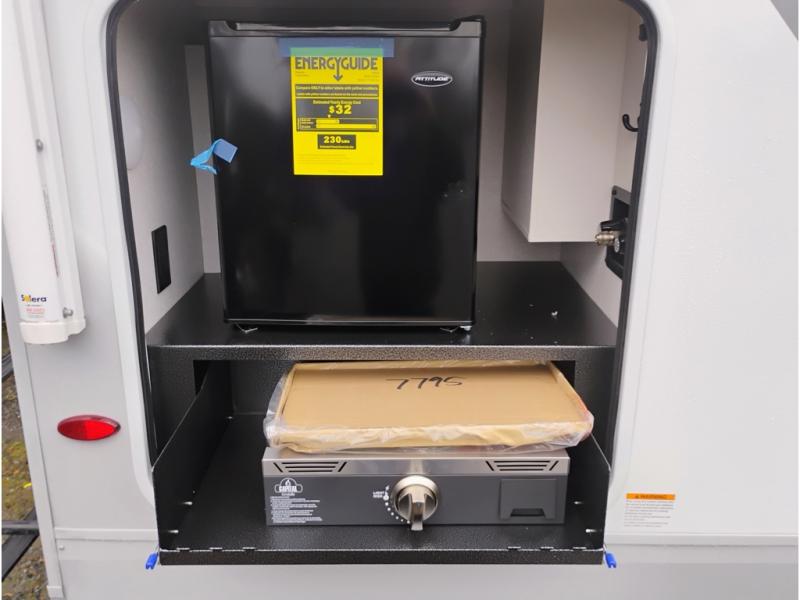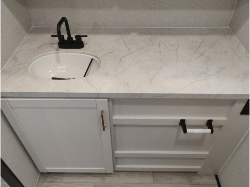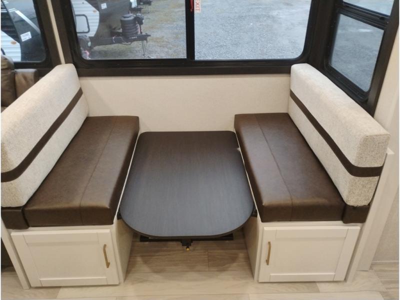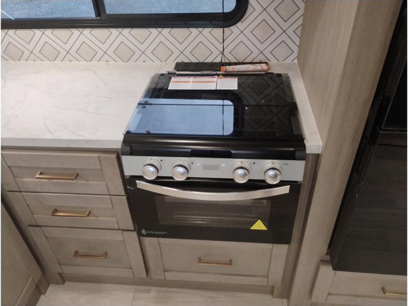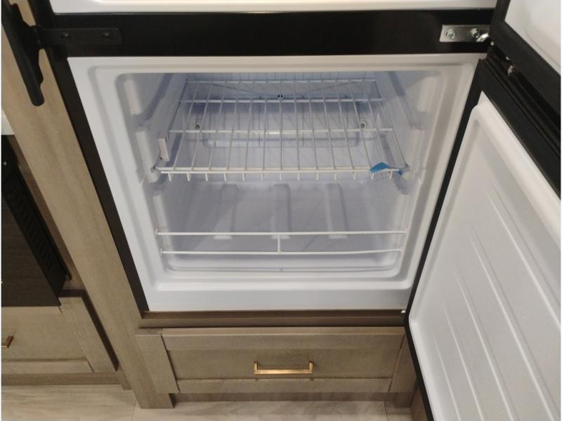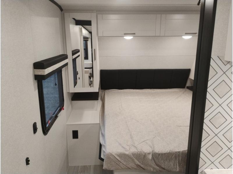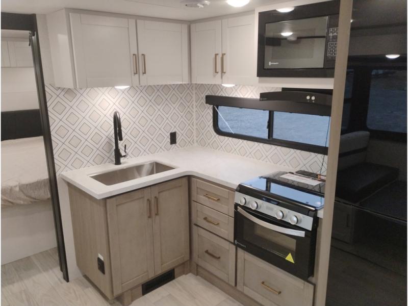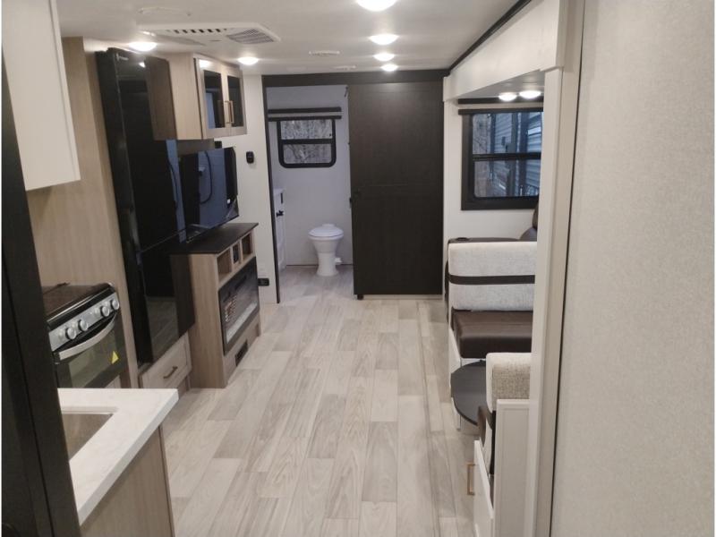 At the front of this travel trailer, you'll find a private bedroom featuring a 60" x 80" queen bed for a restful night’s sleep, in between nightstands on each side for added convenience. Moving into the center of the trailer, the main living area offers a spacious slide-out with a 60" tri-fold sofa perfect for lounging, and a 40" x 70" dinette ideal for meals, game nights, or gathering with friends and family—both of which convert into extra-sleeping space if needed. Across from the slide, the L-shaped kitchen is thoughtfully designed for ease and efficiency, featuring a stainless steel sink on one end, seamless countertop space for prepping meals, a three-burner range, and an 11 cu. ft. refrigerator for all your cooking essentials. Just beside the refrigerator is the entertainment center, with a walk-in pantry tucked behind it to store all your dry goods and snacks. At the rear, the full bathroom provides generous counter space, making it easy and comfortable to get ready each day.