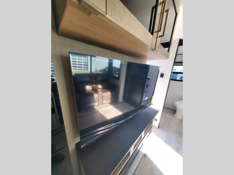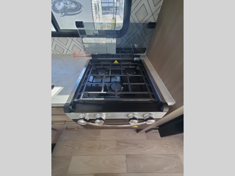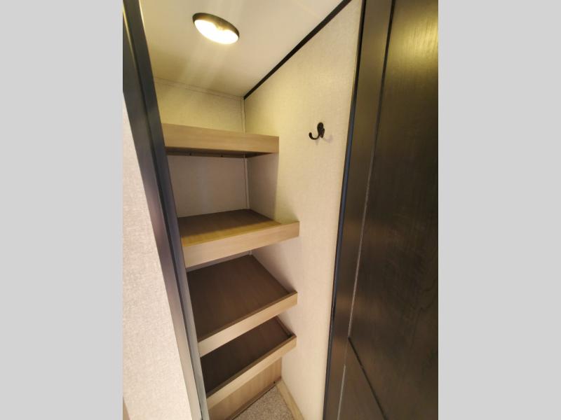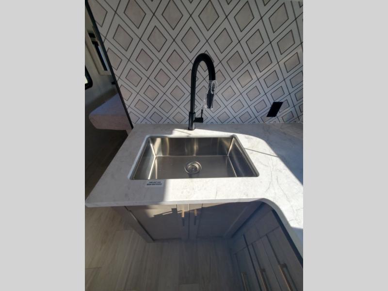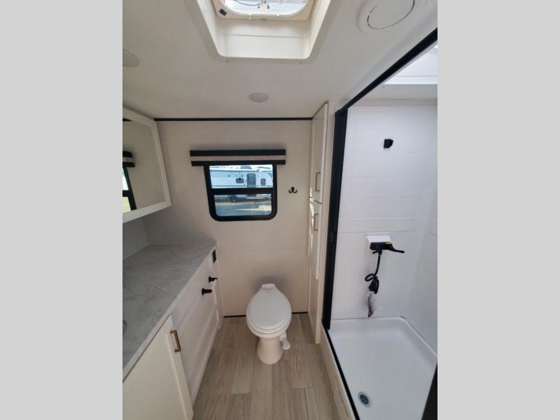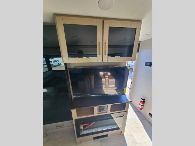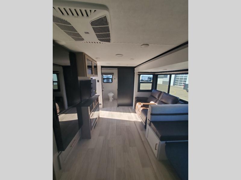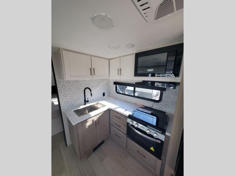 At the front of this travel trailer, you'll find a private bedroom featuring a 60" x 80" queen bed for a restful night’s sleep, in between nightstands on each side for added convenience. Moving into the center of the trailer, the main living area offers a spacious slide-out with a 60" tri-fold sofa perfect for lounging, and a 40" x 70" dinette ideal for meals, game nights, or gathering with friends and family—both of which convert into extra-sleeping space if needed. Across from the slide, the L-shaped kitchen is thoughtfully designed for ease and efficiency, featuring a stainless steel sink on one end, seamless countertop space for prepping meals, a three-burner range, and an 11 cu. ft. refrigerator for all your cooking essentials. Just beside the refrigerator is the entertainment center, with a walk-in pantry tucked behind it to store all your dry goods and snacks. At the rear, the full bathroom provides generous counter space, making it easy and comfortable to get ready each day.