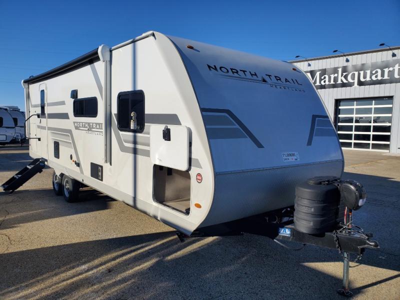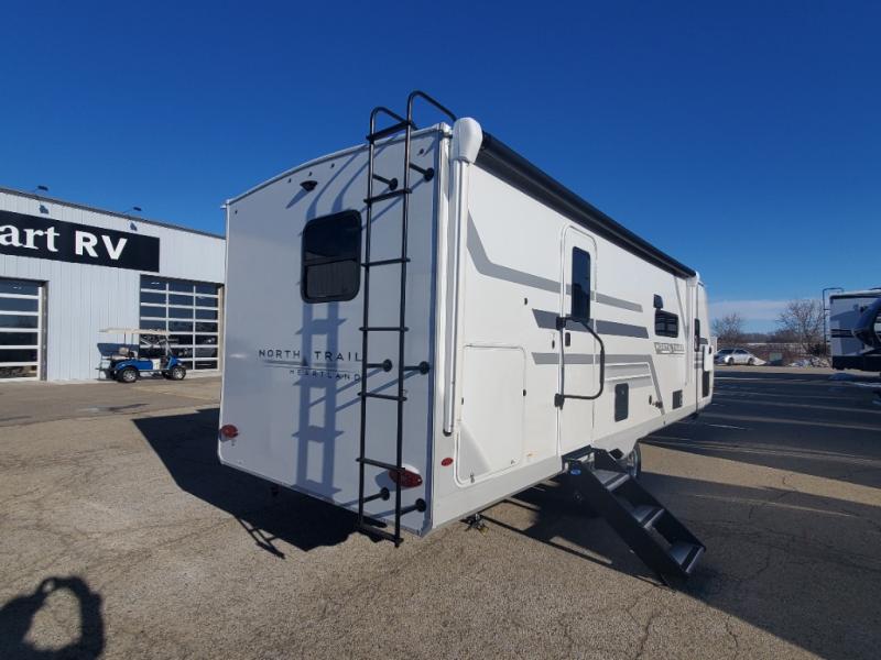 Built for comfort, durability, and modern convenience, these Heartland North Trail travel trailers offer everything you need for a premium camping experience. Each model features a strong American-made Norco Z-frame with an aerodynamic front profile and front diamond plating for added protection. The exclusive TrusstXL Roof System and CoreShield vacuum-bonded walls with Azdel provide superior insulation. Inside, enjoy residential comforts like seamless countertops, solid hardwood maple cabinet doors, LED lighting throughout, and 60 x 80 in. queen beds or 60 x 76 in. Murphy beds. Tech-ready features include an LED smart TV, USB ports, TPMS monitoring, and a 200W solar panel with 30 AMP digital controller. With a Quiet Series A/C, on-demand 60K BTU water heater, with these trailers you are equipped to make every trip comfortable and adventure-ready.