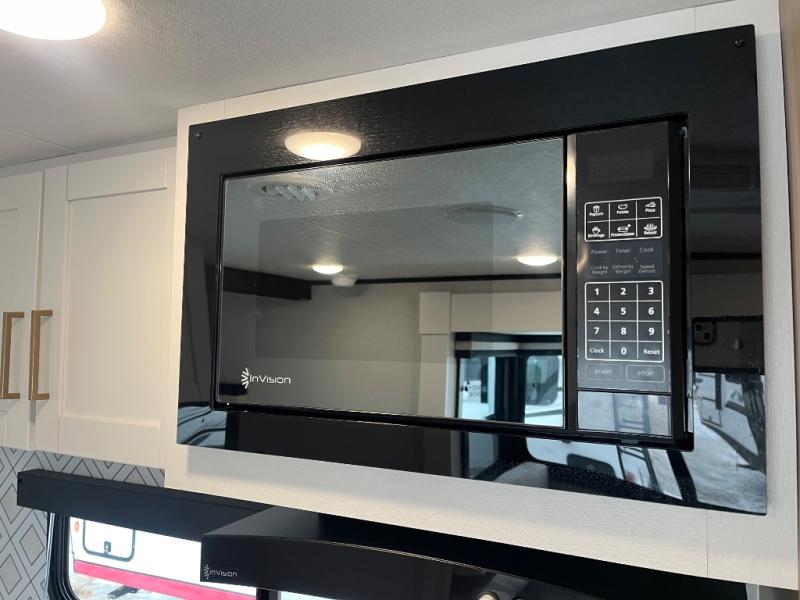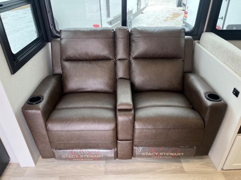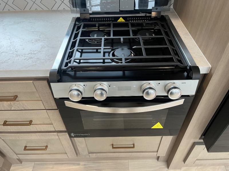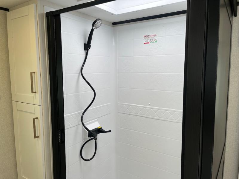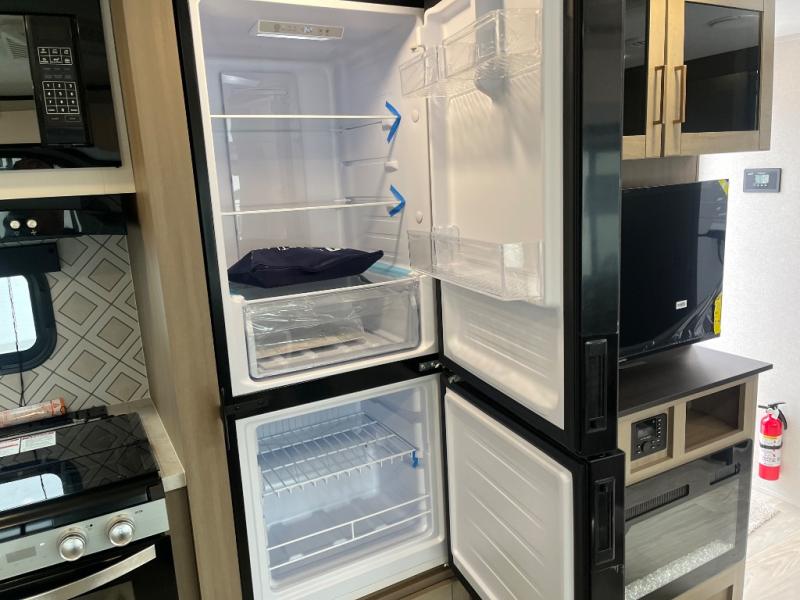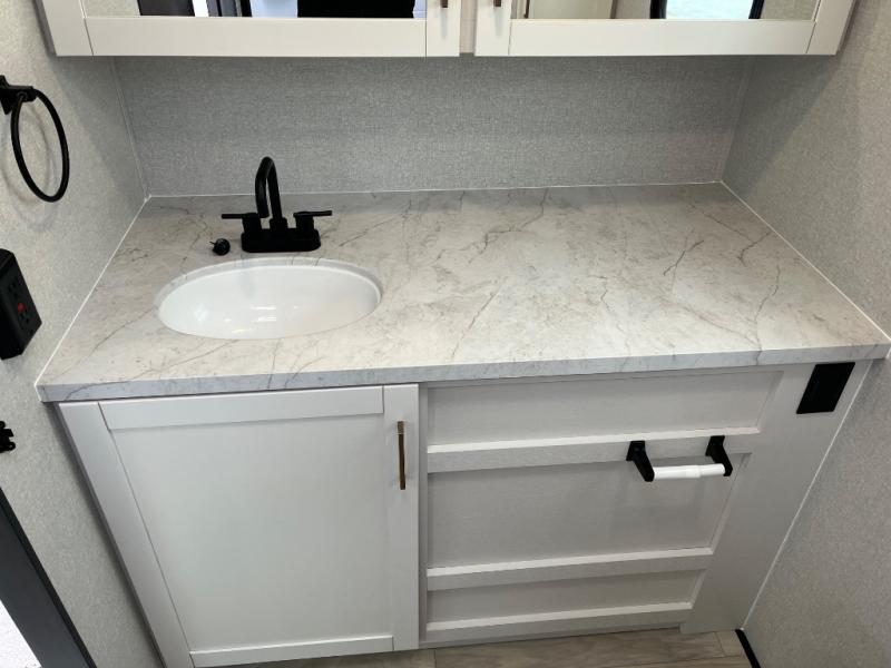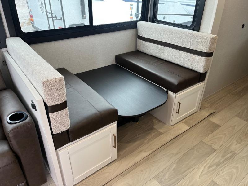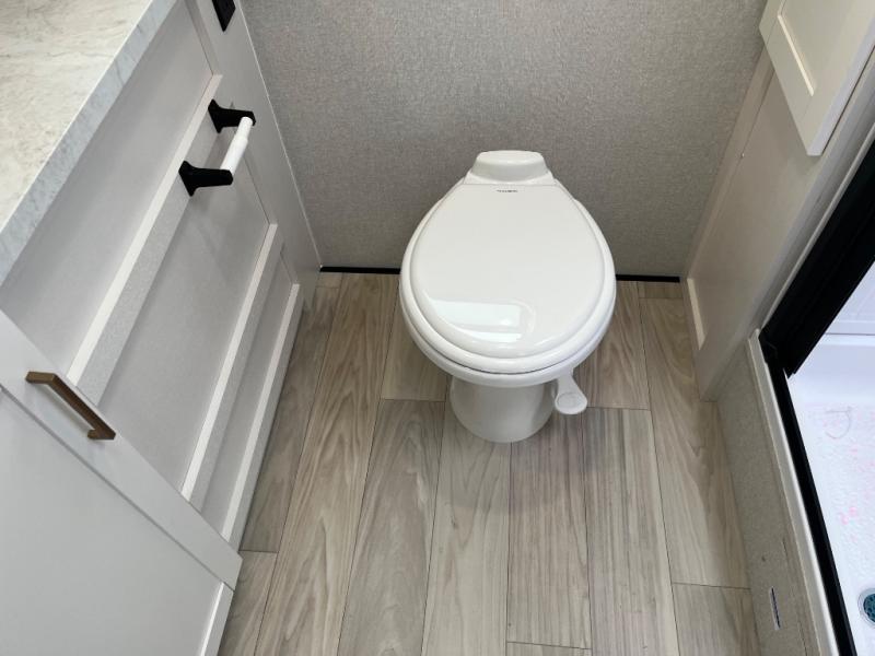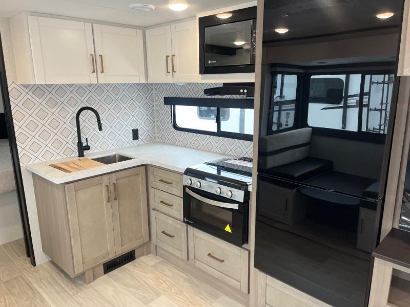 At the front of this travel trailer, you'll find a private bedroom featuring a 60" x 80" queen bed for a restful night’s sleep, in between nightstands on each side for added convenience. Moving into the center of the trailer, the main living area offers a spacious slide-out with a 60" tri-fold sofa perfect for lounging, and a 40" x 70" dinette ideal for meals, game nights, or gathering with friends and family—both of which convert into extra-sleeping space if needed. Across from the slide, the L-shaped kitchen is thoughtfully designed for ease and efficiency, featuring a stainless steel sink on one end, seamless countertop space for prepping meals, a three-burner range, and an 11 cu. ft. refrigerator for all your cooking essentials. Just beside the refrigerator is the entertainment center, with a walk-in pantry tucked behind it to store all your dry goods and snacks. At the rear, the full bathroom provides generous counter space, making it easy and comfortable to get ready each day.