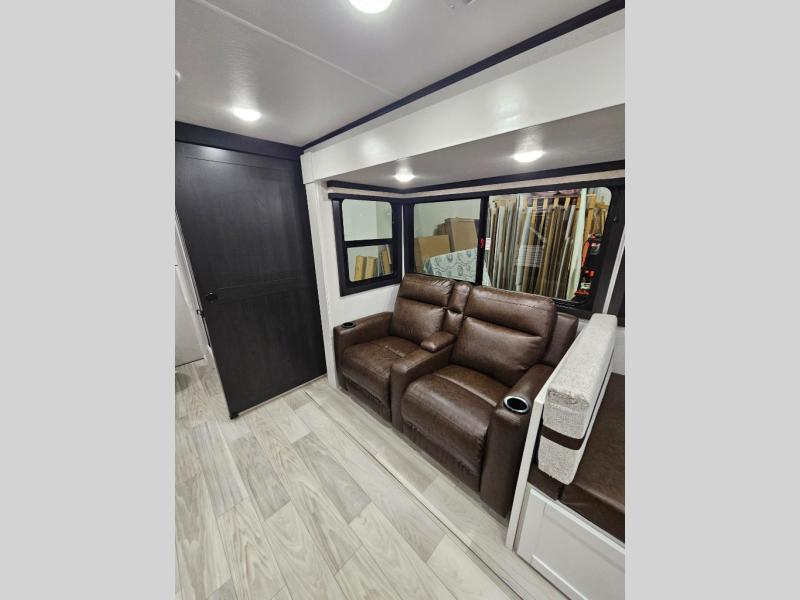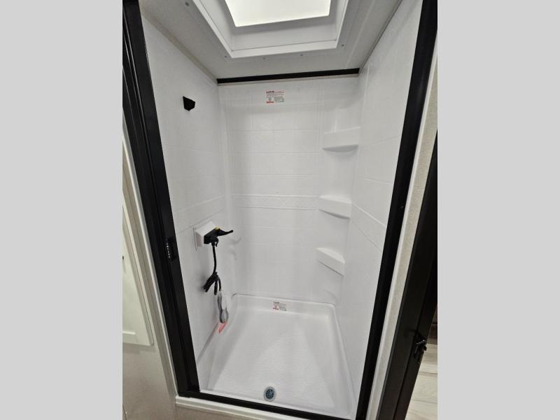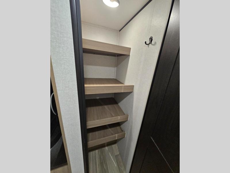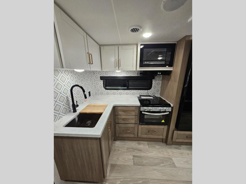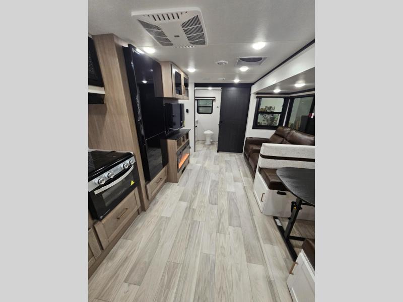 At the front of this travel trailer, you'll find a private bedroom featuring a 60" x 80" queen bed for a restful night’s sleep, in between nightstands on each side for added convenience. Moving into the center of the trailer, the main living area offers a spacious slide-out with a 60" tri-fold sofa perfect for lounging, and a 40" x 70" dinette ideal for meals, game nights, or gathering with friends and family—both of which convert into extra-sleeping space if needed. Across from the slide, the L-shaped kitchen is thoughtfully designed for ease and efficiency, featuring a stainless steel sink on one end, seamless countertop space for prepping meals, a three-burner range, and an 11 cu. ft. refrigerator for all your cooking essentials. Just beside the refrigerator is the entertainment center, with a walk-in pantry tucked behind it to store all your dry goods and snacks. At the rear, the full bathroom provides generous counter space, making it easy and comfortable to get ready each day.