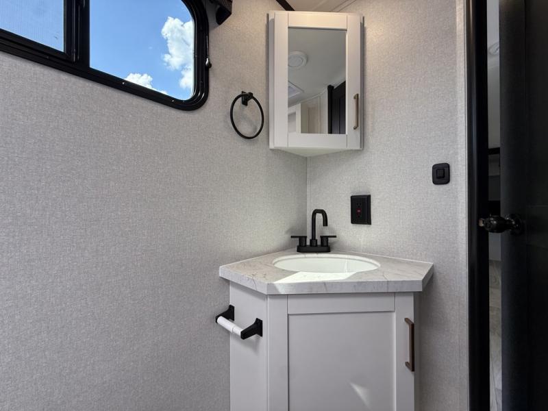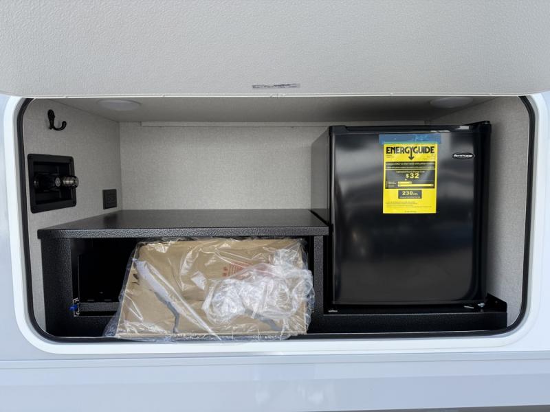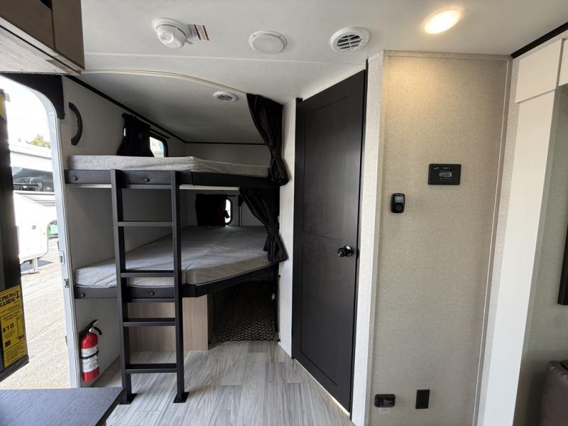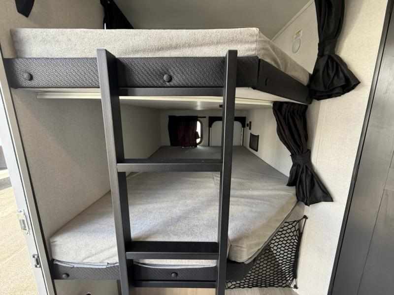 At the front of this trailer, you'll find a private bedroom featuring a 60" x 80" queen bed, complete with pull-out nightstands on each side for storing your essentials. This bedroom also includes one of the two convenient entry doors. In the center of the trailer, a spacious slide-out houses a 60" tri-fold sofa for relaxing, along with a roomy 40" x 82" U-dinette perfect for dining, game nights, or gathering with friends and family. Both the sofa and dinette convert into additional sleeping space when needed. Across from the slide is a fully equipped kitchen with a stainless-steel sink, 11 cu. ft. refrigerator, microwave, and overhead cabinets, plus a walk-in pantry offering plenty of room for snacks and dry goods. In the rear, one corner features two bunks with flip-up storage and a handy kayak door for easy gear access. The opposite corner holds a full bathroom with a 30" x 36" shower, foot-flush toilet, and corner sink. Just next the bunks is the second entry door, adding extra convenience for busy camping days.