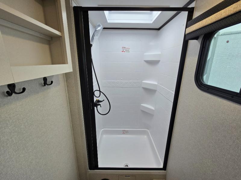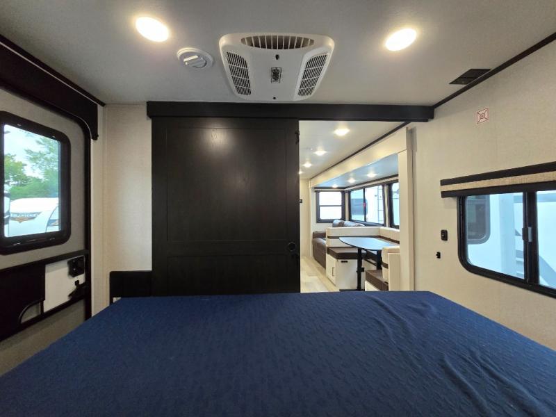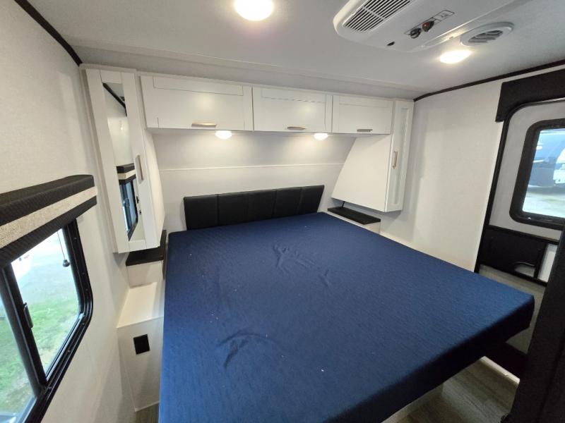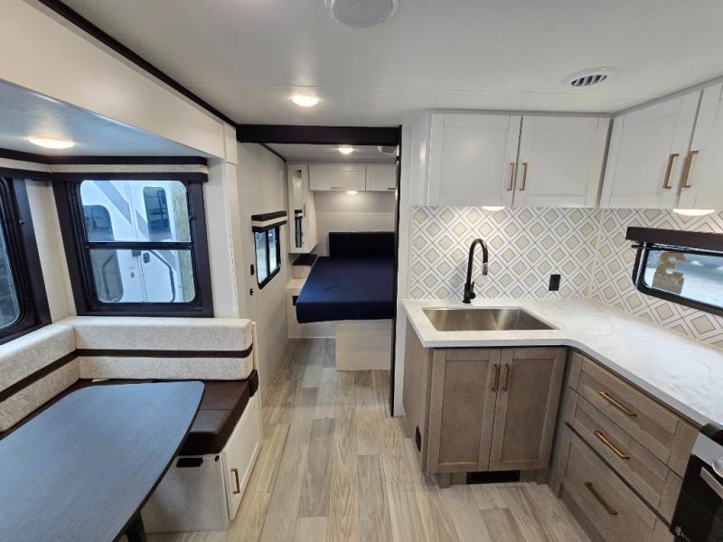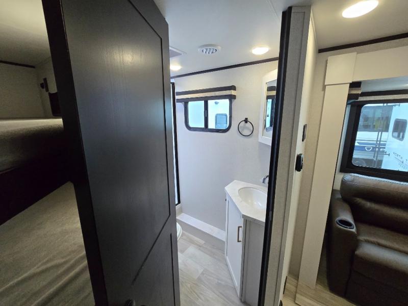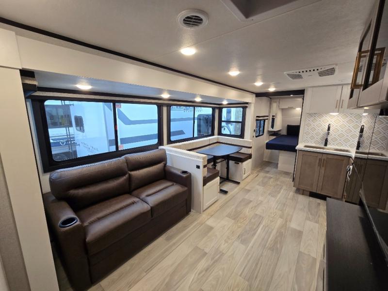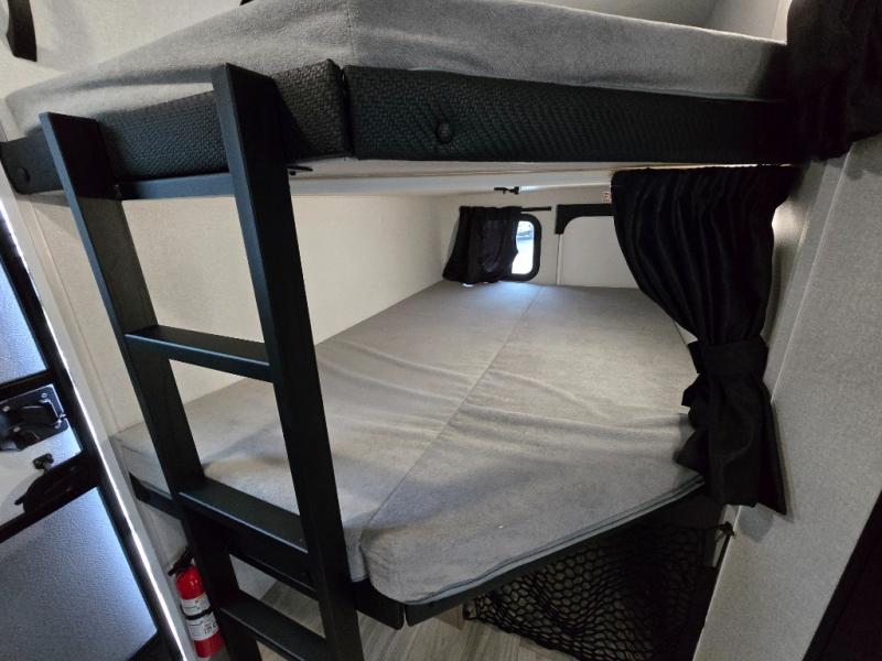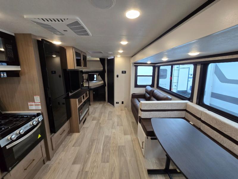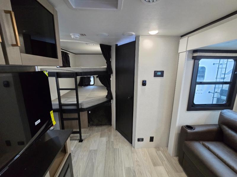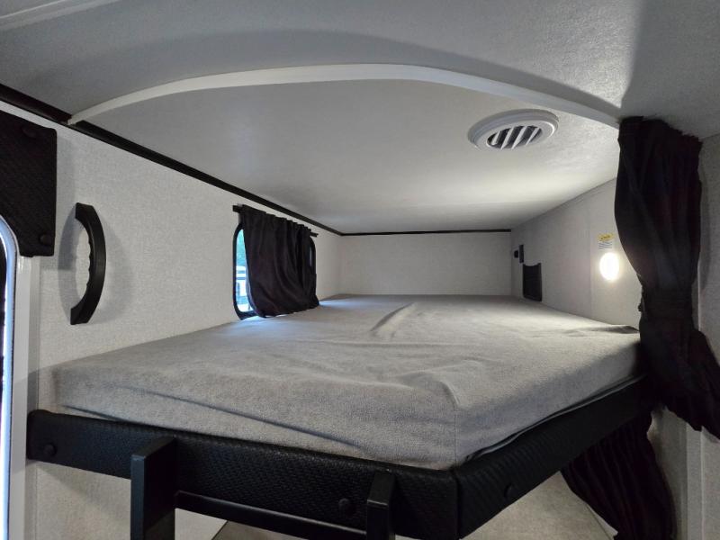 At the front of this trailer, you'll find a private bedroom featuring a 60" x 80" queen bed, complete with pull-out nightstands on each side for storing your essentials. This bedroom also includes one of the two convenient entry doors. In the center of the trailer, a spacious slide-out houses a 60" tri-fold sofa for relaxing, along with a roomy 40" x 82" U-dinette perfect for dining, game nights, or gathering with friends and family. Both the sofa and dinette convert into additional sleeping space when needed. Across from the slide is a fully equipped kitchen with a stainless-steel sink, 11 cu. ft. refrigerator, microwave, and overhead cabinets, plus a walk-in pantry offering plenty of room for snacks and dry goods. In the rear, one corner features two bunks with flip-up storage and a handy kayak door for easy gear access. The opposite corner holds a full bathroom with a 30" x 36" shower, foot-flush toilet, and corner sink. Just next the bunks is the second entry door, adding extra convenience for busy camping days.