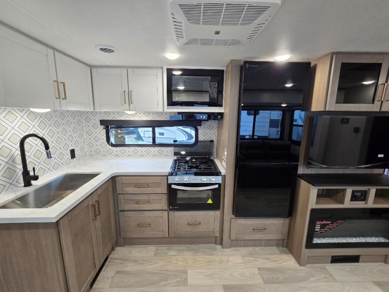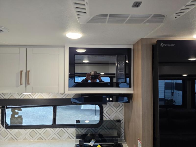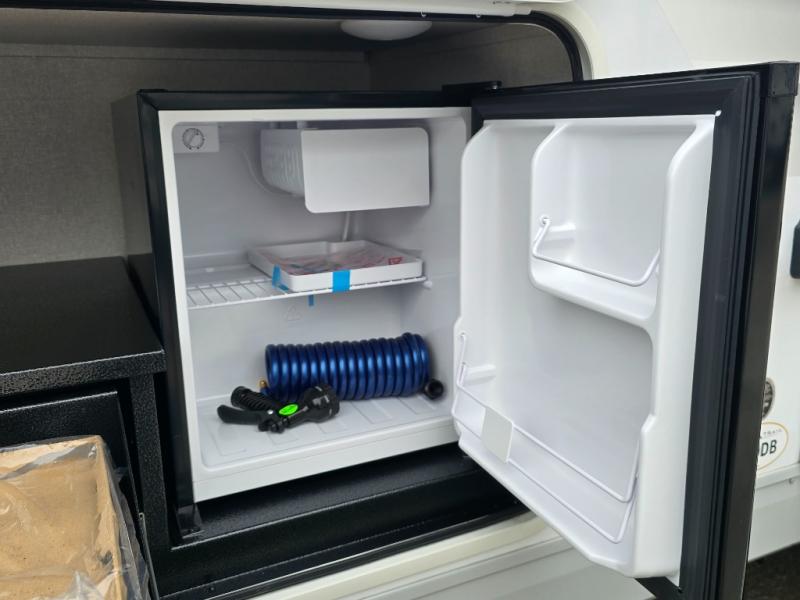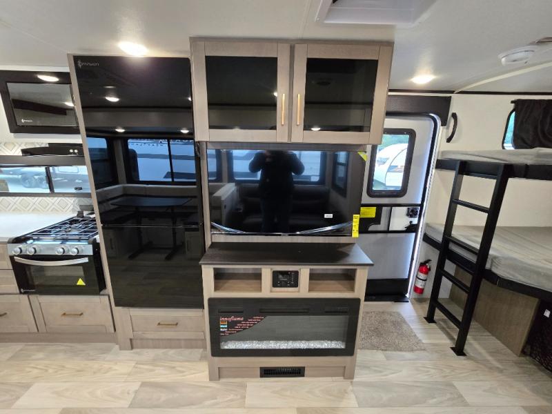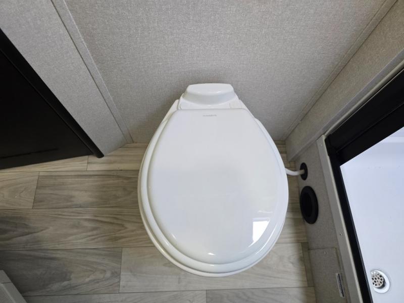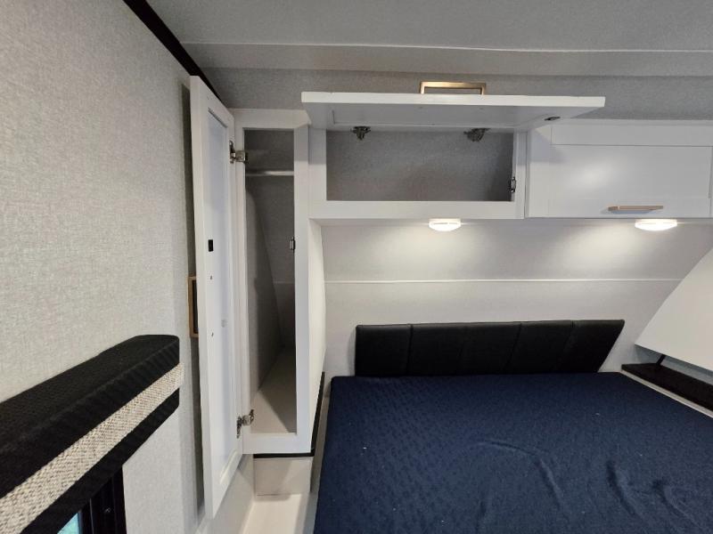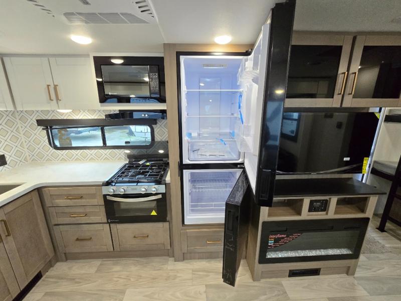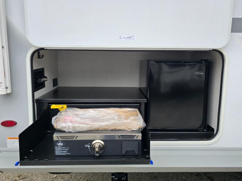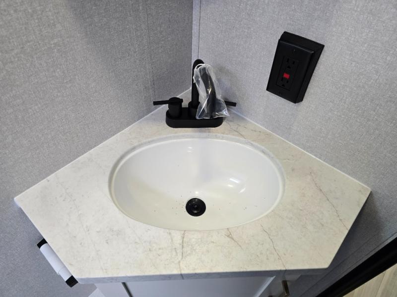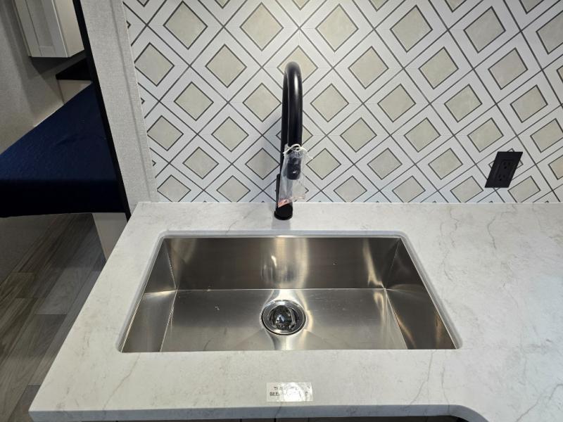 At the front of this trailer, you'll find a private bedroom featuring a 60" x 80" queen bed, complete with pull-out nightstands on each side for storing your essentials. This bedroom also includes one of the two convenient entry doors. In the center of the trailer, a spacious slide-out houses a 60" tri-fold sofa for relaxing, along with a roomy 40" x 82" U-dinette perfect for dining, game nights, or gathering with friends and family. Both the sofa and dinette convert into additional sleeping space when needed. Across from the slide is a fully equipped kitchen with a stainless-steel sink, 11 cu. ft. refrigerator, microwave, and overhead cabinets, plus a walk-in pantry offering plenty of room for snacks and dry goods. In the rear, one corner features two bunks with flip-up storage and a handy kayak door for easy gear access. The opposite corner holds a full bathroom with a 30" x 36" shower, foot-flush toilet, and corner sink. Just next the bunks is the second entry door, adding extra convenience for busy camping days.