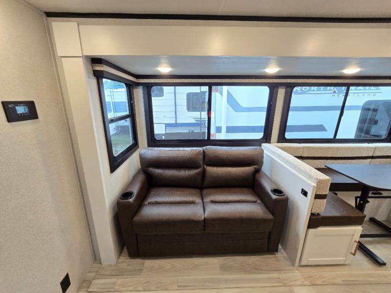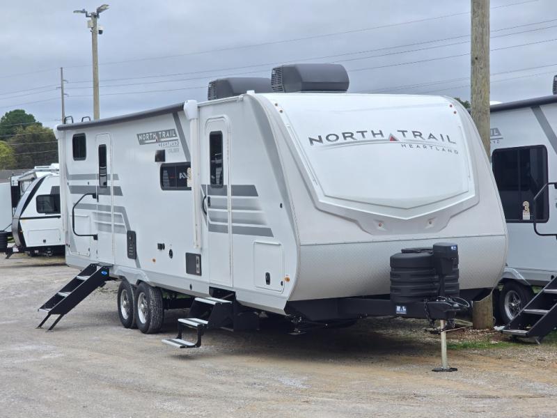 Built for comfort, durability, and modern convenience, these Heartland North Trail travel trailers offer everything you need for a premium camping experience. Each model features a strong American-made Norco Z-frame with an aerodynamic front profile and front diamond plating for added protection. The exclusive TrusstXL Roof System and CoreShield vacuum-bonded walls with Azdel provide superior insulation. Inside, enjoy residential comforts like seamless countertops, solid hardwood maple cabinet doors, LED lighting throughout, and 60 x 80 in. queen beds or 60 x 76 in. Murphy beds. Tech-ready features include an LED smart TV, USB ports, TPMS monitoring, and a 200W solar panel with 30 AMP digital controller. With a Quiet Series A/C, on-demand 60K BTU water heater, with these trailers you are equipped to make every trip comfortable and adventure-ready.