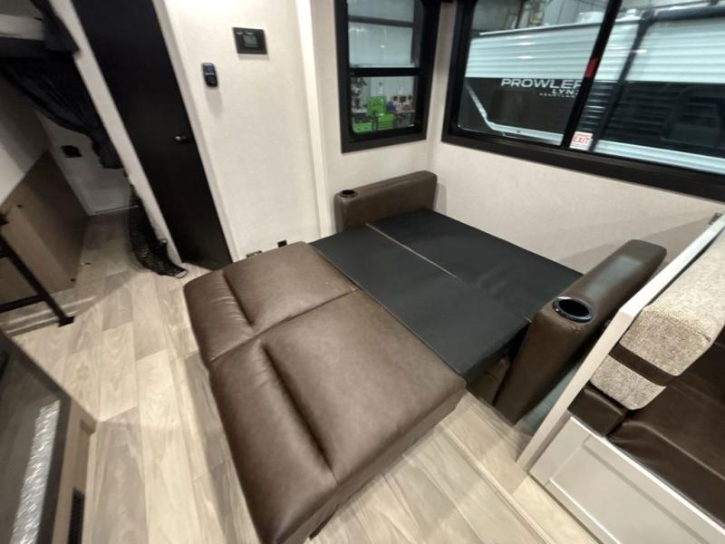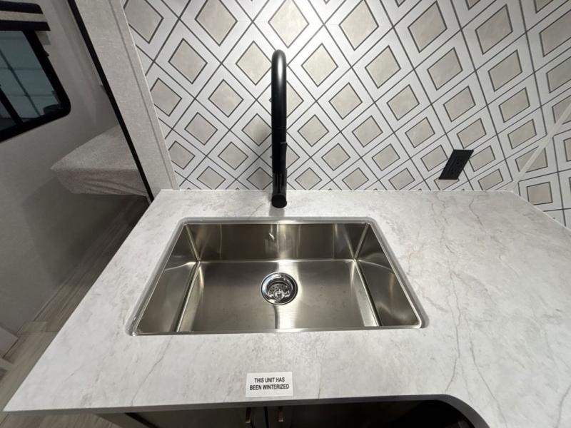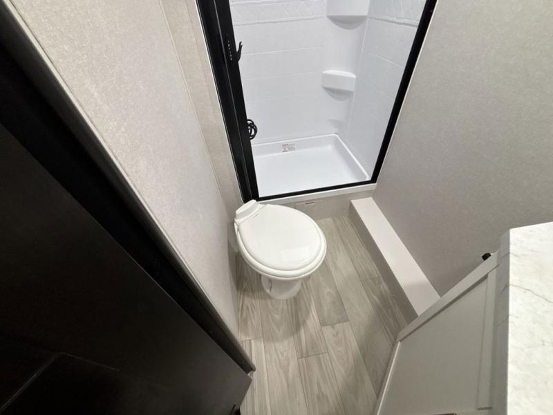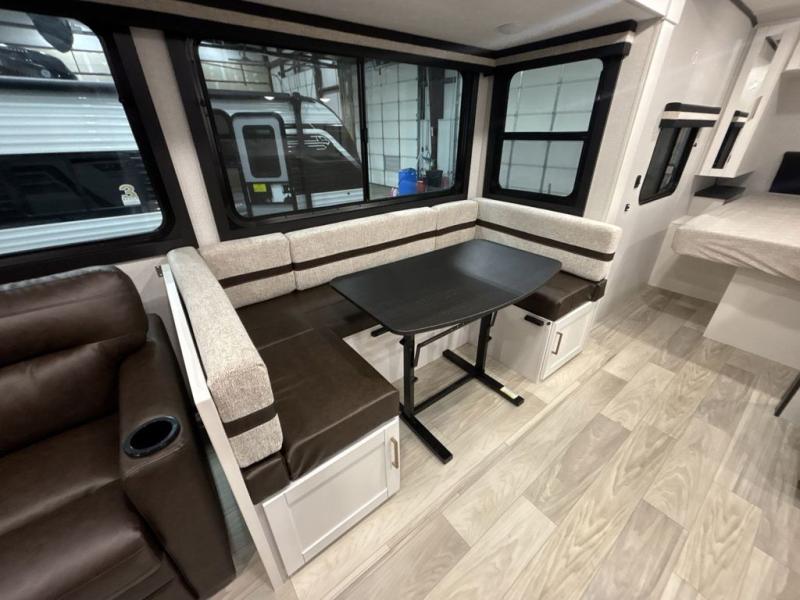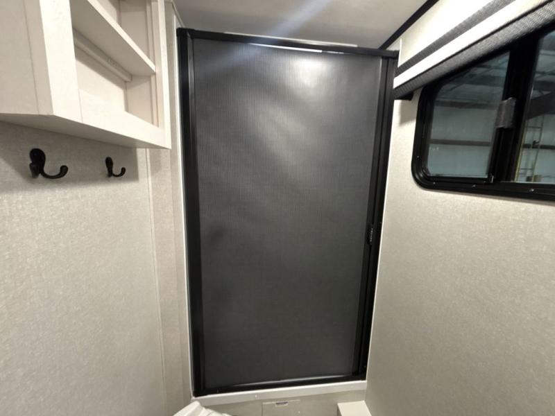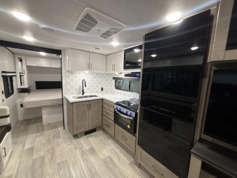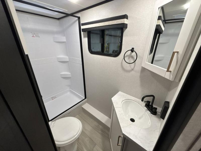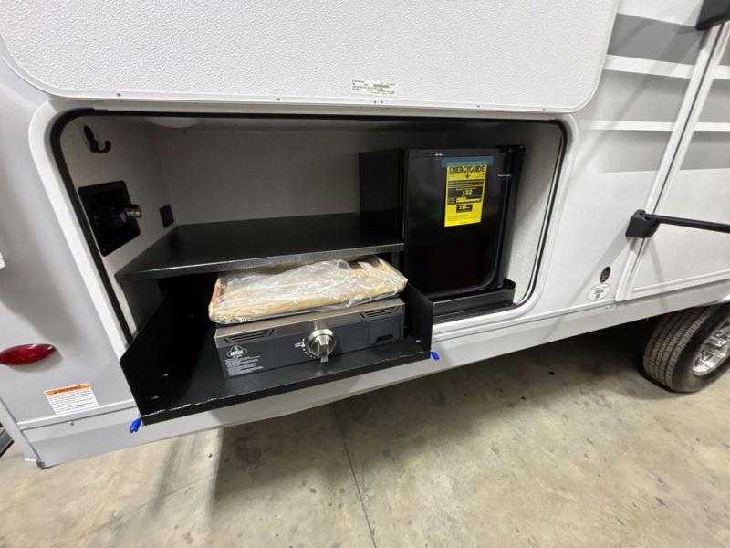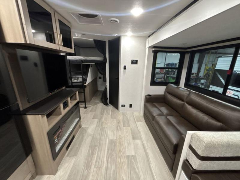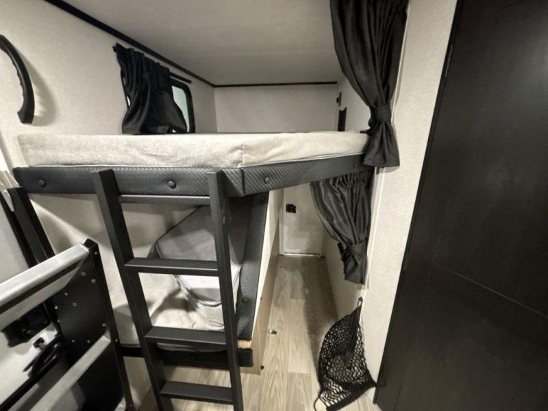 At the front of this trailer, you'll find a private bedroom featuring a 60" x 80" queen bed, complete with pull-out nightstands on each side for storing your essentials. This bedroom also includes one of the two convenient entry doors. In the center of the trailer, a spacious slide-out houses a 60" tri-fold sofa for relaxing, along with a roomy 40" x 82" U-dinette perfect for dining, game nights, or gathering with friends and family. Both the sofa and dinette convert into additional sleeping space when needed. Across from the slide is a fully equipped kitchen with a stainless-steel sink, 11 cu. ft. refrigerator, microwave, and overhead cabinets, plus a walk-in pantry offering plenty of room for snacks and dry goods. In the rear, one corner features two bunks with flip-up storage and a handy kayak door for easy gear access. The opposite corner holds a full bathroom with a 30" x 36" shower, foot-flush toilet, and corner sink. Just next the bunks is the second entry door, adding extra convenience for busy camping days.