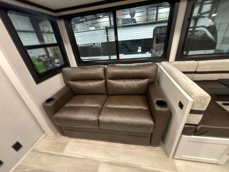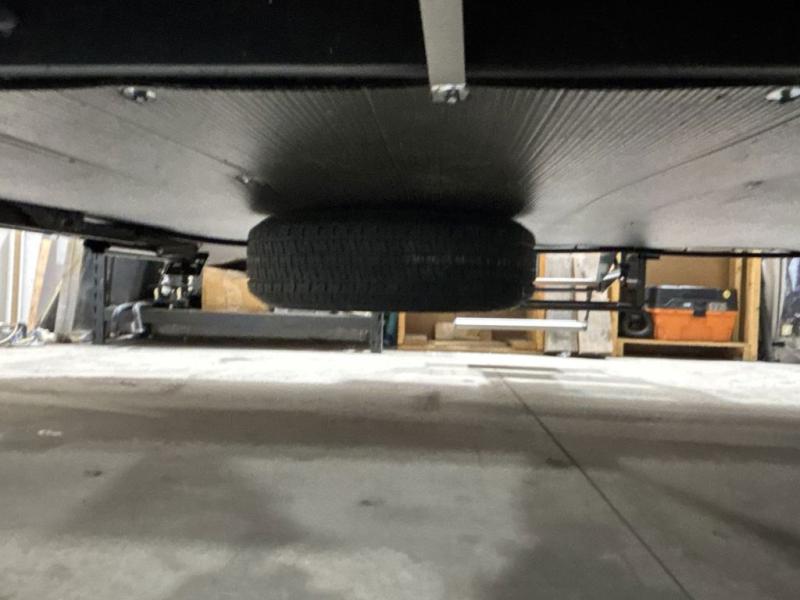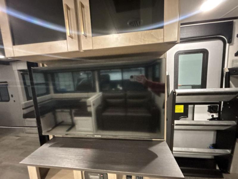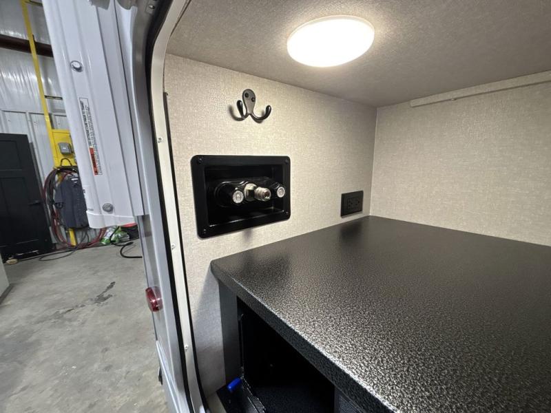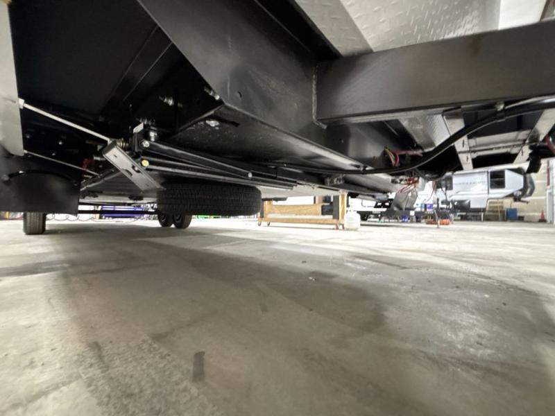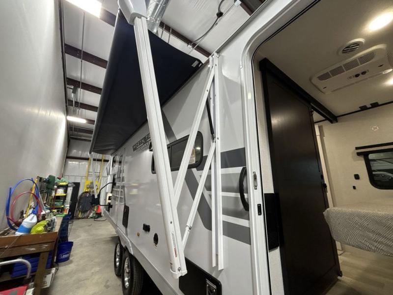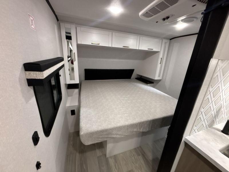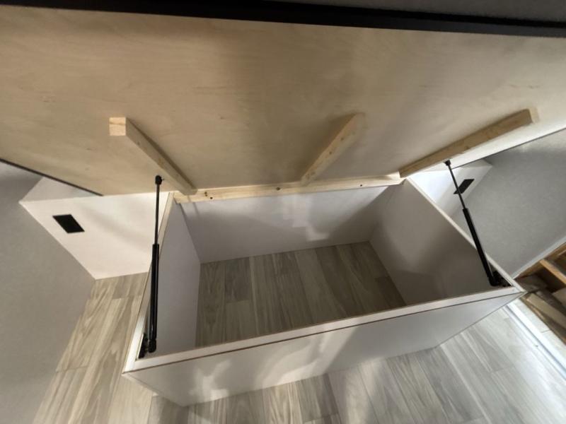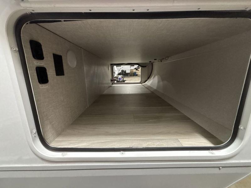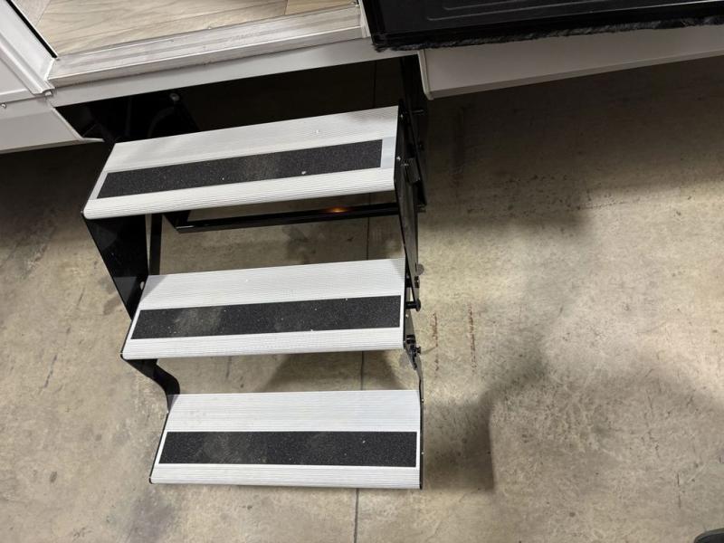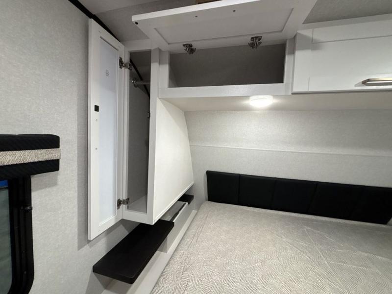 At the front of this trailer, you'll find a private bedroom featuring a 60" x 80" queen bed, complete with pull-out nightstands on each side for storing your essentials. This bedroom also includes one of the two convenient entry doors. In the center of the trailer, a spacious slide-out houses a 60" tri-fold sofa for relaxing, along with a roomy 40" x 82" U-dinette perfect for dining, game nights, or gathering with friends and family. Both the sofa and dinette convert into additional sleeping space when needed. Across from the slide is a fully equipped kitchen with a stainless-steel sink, 11 cu. ft. refrigerator, microwave, and overhead cabinets, plus a walk-in pantry offering plenty of room for snacks and dry goods. In the rear, one corner features two bunks with flip-up storage and a handy kayak door for easy gear access. The opposite corner holds a full bathroom with a 30" x 36" shower, foot-flush toilet, and corner sink. Just next the bunks is the second entry door, adding extra convenience for busy camping days.