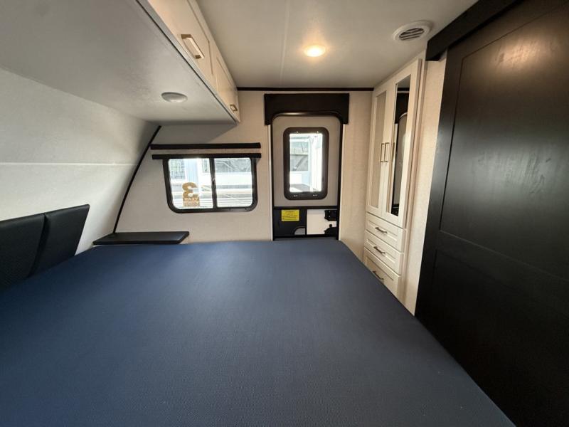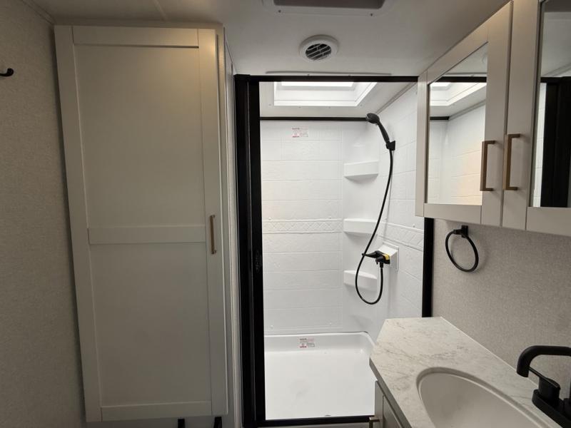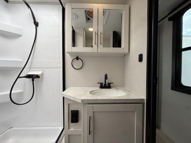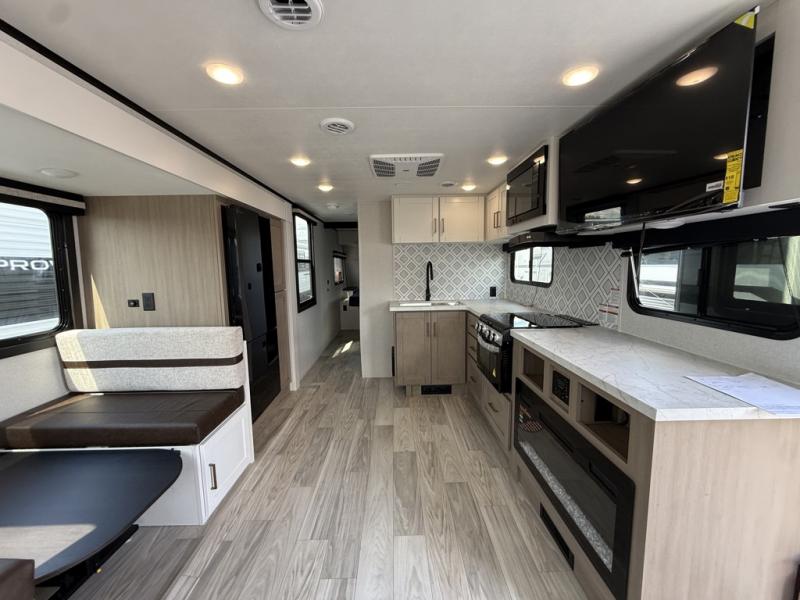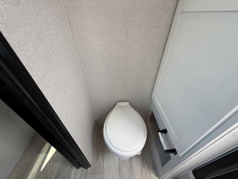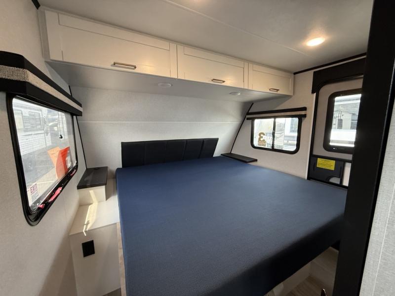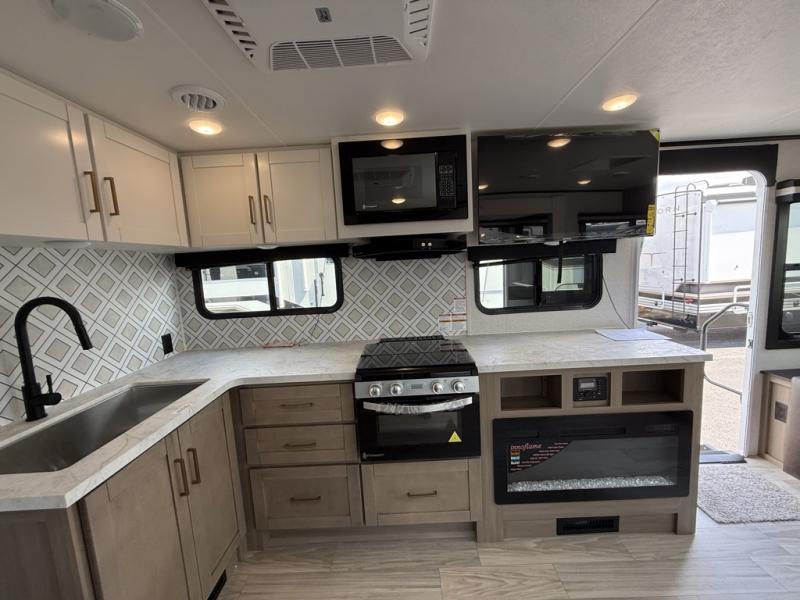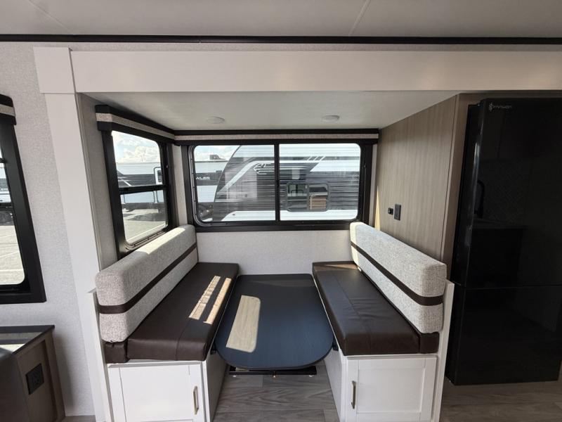 At the front of this trailer, the private bedroom features a 60" x 80" queen bed with nightstands on each side, perfect for storing your essentials, and includes one of the two convenient entry doors. Just down the hall, the full bathroom offers a 30" x 36" shower, a foot-flush toilet, and a linen closet to keep towels and toiletries organized. In the center, a large slide-out provides spacious seating with a 40" x 70" dinette ideal for meals, game nights, or gathering with family alongside an 11 cu. ft. refrigerator and pantry for storing all your food and snacks. At the rear, you'll find a roomy 75" theater seat with end tables on both sides, offering a perfect place to relax. Across from the dinette, the fully equipped kitchen includes a stainless-steel sink, microwave, and overhead cabinets for added storage. The second entry door is also located here, offering easy access to the living area and kitchen.