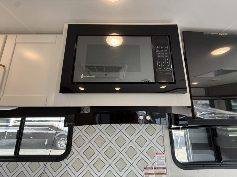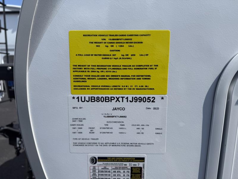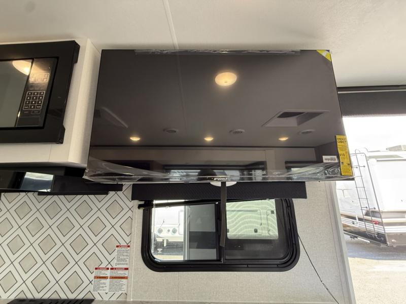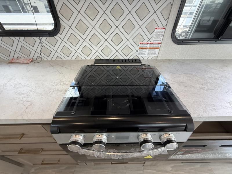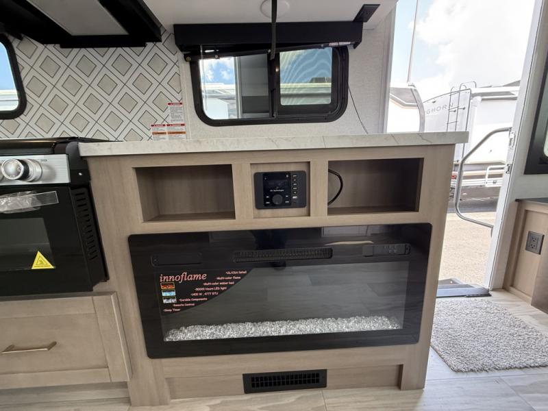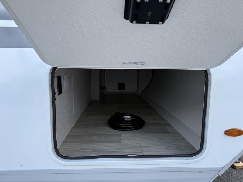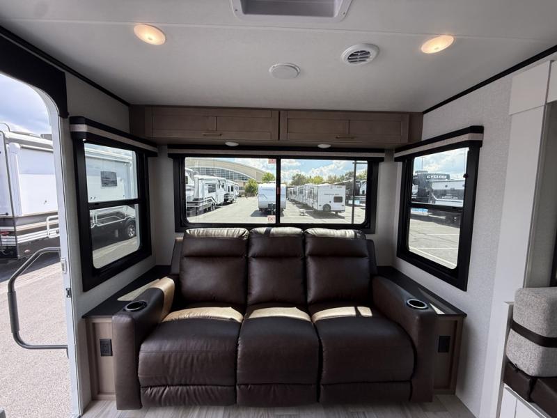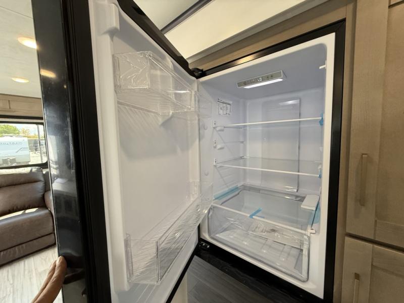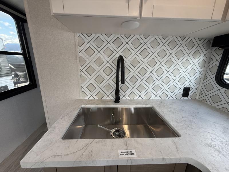 At the front of this trailer, the private bedroom features a 60" x 80" queen bed with nightstands on each side, perfect for storing your essentials, and includes one of the two convenient entry doors. Just down the hall, the full bathroom offers a 30" x 36" shower, a foot-flush toilet, and a linen closet to keep towels and toiletries organized. In the center, a large slide-out provides spacious seating with a 40" x 70" dinette ideal for meals, game nights, or gathering with family alongside an 11 cu. ft. refrigerator and pantry for storing all your food and snacks. At the rear, you'll find a roomy 75" theater seat with end tables on both sides, offering a perfect place to relax. Across from the dinette, the fully equipped kitchen includes a stainless-steel sink, microwave, and overhead cabinets for added storage. The second entry door is also located here, offering easy access to the living area and kitchen.