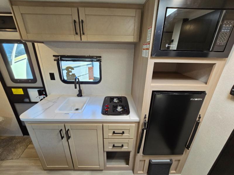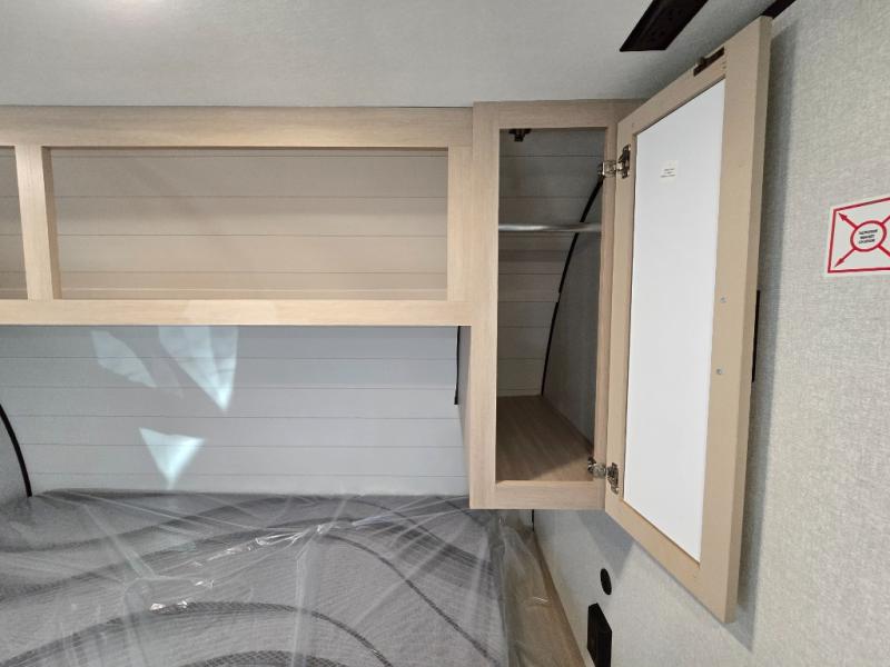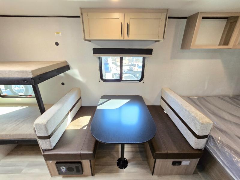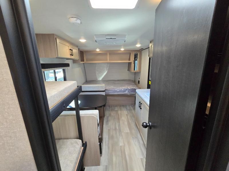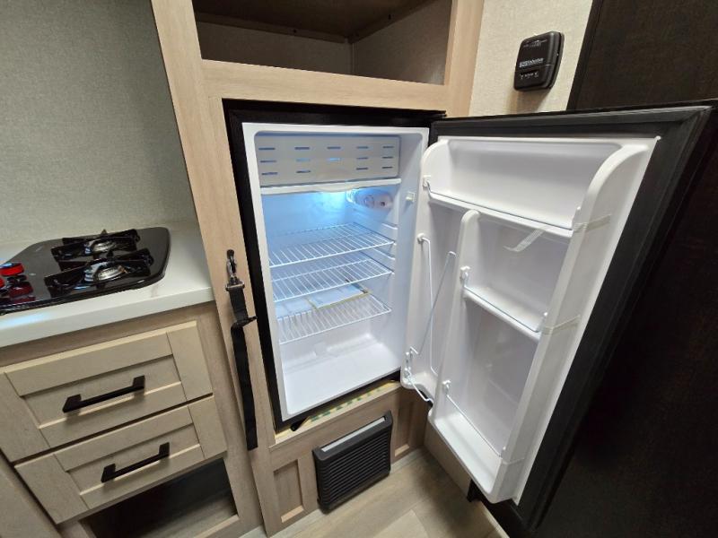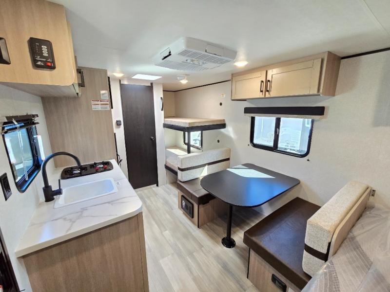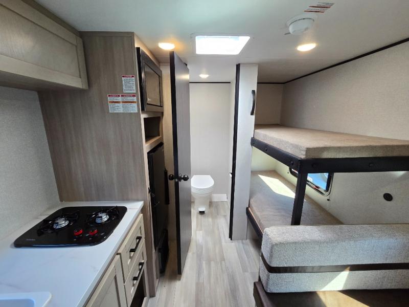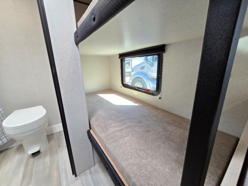 Camping trips are made easy in this Lynx Edition travel trailer with bunk beds for guests or little ones. You'll find the front queen bed for a great night's rest, along with a nightstand and wardrobe to keep your things tidy. The rear corner private bath includes a foot-flush toilet and a 24" x 36" shower, so you won't have to leave the camper in the middle of the night. A two-burner cooktop and microwave oven will let you make meals each day, and a 12V refrigerator will keep your food fresh!