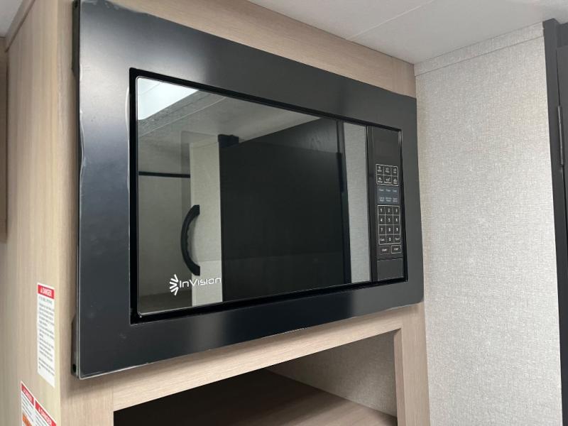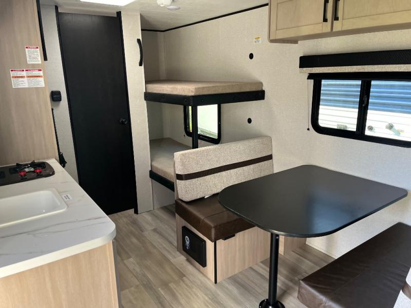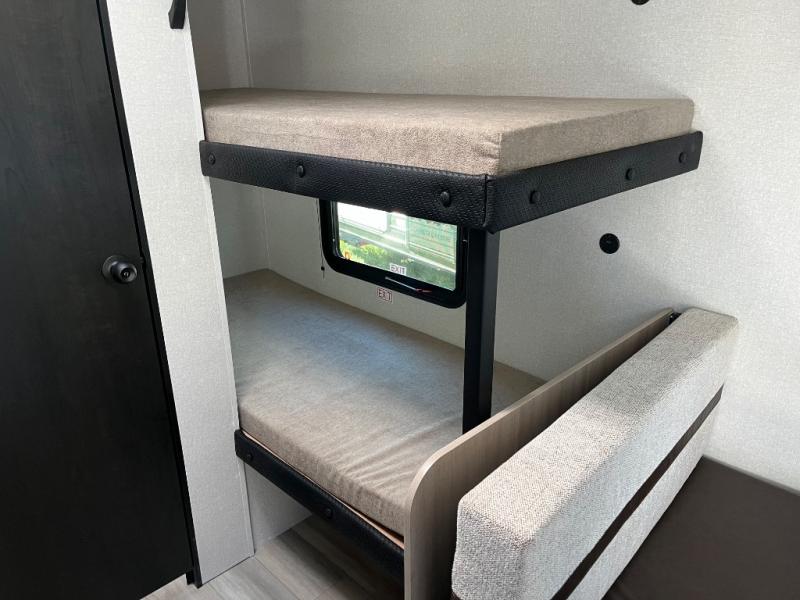 Camping trips are made easy in this Lynx Edition travel trailer with bunk beds for guests or little ones. You'll find the front queen bed for a great night's rest, along with a nightstand and wardrobe to keep your things tidy. The rear corner private bath includes a foot-flush toilet and a 24" x 36" shower, so you won't have to leave the camper in the middle of the night. A two-burner cooktop and microwave oven will let you make meals each day, and a 12V refrigerator will keep your food fresh!
