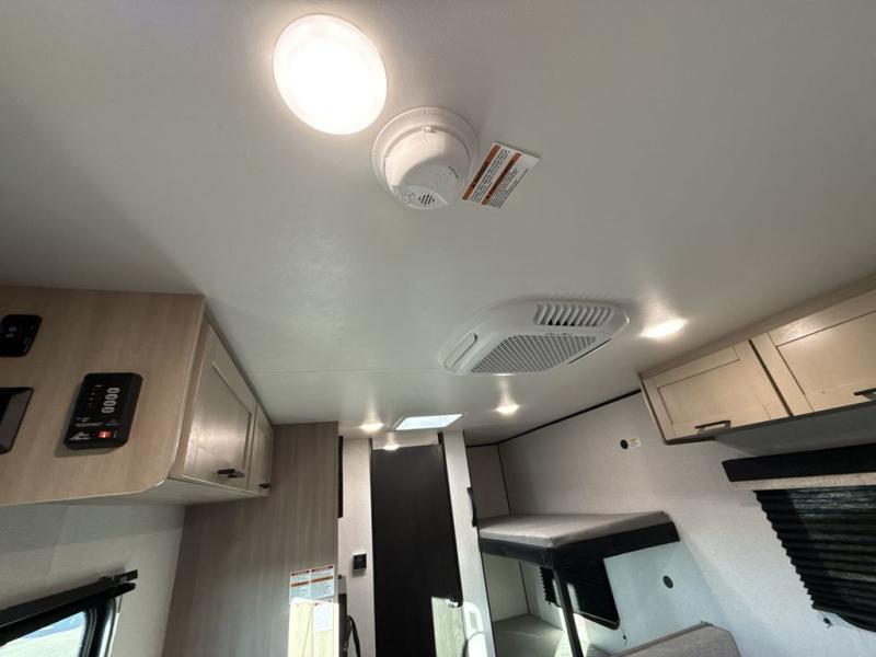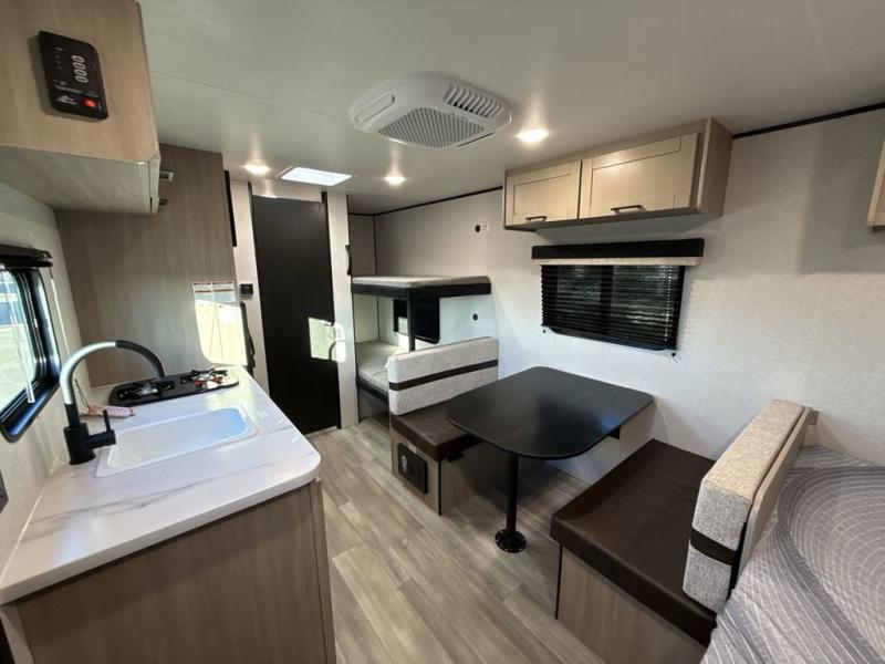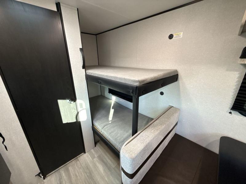 Camping trips are made easy in this Lynx Edition travel trailer with bunk beds for guests or little ones. You'll find the front queen bed for a great night's rest, along with a nightstand and wardrobe to keep your things tidy. The rear corner private bath includes a foot-flush toilet and a 24" x 36" shower, so you won't have to leave the camper in the middle of the night. A two-burner cooktop and microwave oven will let you make meals each day, and a 12V refrigerator will keep your food fresh!