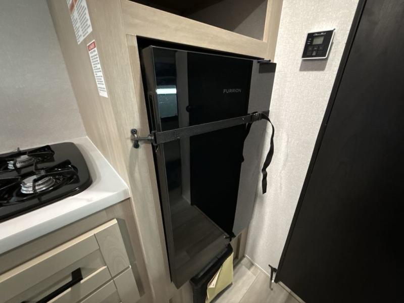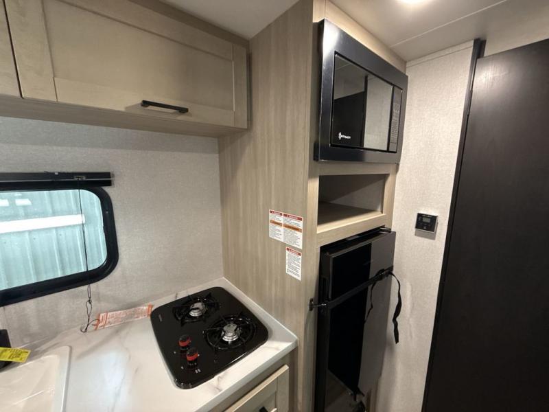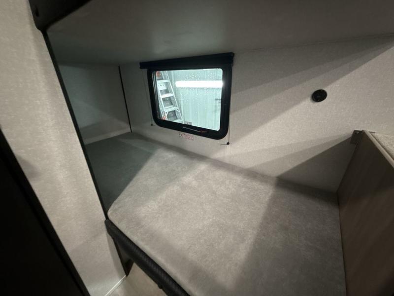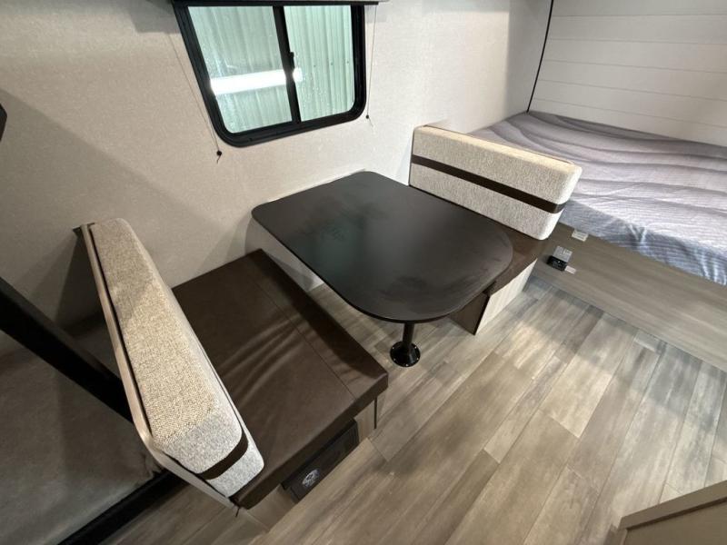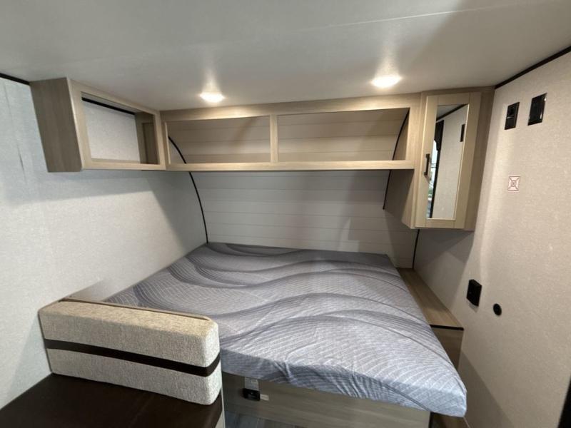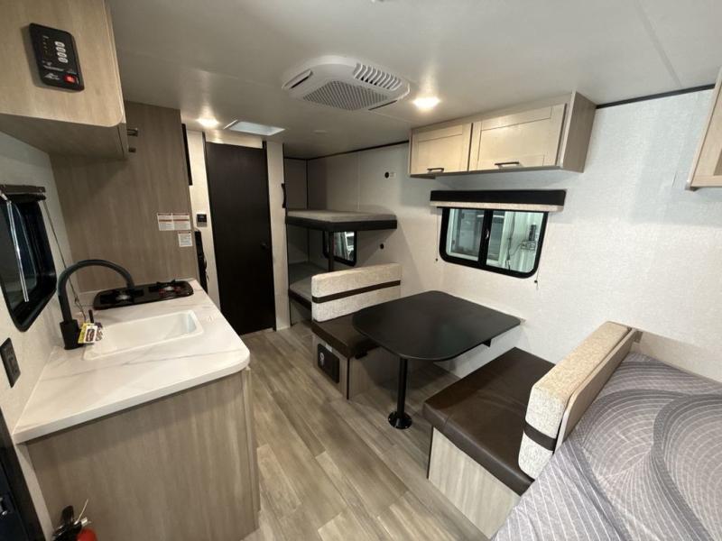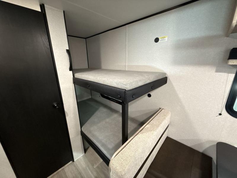 Camping trips are made easy in this Lynx Edition travel trailer with bunk beds for guests or little ones. You'll find the front queen bed for a great night's rest, along with a nightstand and wardrobe to keep your things tidy. The rear corner private bath includes a foot-flush toilet and a 24" x 36" shower, so you won't have to leave the camper in the middle of the night. A two-burner cooktop and microwave oven will let you make meals each day, and a 12V refrigerator will keep your food fresh!