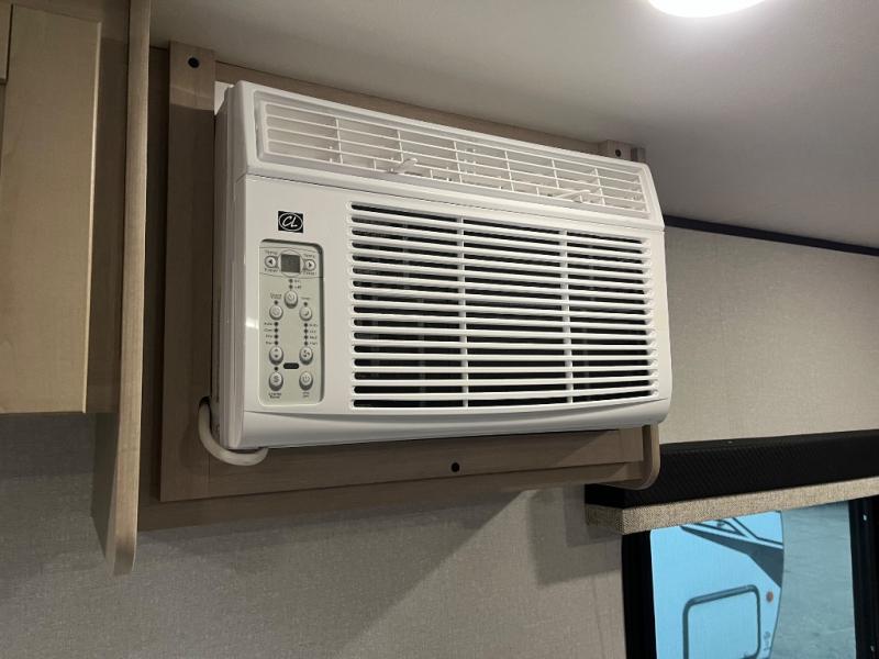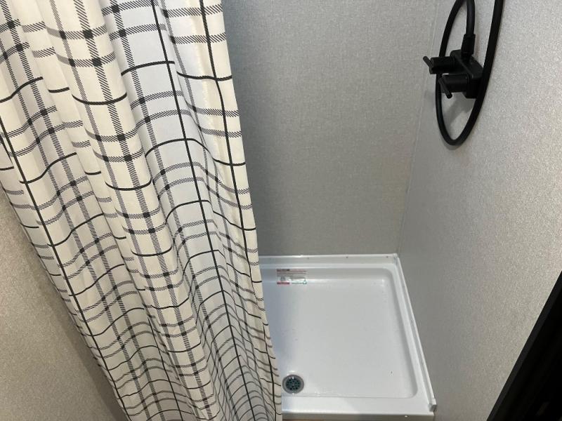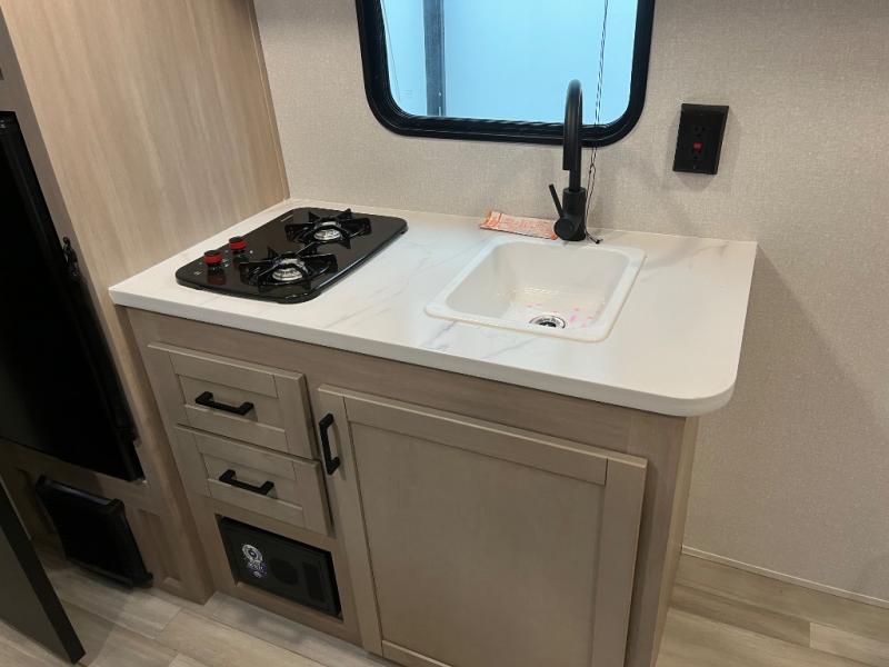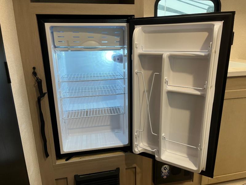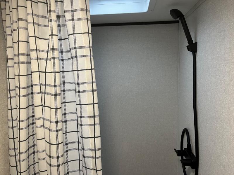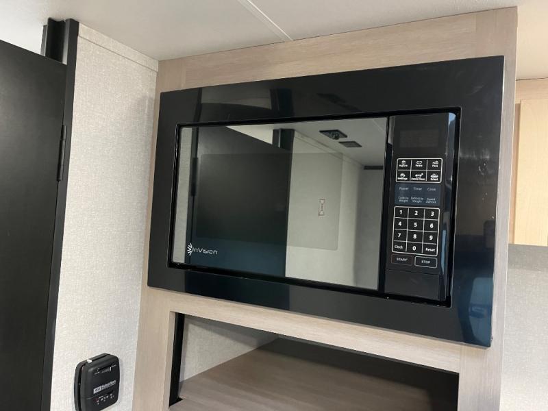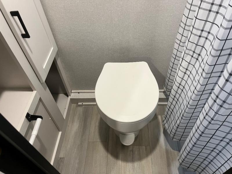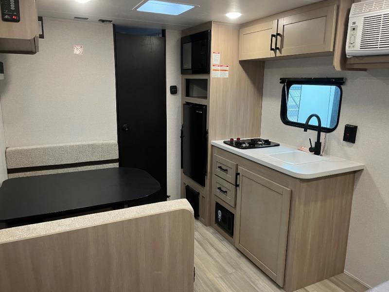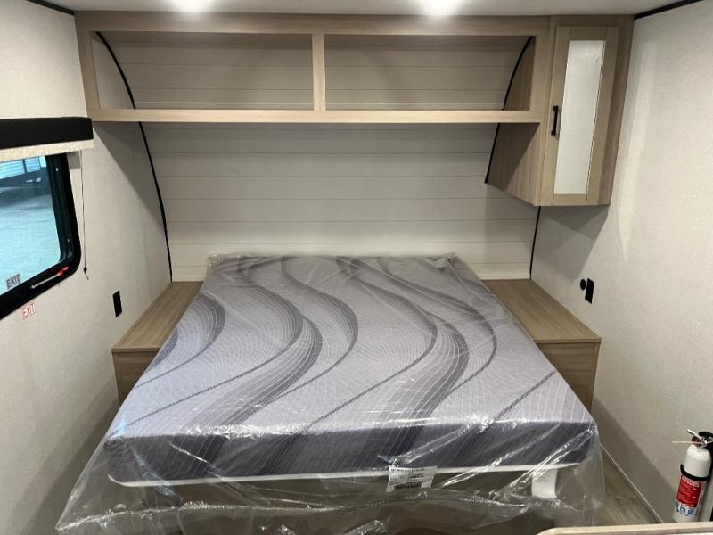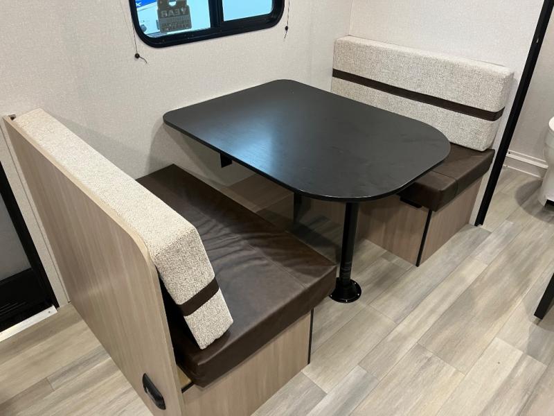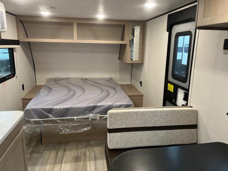 This travel trailer provides you with a little more privacy thanks to the rear bath, which also includes a bath linen closet and shelves for extra storage. The front bedroom includes a walk-around RV queen bed to make it easier to make the bed, and you'll find an overhead shelf for books or games. Once you've made lunch on the two-burner cooktop or in the microwave oven, you can dine at the booth dinette or take your plate outdoors to sit under the 10' power awning.