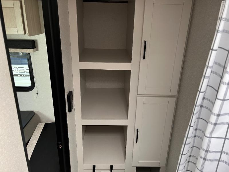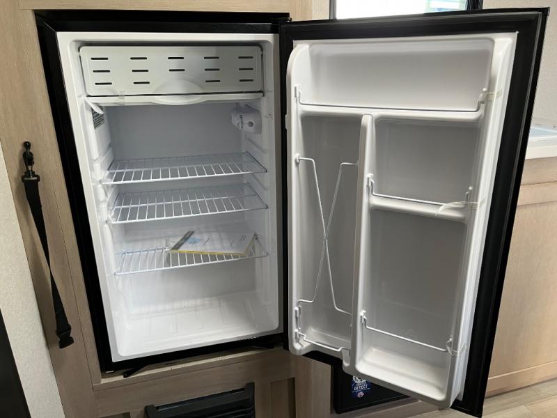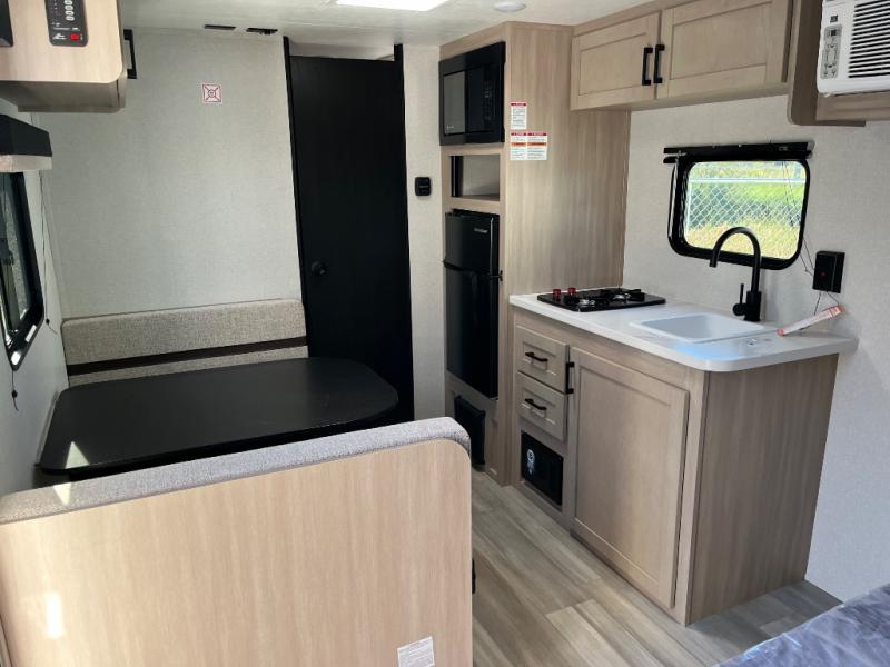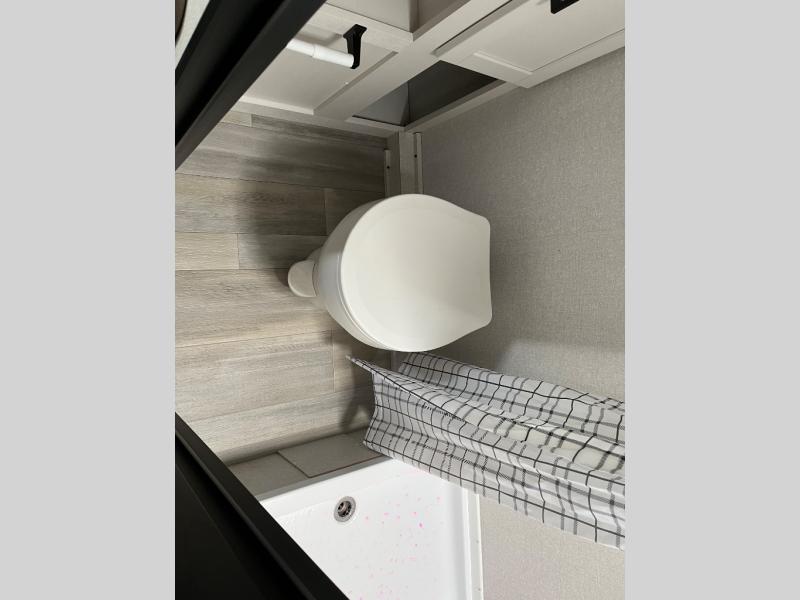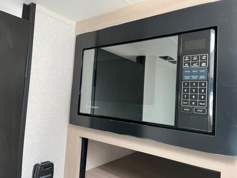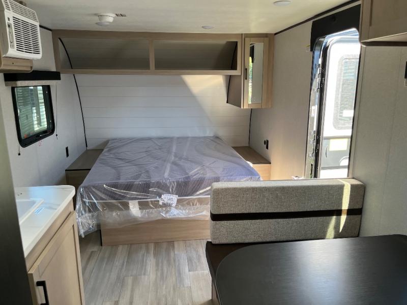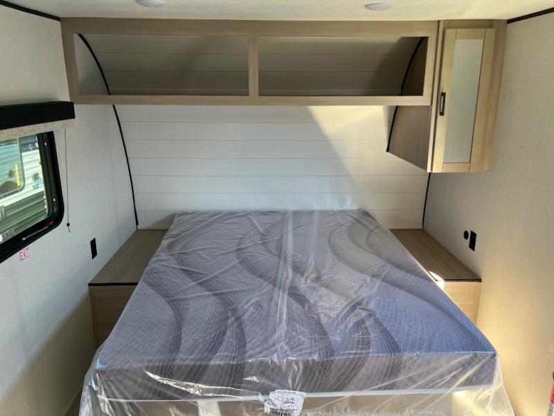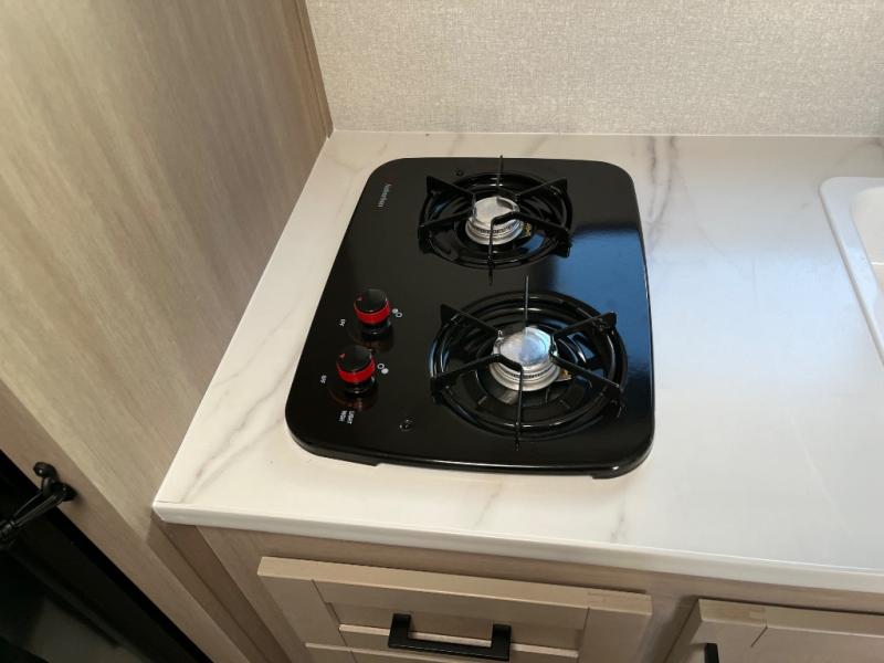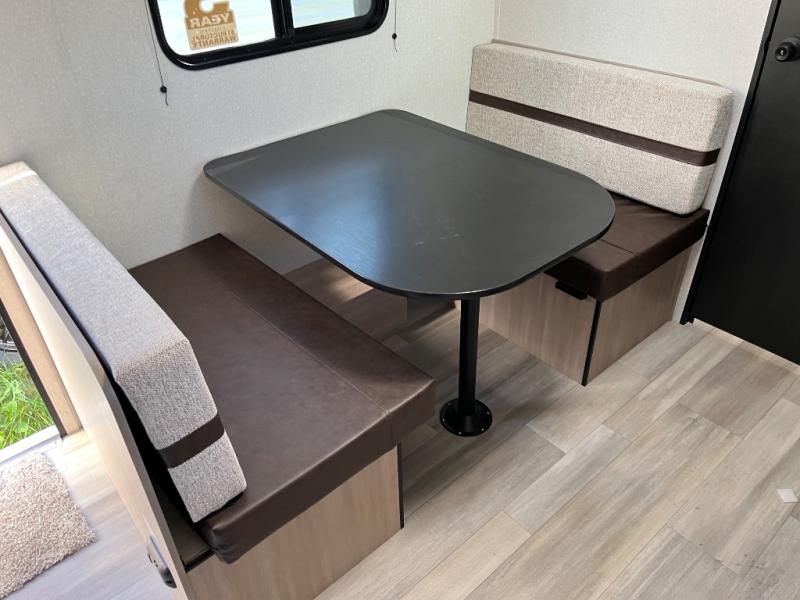 This travel trailer provides you with a little more privacy thanks to the rear bath, which also includes a bath linen closet and shelves for extra storage. The front bedroom includes a walk-around RV queen bed to make it easier to make the bed, and you'll find an overhead shelf for books or games. Once you've made lunch on the two-burner cooktop or in the microwave oven, you can dine at the booth dinette or take your plate outdoors to sit under the 10' power awning.