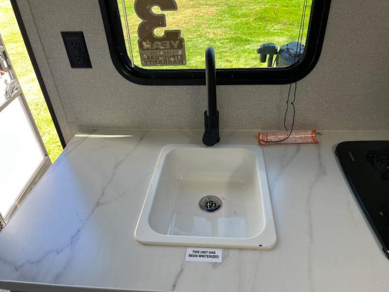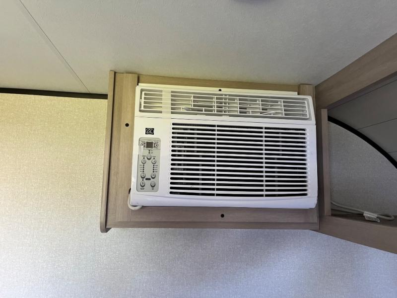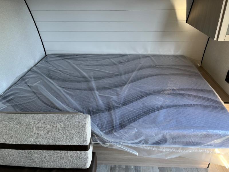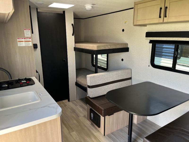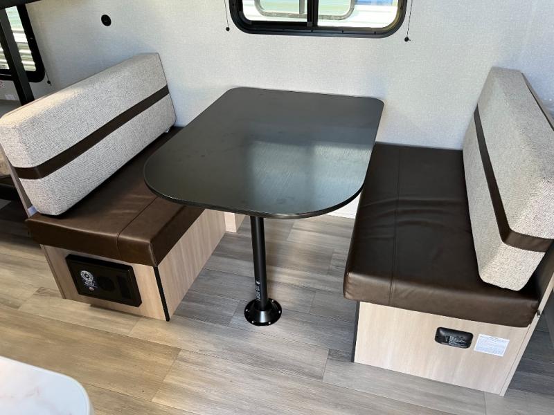 This travel trailer provides you with a little more privacy thanks to the rear bath, which also includes a bath linen closet and shelves for extra storage. The front bedroom includes a walk-around RV queen bed to make it easier to make the bed, and you'll find an overhead shelf for books or games. Once you've made lunch on the two-burner cooktop or in the microwave oven, you can dine at the booth dinette or take your plate outdoors to sit under the 10' power awning.