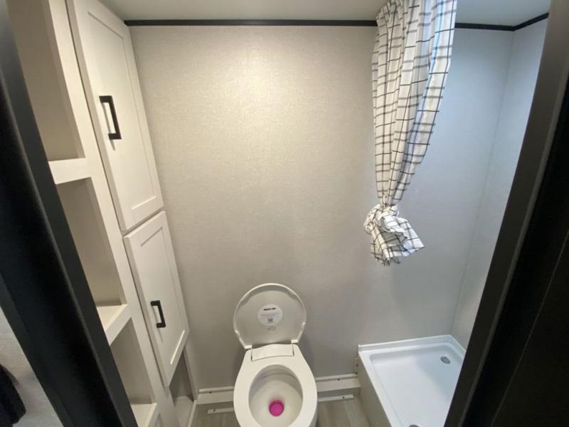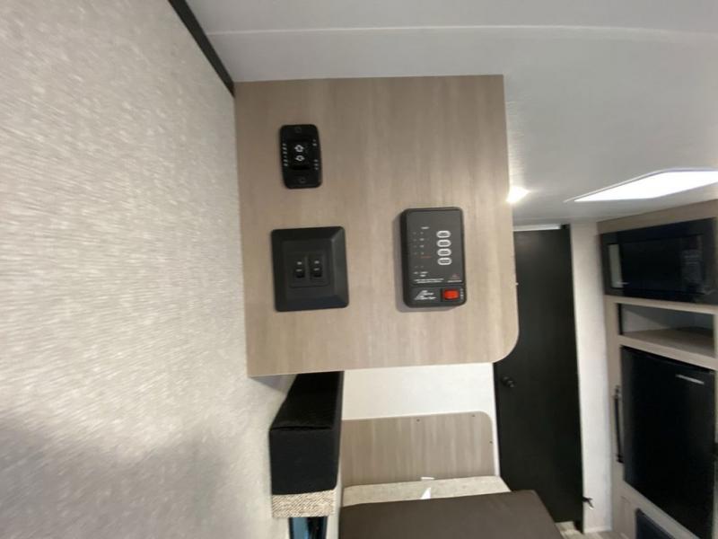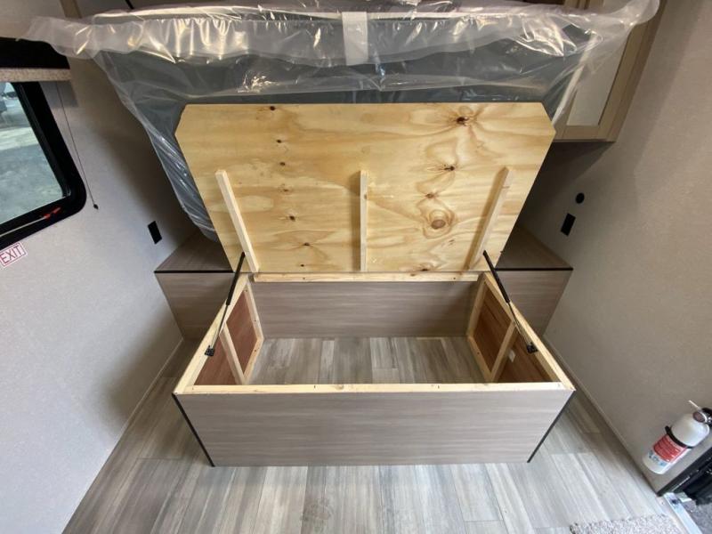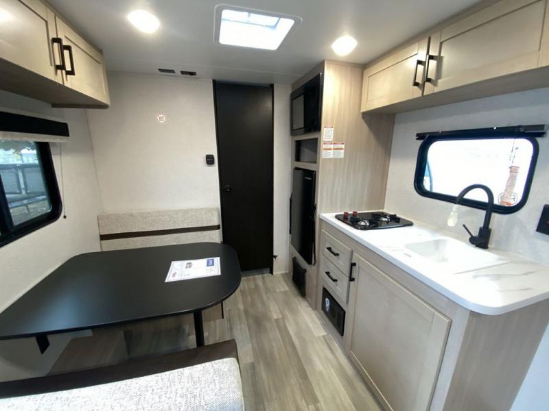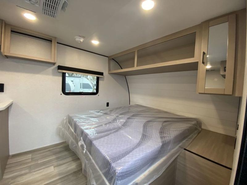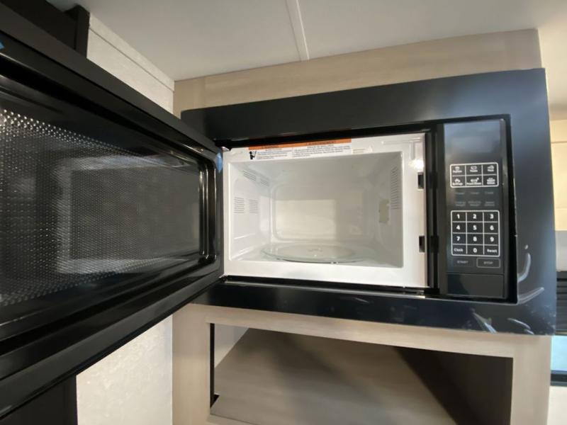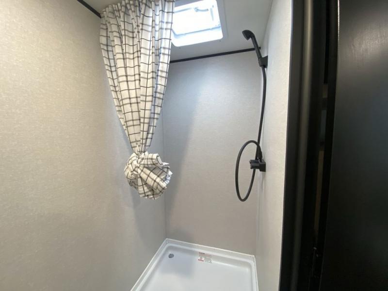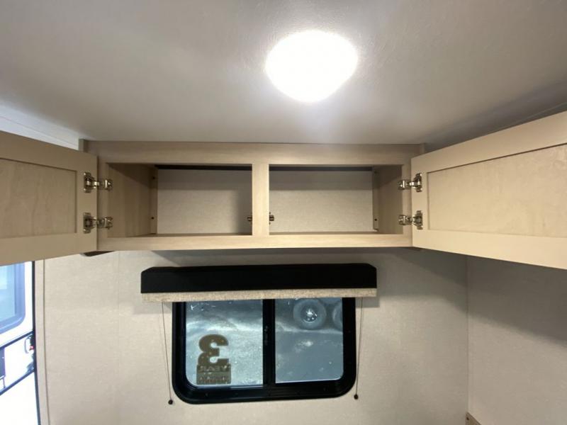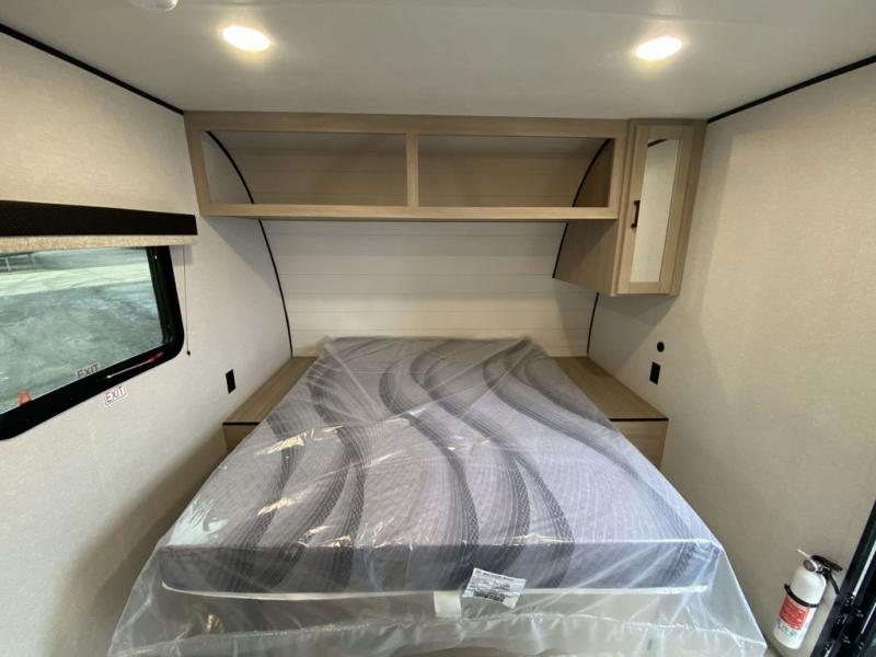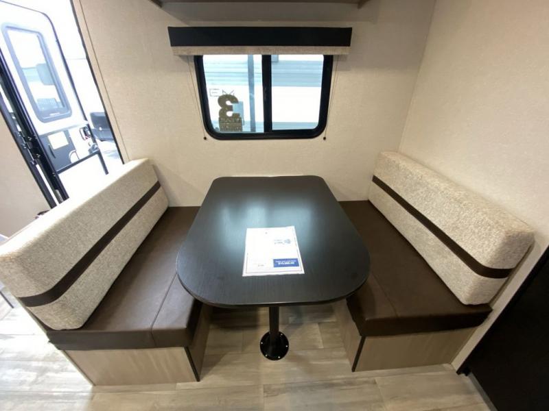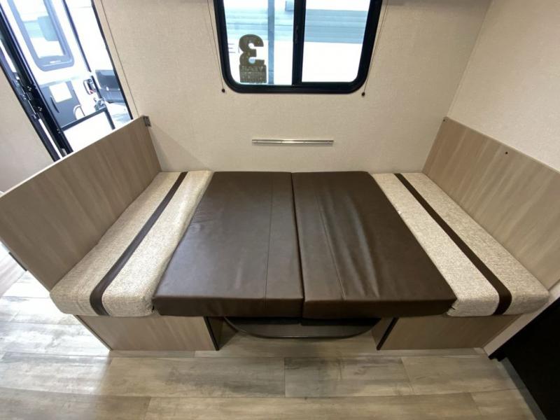 This travel trailer provides you with a little more privacy thanks to the rear bath, which also includes a bath linen closet and shelves for extra storage. The front bedroom includes a walk-around RV queen bed to make it easier to make the bed, and you'll find an overhead shelf for books or games. Once you've made lunch on the two-burner cooktop or in the microwave oven, you can dine at the booth dinette or take your plate outdoors to sit under the 10' power awning.