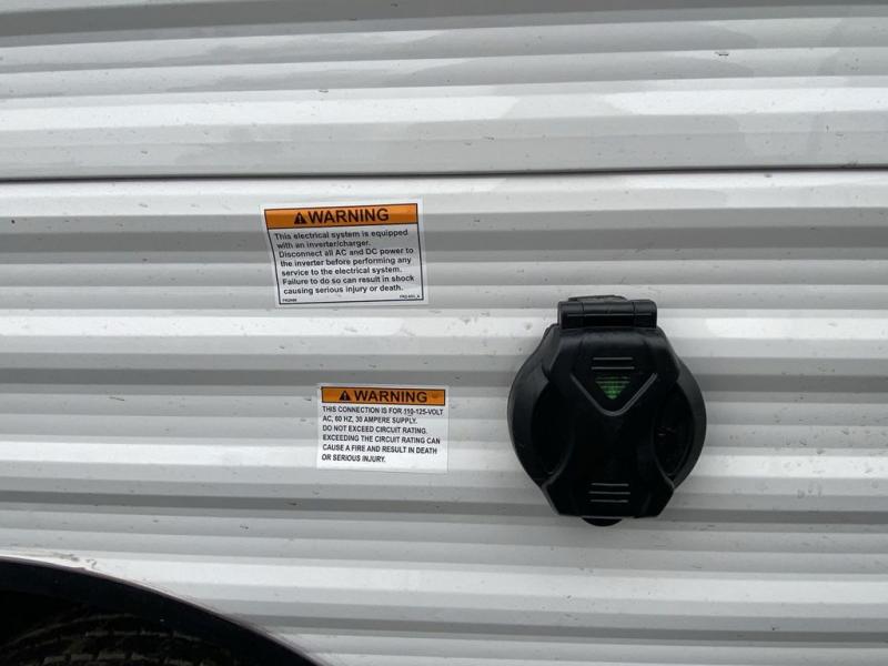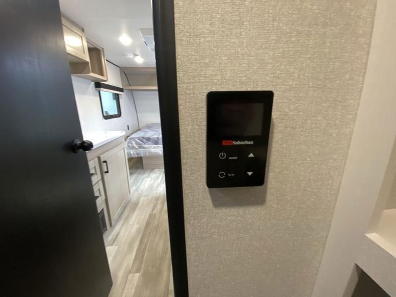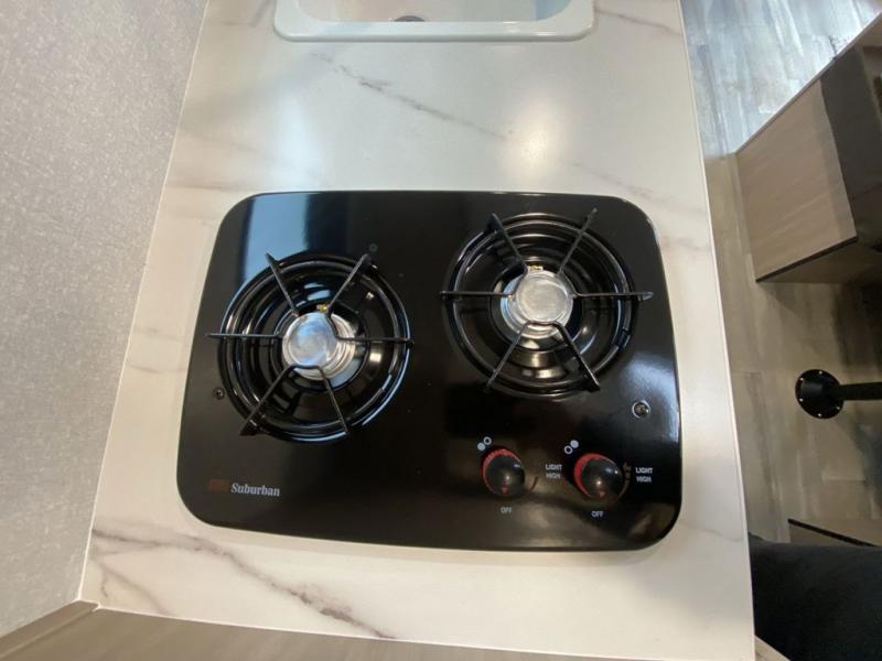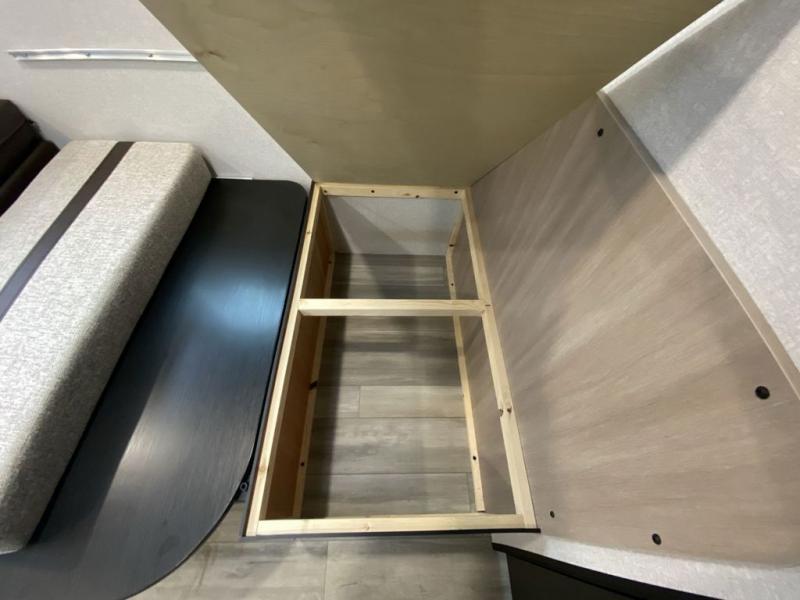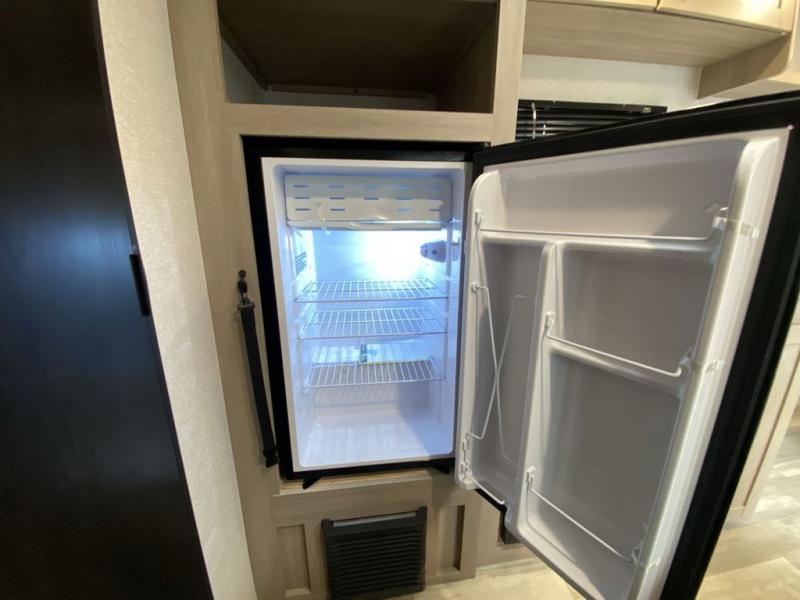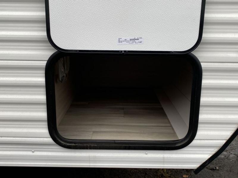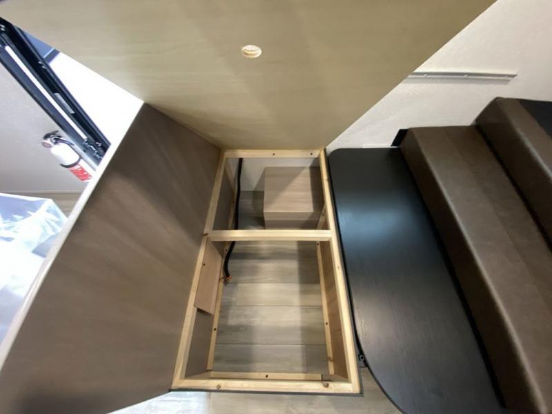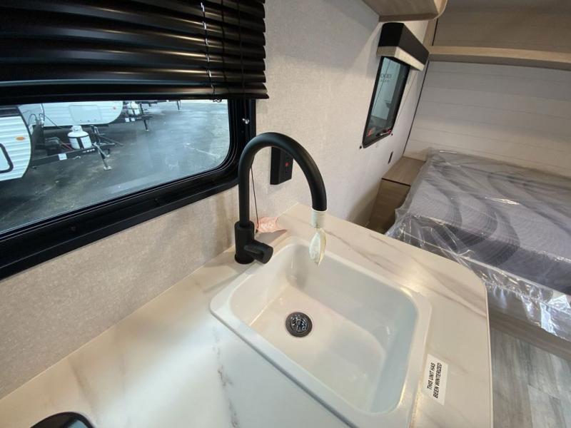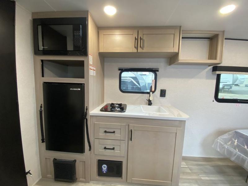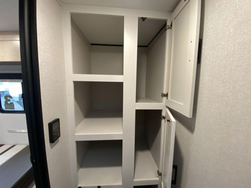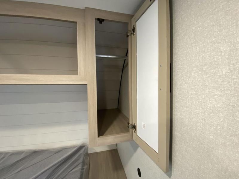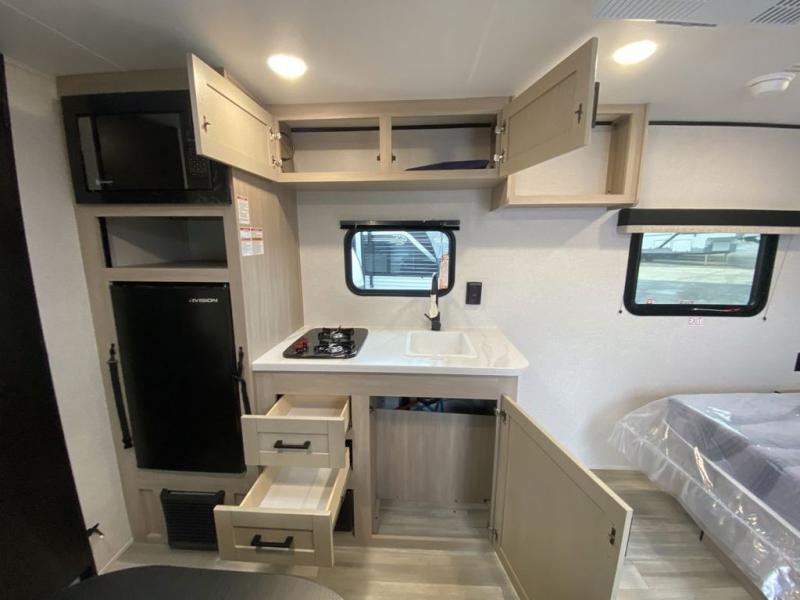 This travel trailer provides you with a little more privacy thanks to the rear bath, which also includes a bath linen closet and shelves for extra storage. The front bedroom includes a walk-around RV queen bed to make it easier to make the bed, and you'll find an overhead shelf for books or games. Once you've made lunch on the two-burner cooktop or in the microwave oven, you can dine at the booth dinette or take your plate outdoors to sit under the 10' power awning.