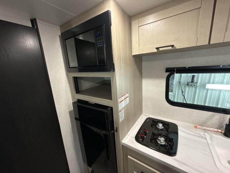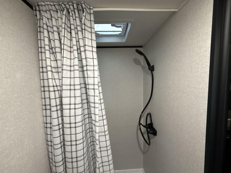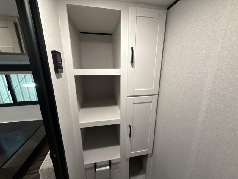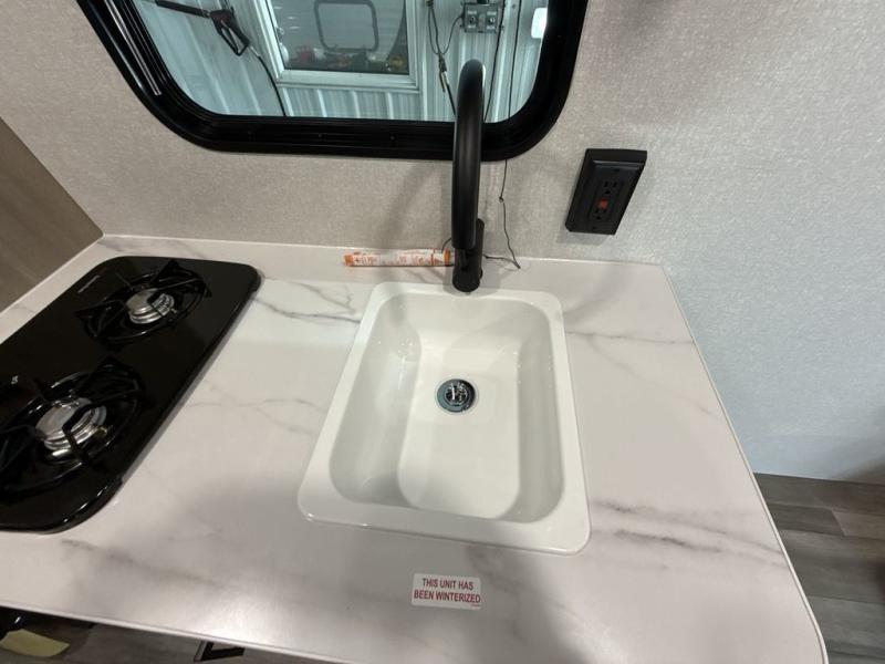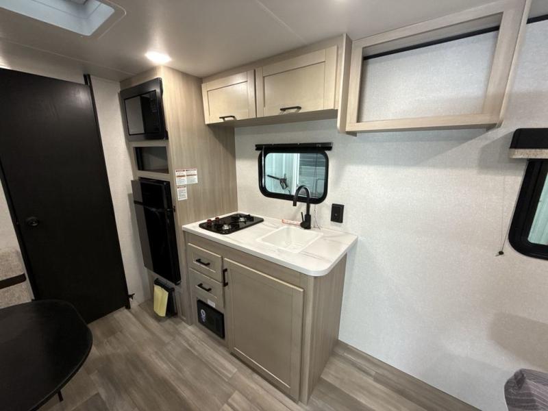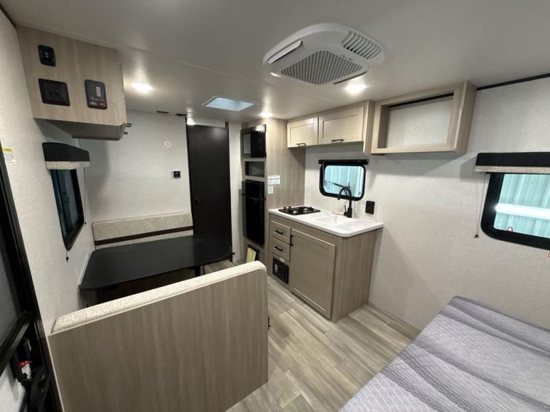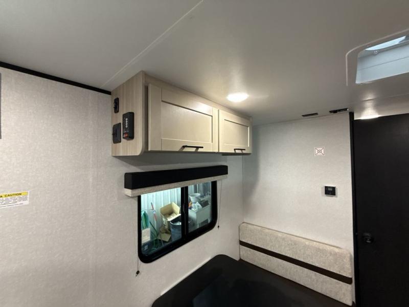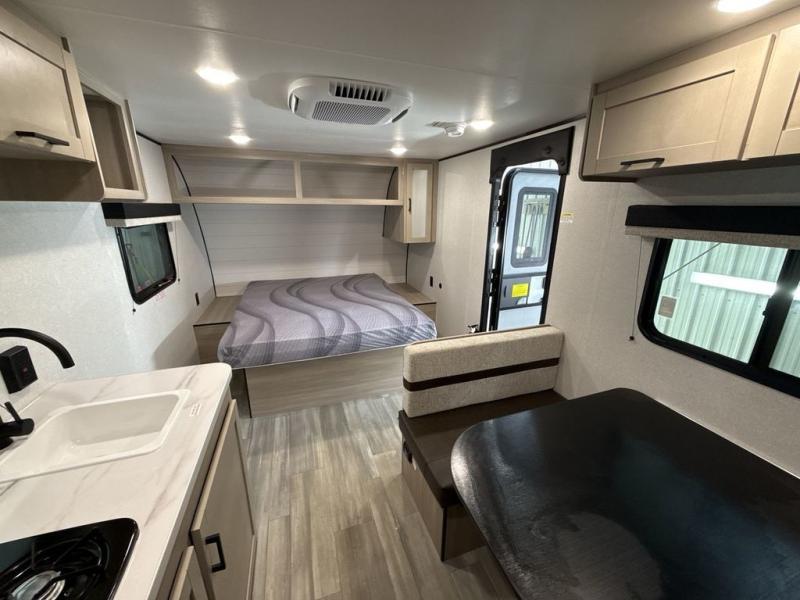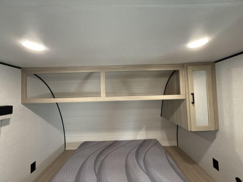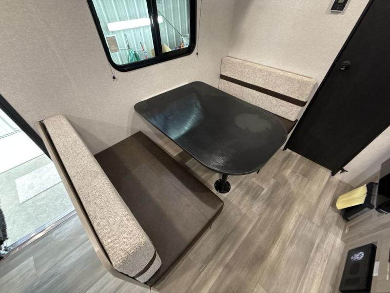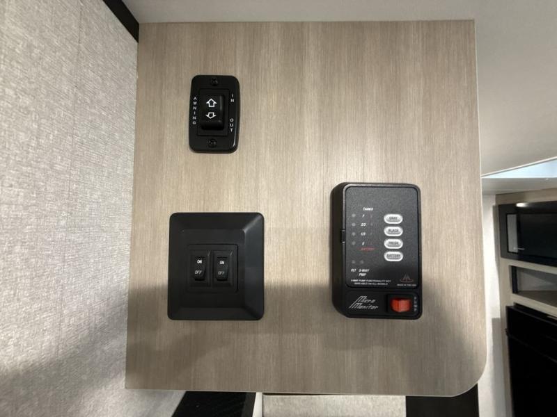 This travel trailer provides you with a little more privacy thanks to the rear bath, which also includes a bath linen closet and shelves for extra storage. The front bedroom includes a walk-around RV queen bed to make it easier to make the bed, and you'll find an overhead shelf for books or games. Once you've made lunch on the two-burner cooktop or in the microwave oven, you can dine at the booth dinette or take your plate outdoors to sit under the 10' power awning.