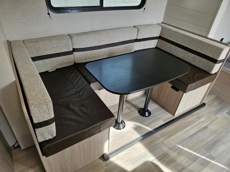 Camping trips are made easy in this Lynx Edition travel trailer with double-size bunk beds for guests or little ones. You'll find the front queen bed for a great night's rest, along with an overhead shelf and a wardrobe to keep your things tidy. The rear corner private bath includes a foot-flush toilet and a 24" x 40" shower, so you won't have to leave the camper in the middle of the night. A two-burner cooktop and microwave oven will let you make meals each day, and you can dine around the U-shaped dinette, which is also within a slide out for more space!