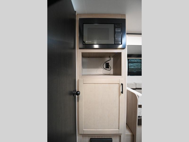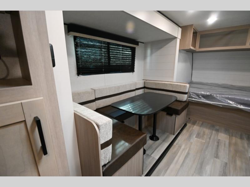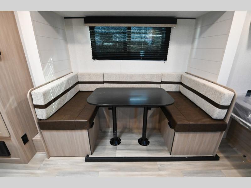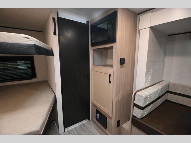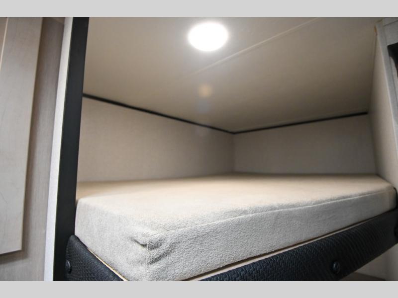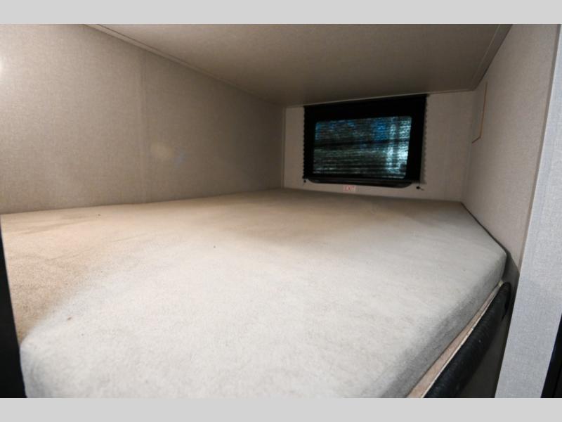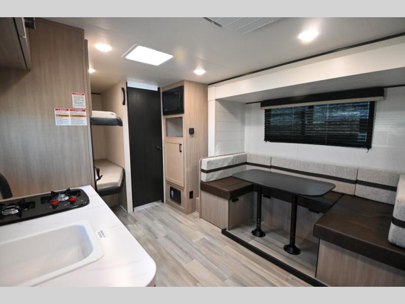 Camping trips are made easy in this Lynx Edition travel trailer with double-size bunk beds for guests or little ones. You'll find the front queen bed for a great night's rest, along with an overhead shelf and a wardrobe to keep your things tidy. The rear corner private bath includes a foot-flush toilet and a 24" x 40" shower, so you won't have to leave the camper in the middle of the night. A two-burner cooktop and microwave oven will let you make meals each day, and you can dine around the U-shaped dinette, which is also within a slide out for more space!