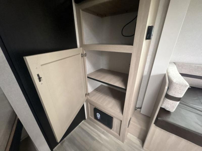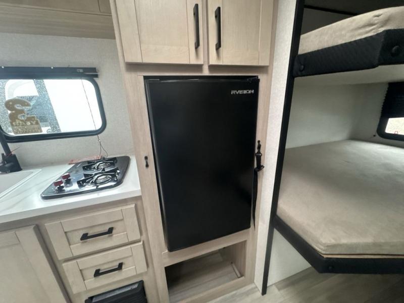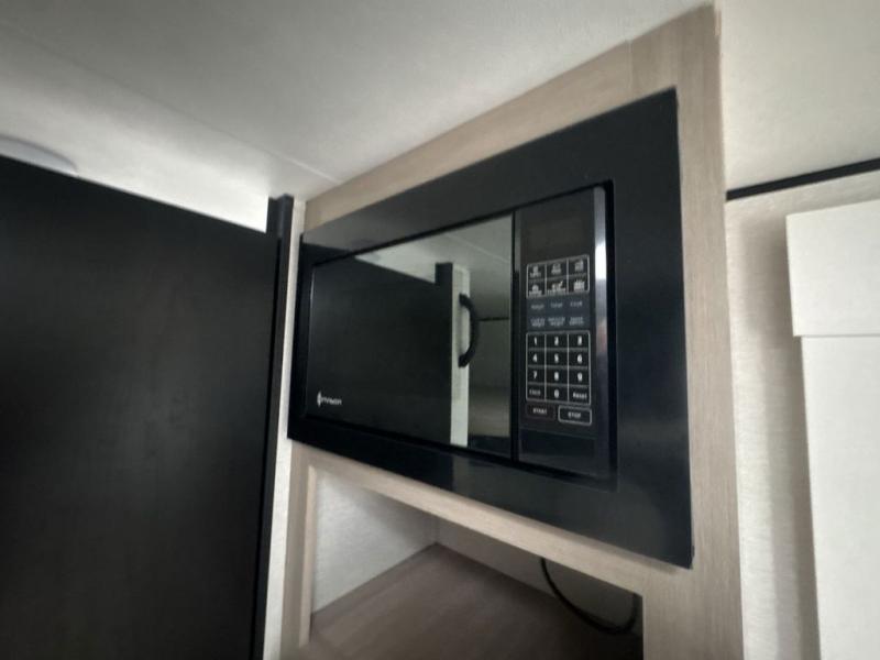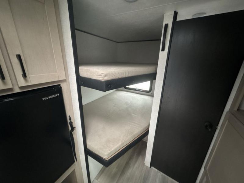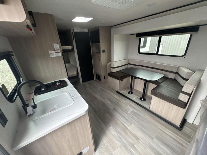 Camping trips are made easy in this Lynx Edition travel trailer with double-size bunk beds for guests or little ones. You'll find the front queen bed for a great night's rest, along with an overhead shelf and a wardrobe to keep your things tidy. The rear corner private bath includes a foot-flush toilet and a 24" x 40" shower, so you won't have to leave the camper in the middle of the night. A two-burner cooktop and microwave oven will let you make meals each day, and you can dine around the U-shaped dinette, which is also within a slide out for more space!