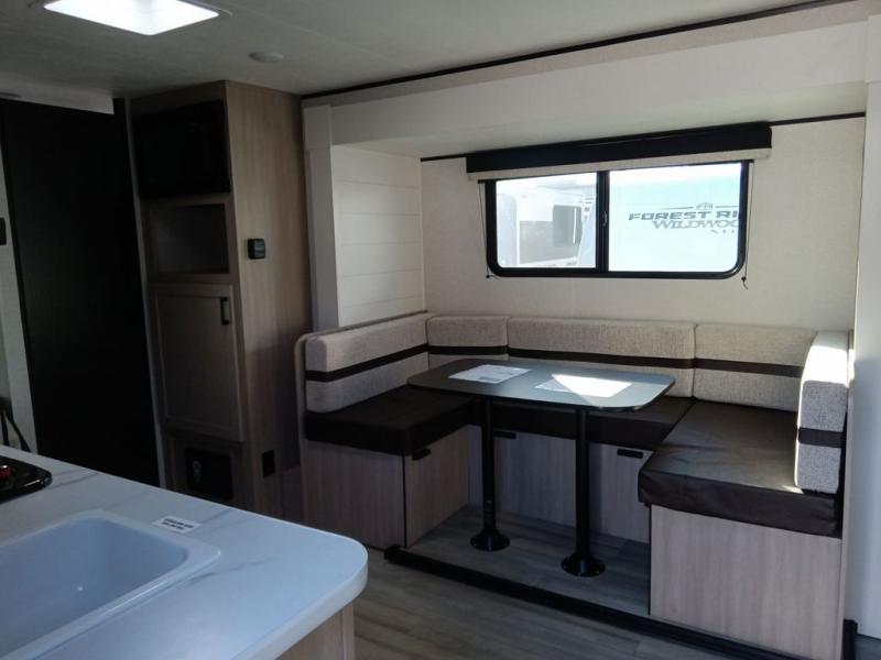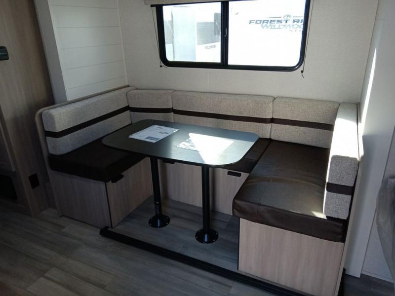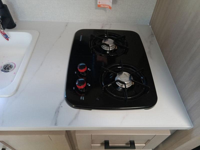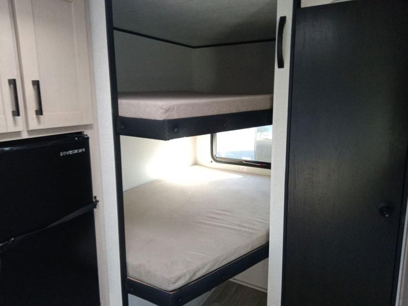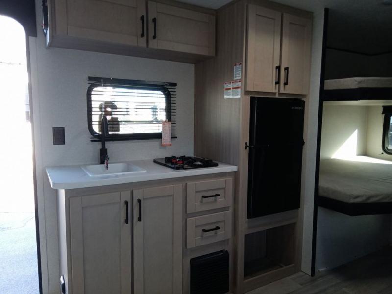 Camping trips are made easy in this Lynx Edition travel trailer with double-size bunk beds for guests or little ones. You'll find the front queen bed for a great night's rest, along with an overhead shelf and a wardrobe to keep your things tidy. The rear corner private bath includes a foot-flush toilet and a 24" x 40" shower, so you won't have to leave the camper in the middle of the night. A two-burner cooktop and microwave oven will let you make meals each day, and you can dine around the U-shaped dinette, which is also within a slide out for more space!