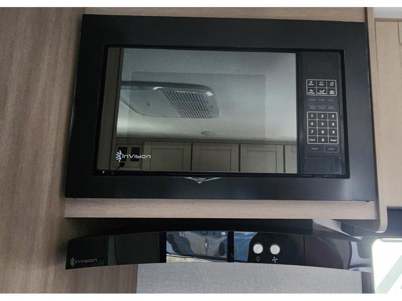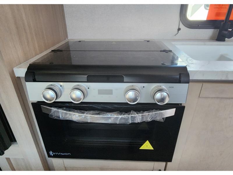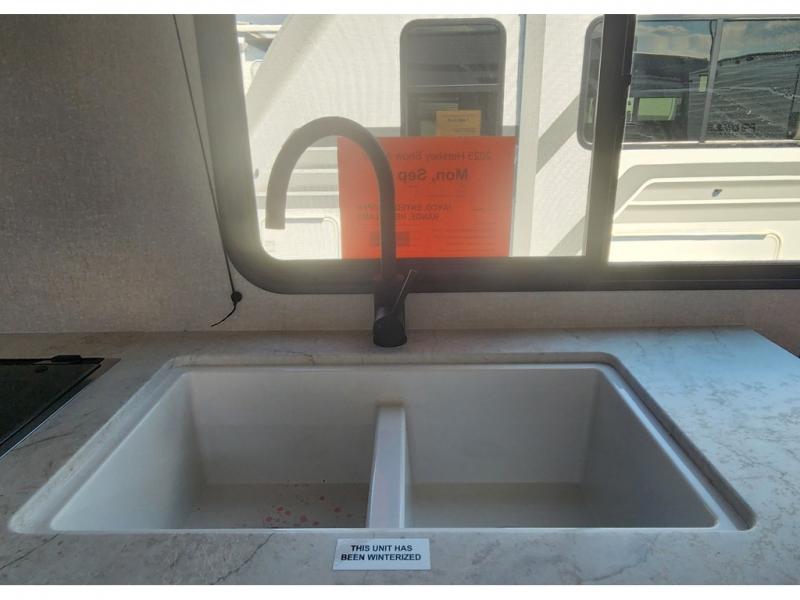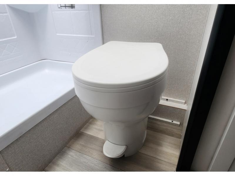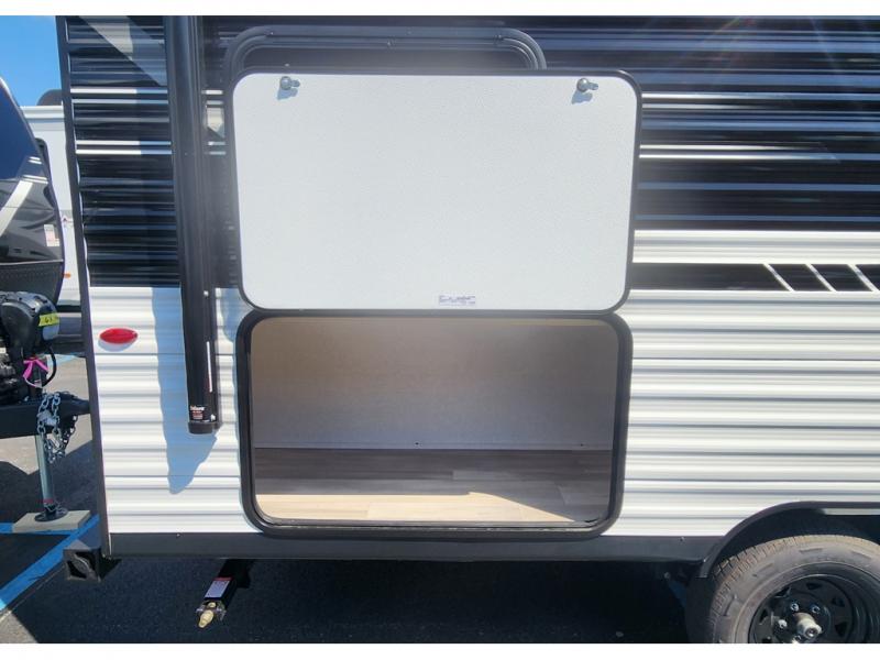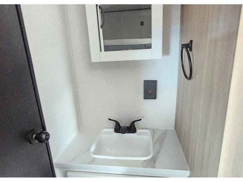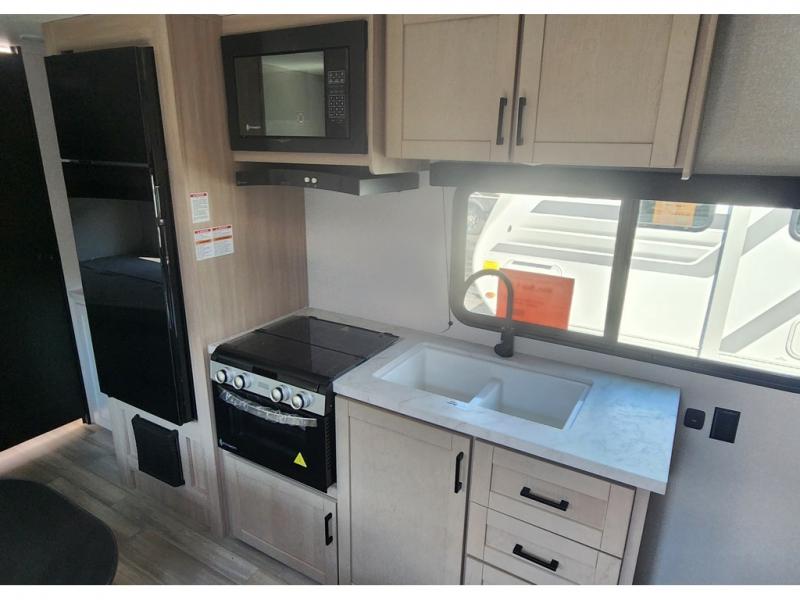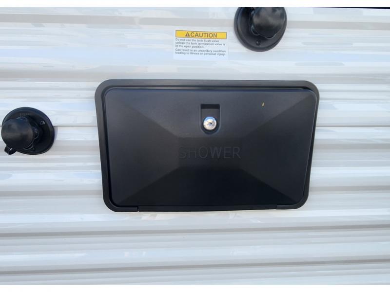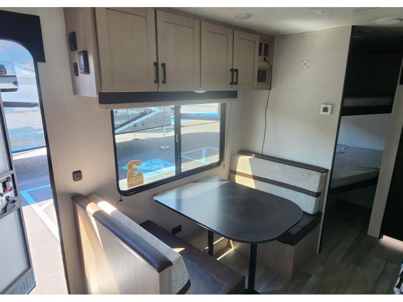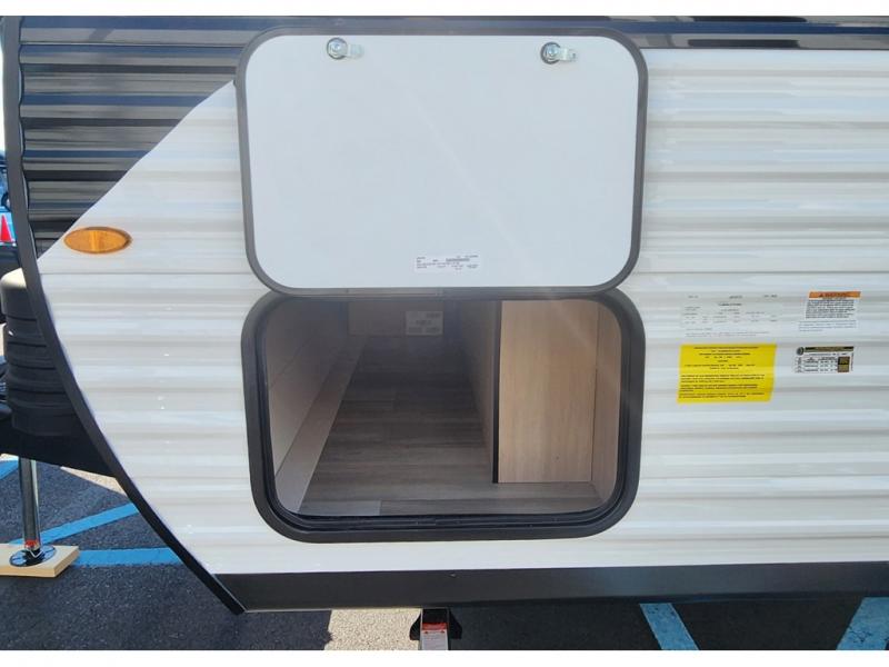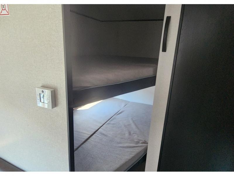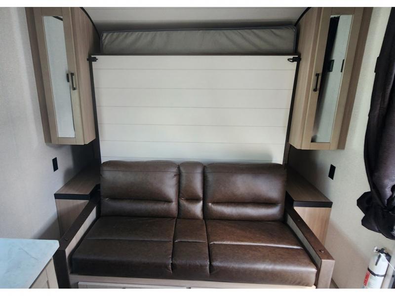 Camping trips are made easy in this travel trailer with double-size bunk beds for guests or little ones. There is a front Murphy bed that will provide you with more space during the day when you put it away to reveal the jack knife sofa. The rear corner full bath includes a foot-flush toilet, a 24" x 40" shower, so you won't have to leave the camper in the middle of the night. A three-burner cooktop and microwave oven will let you make meals each day, and you can dine at the booth dinette or take your plate outdoors to sit under the 16' power awning with LED lights!