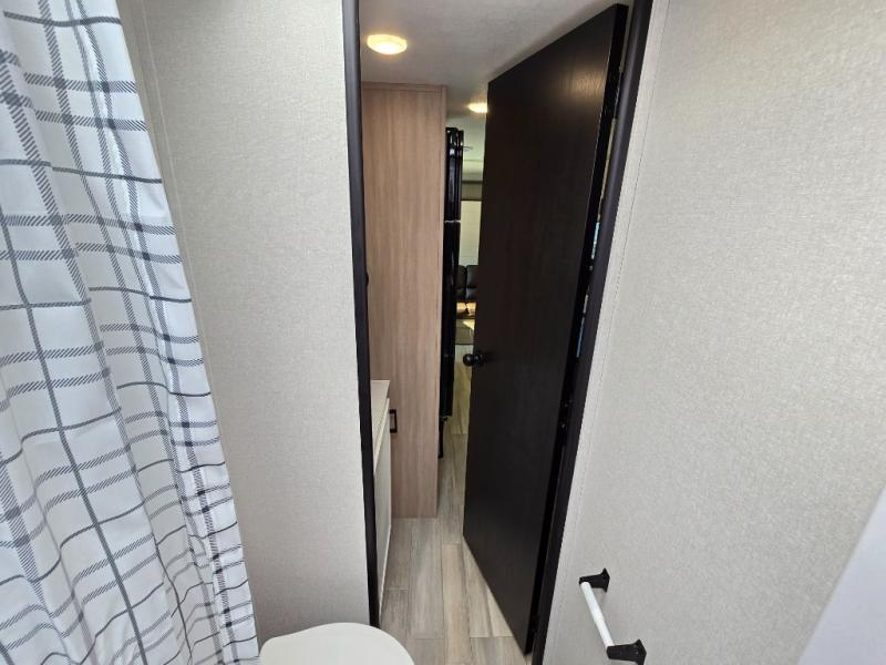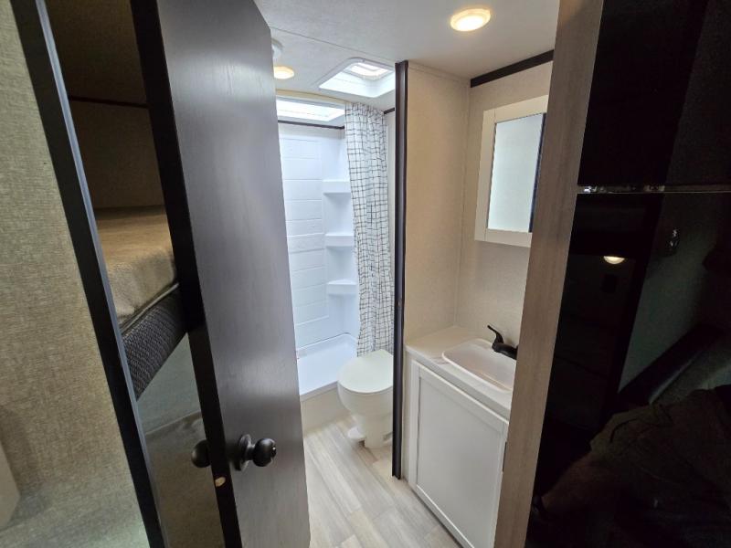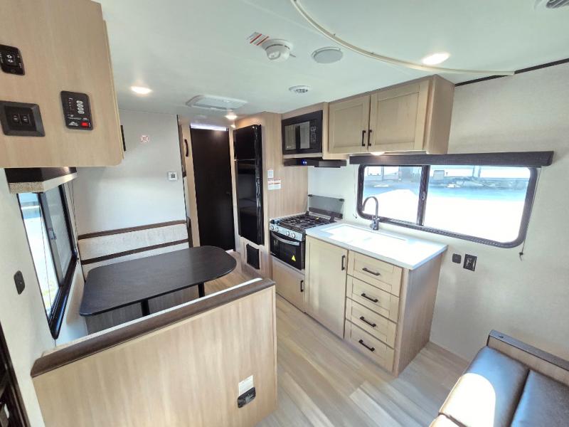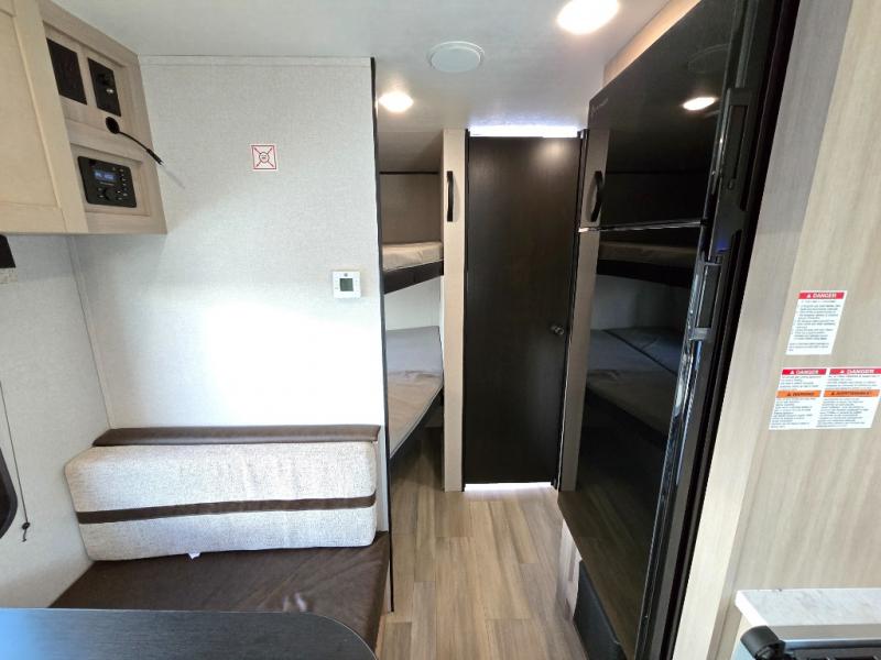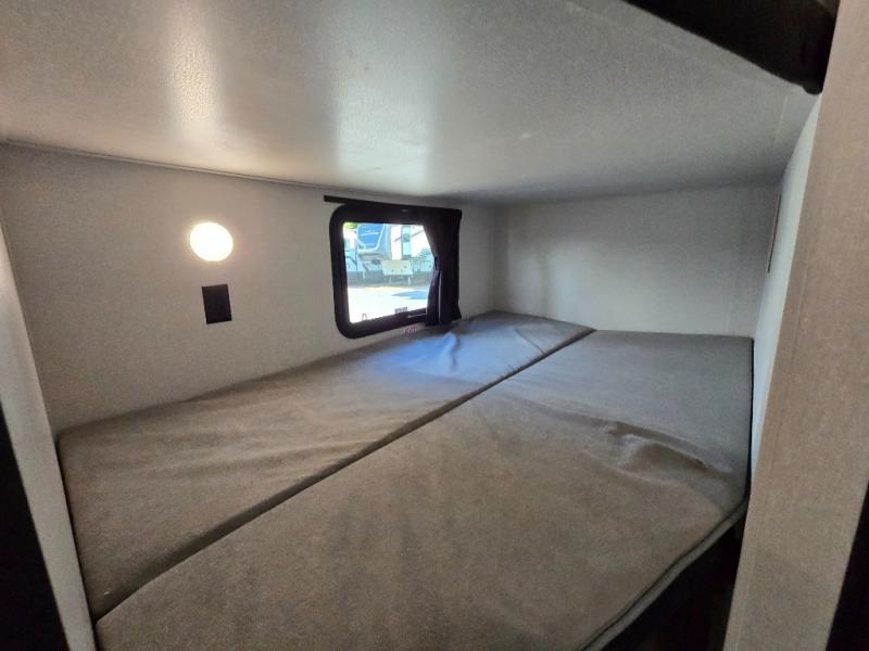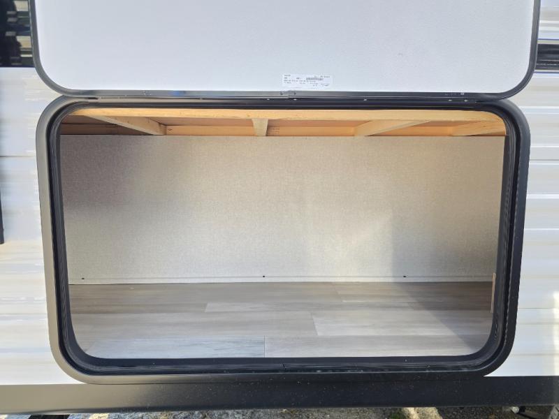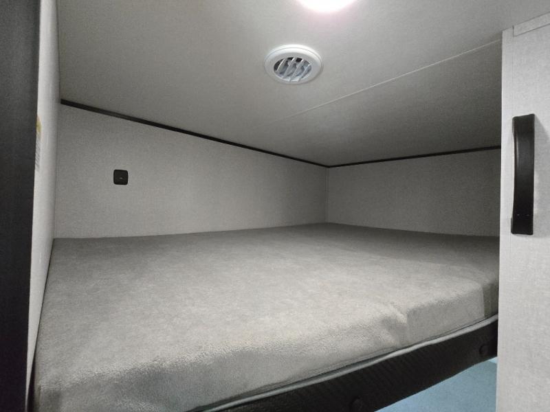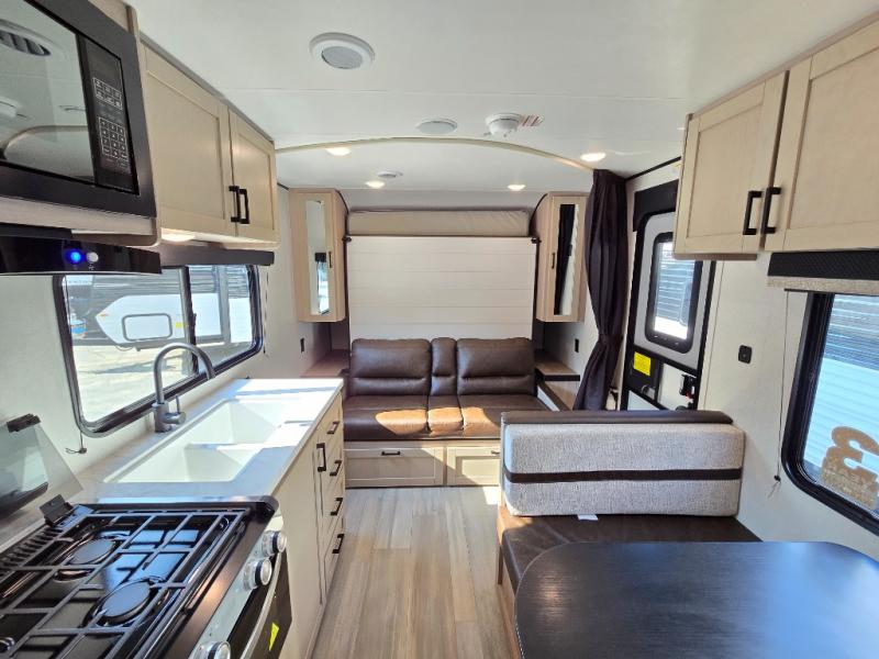 Camping trips are made easy in this travel trailer with double-size bunk beds for guests or little ones. There is a front Murphy bed that will provide you with more space during the day when you put it away to reveal the jack knife sofa. The rear corner full bath includes a foot-flush toilet, a 24" x 40" shower, so you won't have to leave the camper in the middle of the night. A three-burner cooktop and microwave oven will let you make meals each day, and you can dine at the booth dinette or take your plate outdoors to sit under the 16' power awning with LED lights!
