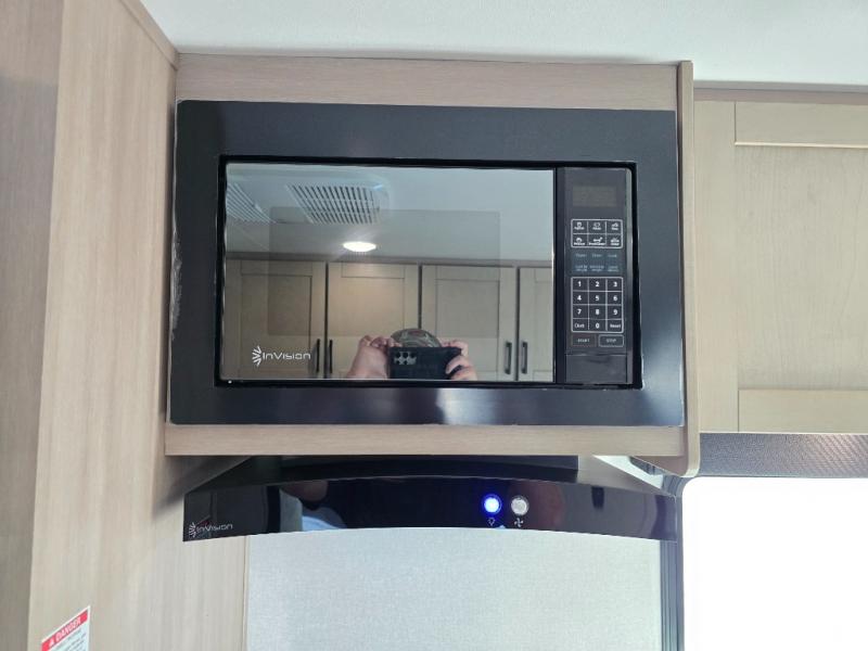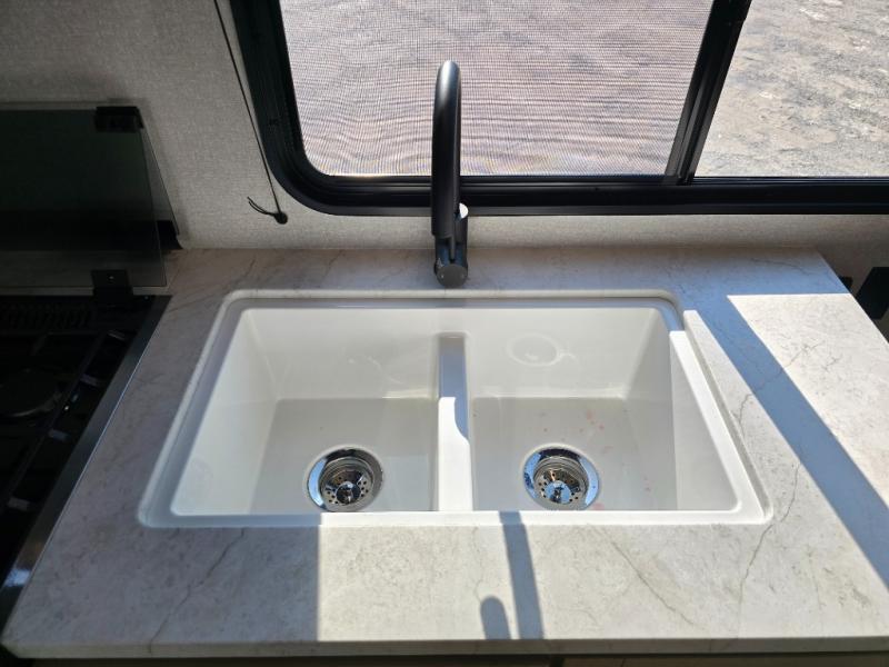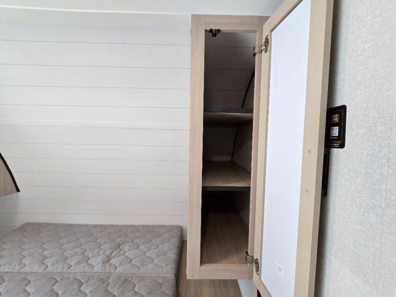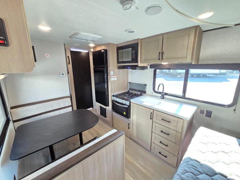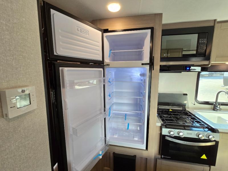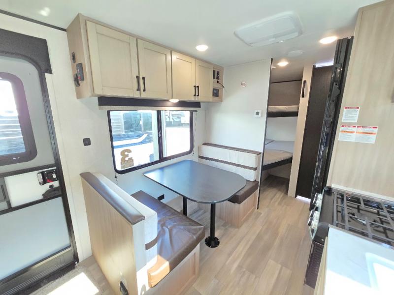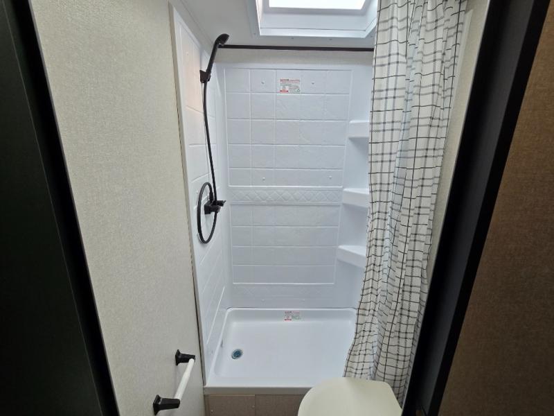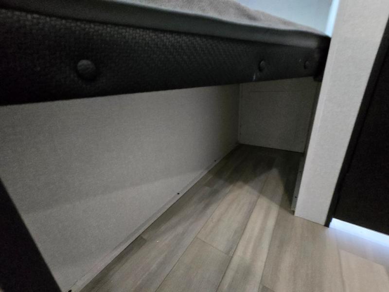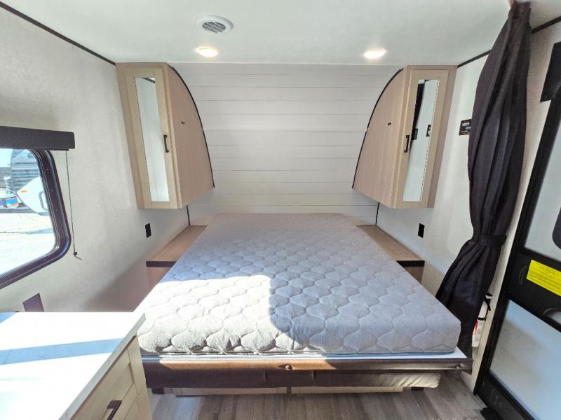 Camping trips are made easy in this travel trailer with double-size bunk beds for guests or little ones. There is a front Murphy bed that will provide you with more space during the day when you put it away to reveal the jack knife sofa. The rear corner full bath includes a foot-flush toilet, a 24" x 40" shower, so you won't have to leave the camper in the middle of the night. A three-burner cooktop and microwave oven will let you make meals each day, and you can dine at the booth dinette or take your plate outdoors to sit under the 16' power awning with LED lights!
