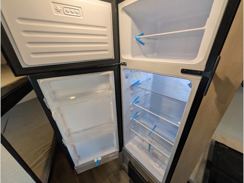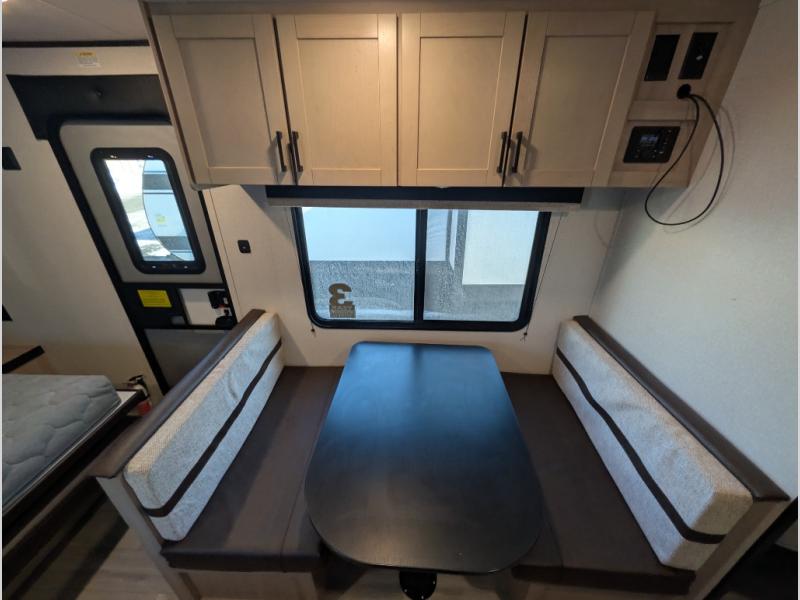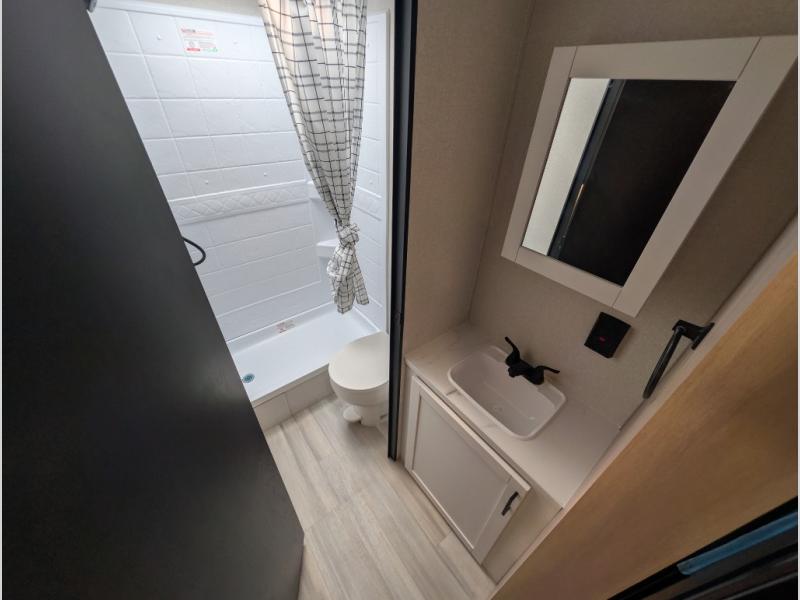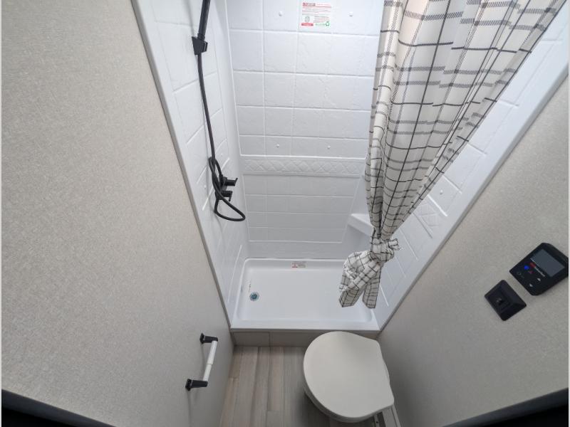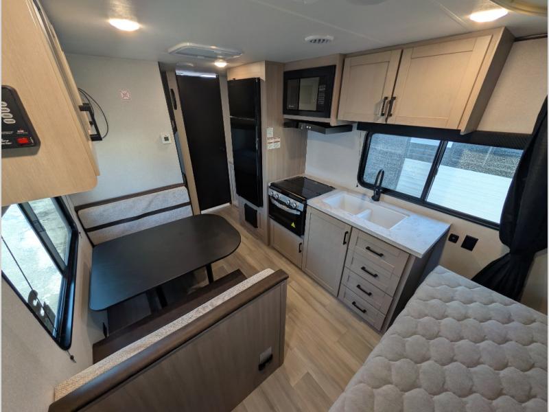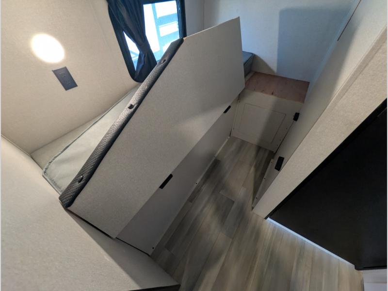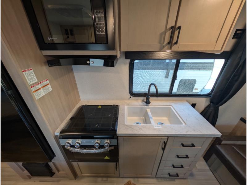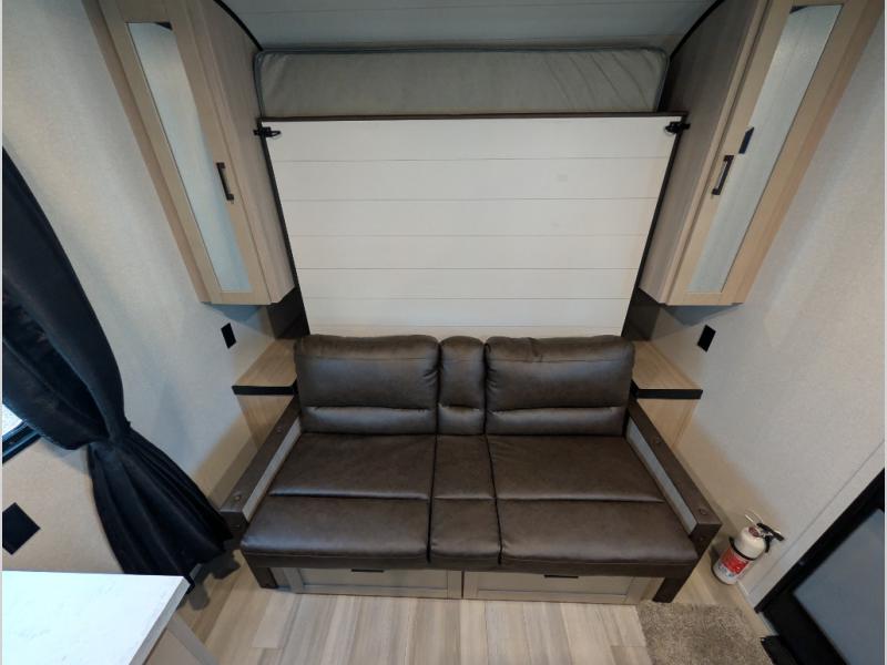 Camping trips are made easy in this travel trailer with double-size bunk beds for guests or little ones. There is a front Murphy bed that will provide you with more space during the day when you put it away to reveal the jack knife sofa. The rear corner full bath includes a foot-flush toilet, a 24" x 40" shower, so you won't have to leave the camper in the middle of the night. A three-burner cooktop and microwave oven will let you make meals each day, and you can dine at the booth dinette or take your plate outdoors to sit under the 16' power awning with LED lights!