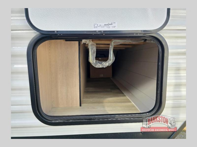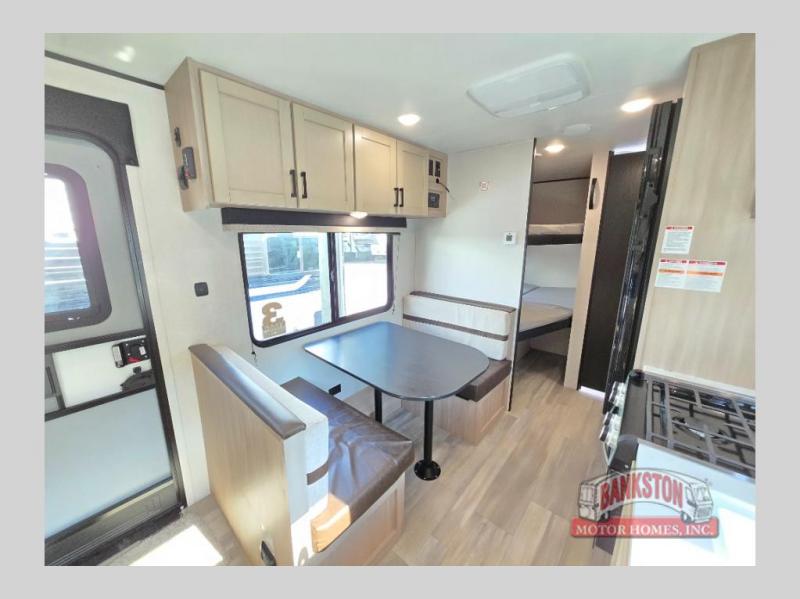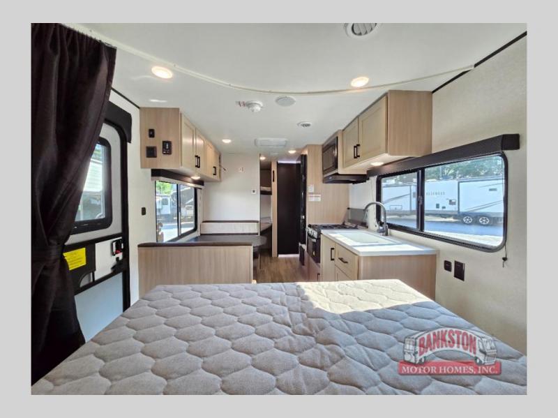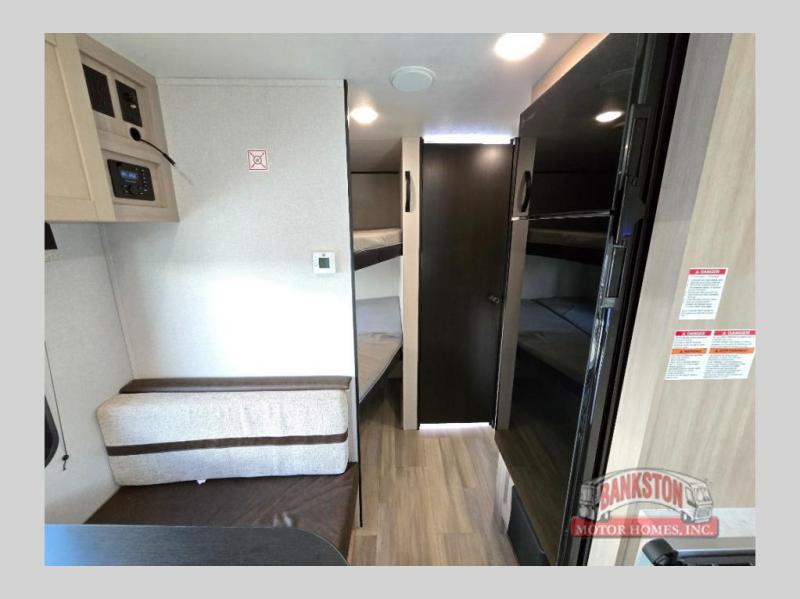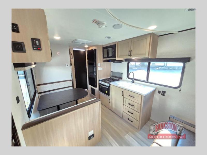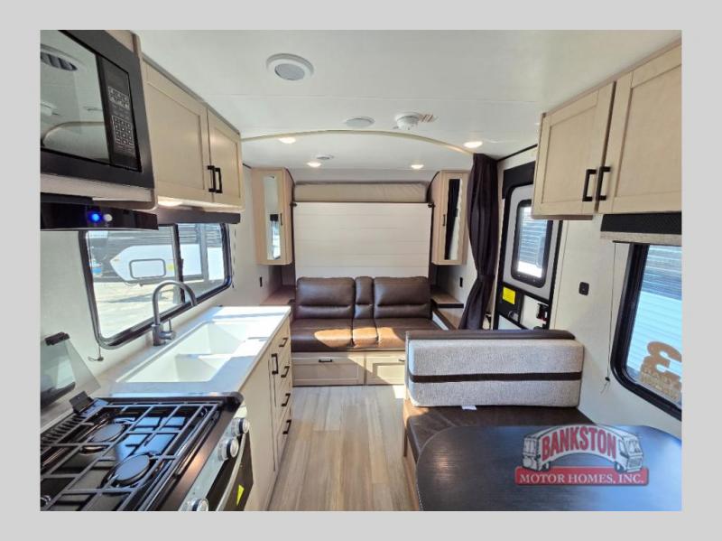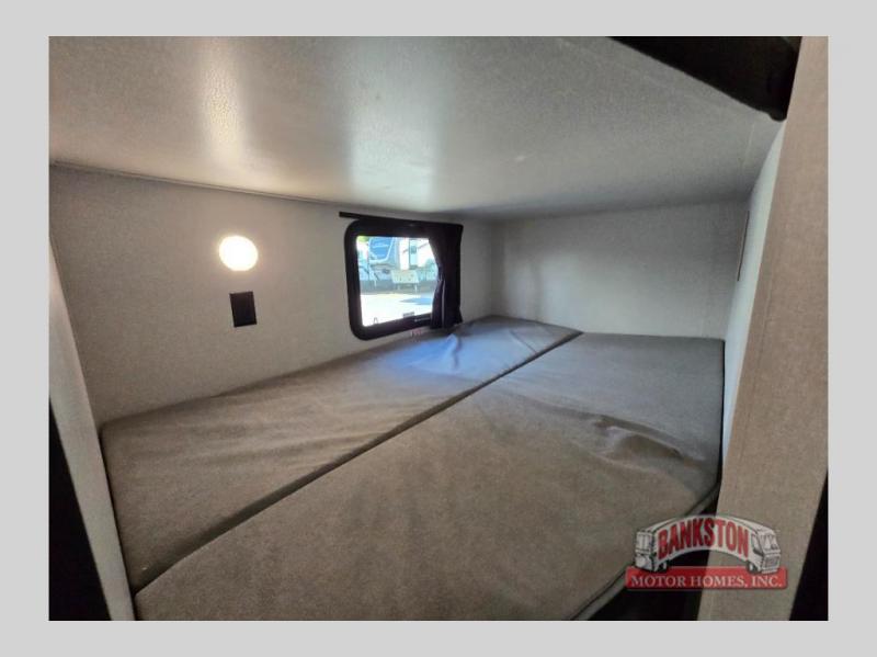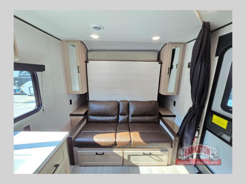Camping trips are made easy in this travel trailer with double-size bunk beds for guests or little ones. There is a front Murphy bed that will provide you with more space during the day when you put it away to reveal the jack knife sofa. The rear corner full bath includes a foot-flush toilet, a 24" x 40" shower, so you won't have to leave the camper in the middle of the night. A three-burner cooktop and microwave oven will let you make meals each day, and you can dine at the booth dinette or take your plate outdoors to sit under the 16' power awning with LED lights!