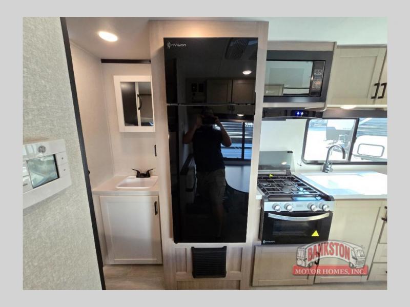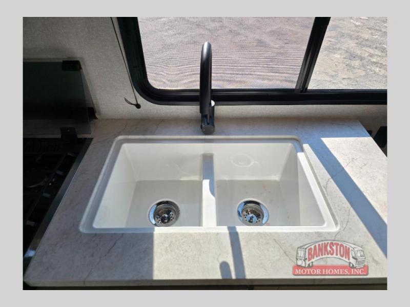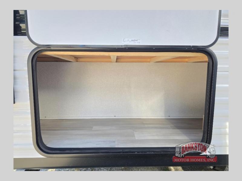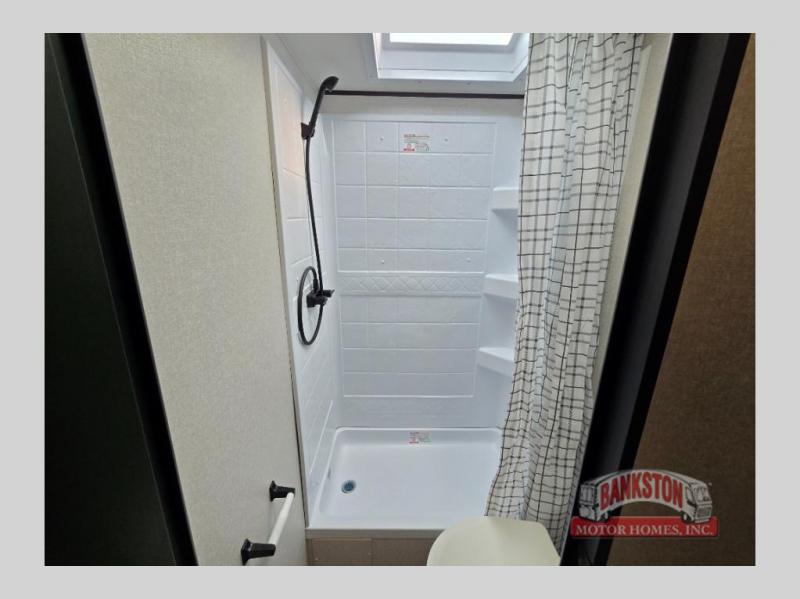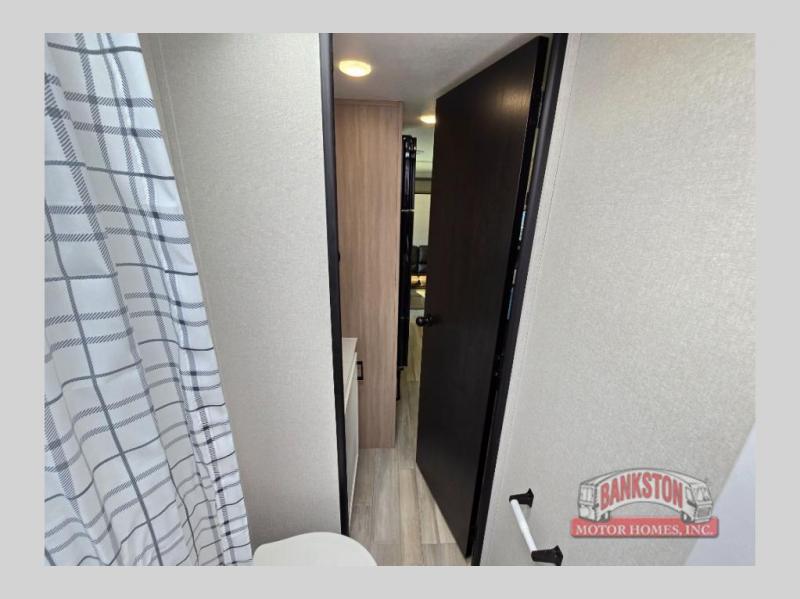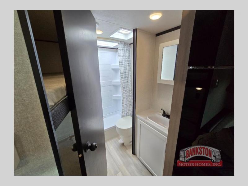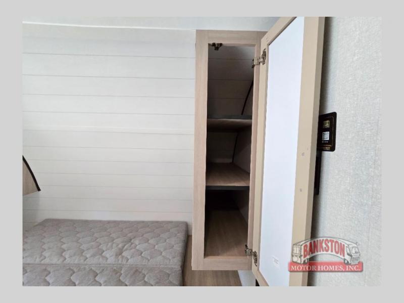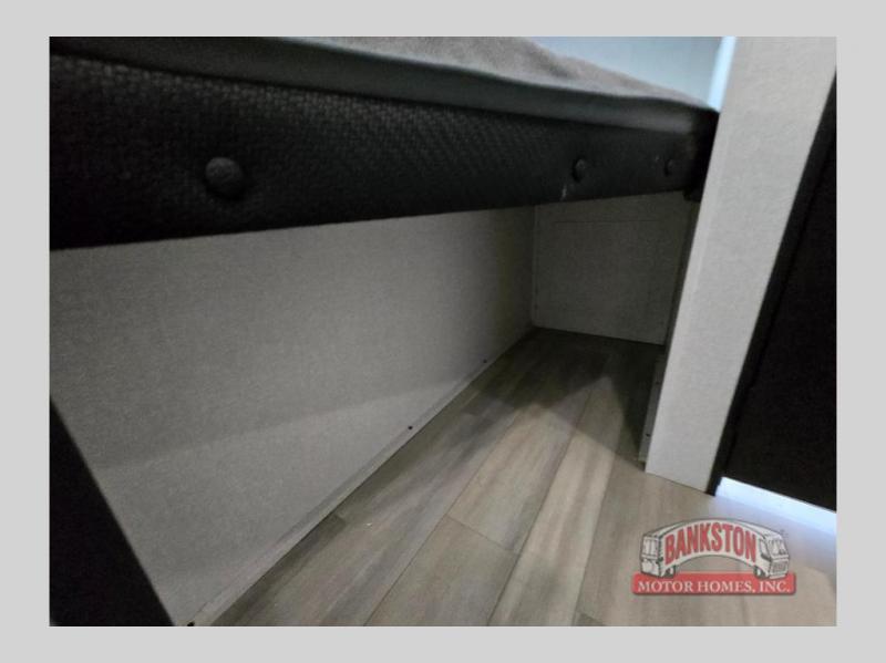 Camping trips are made easy in this travel trailer with double-size bunk beds for guests or little ones. There is a front Murphy bed that will provide you with more space during the day when you put it away to reveal the jack knife sofa. The rear corner full bath includes a foot-flush toilet, a 24" x 40" shower, so you won't have to leave the camper in the middle of the night. A three-burner cooktop and microwave oven will let you make meals each day, and you can dine at the booth dinette or take your plate outdoors to sit under the 16' power awning with LED lights!