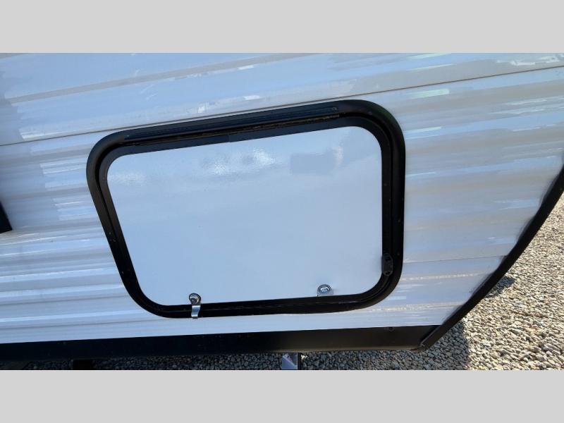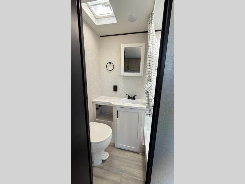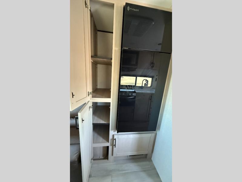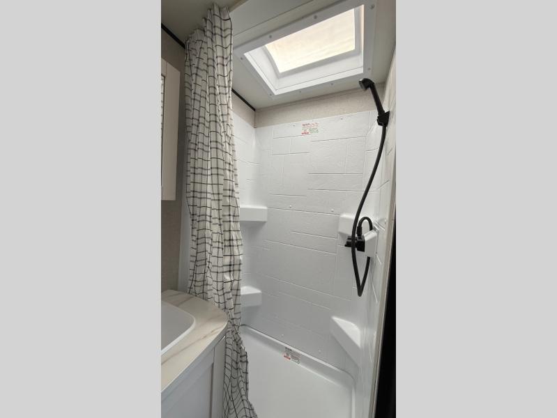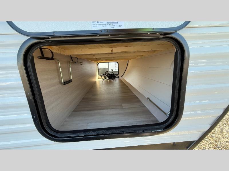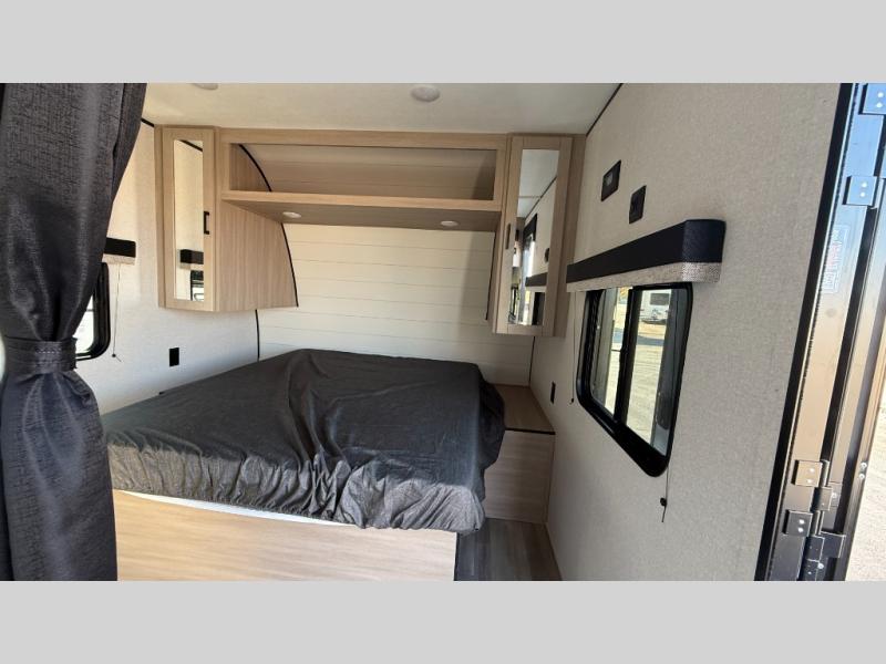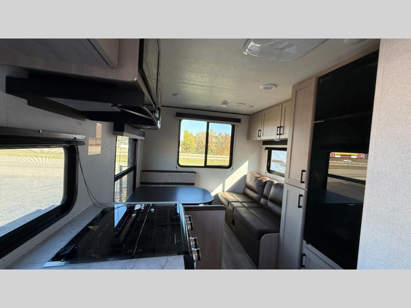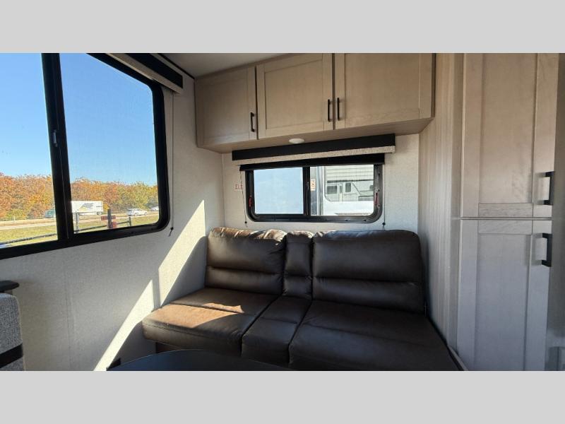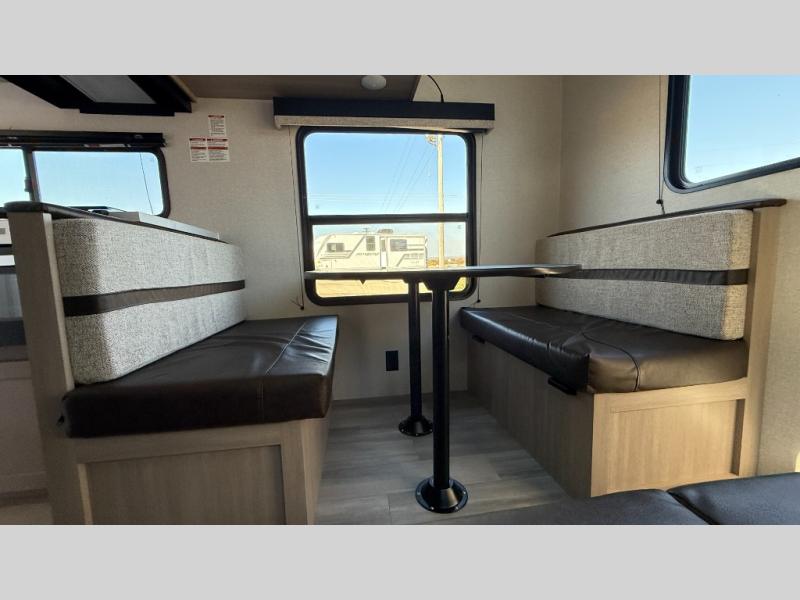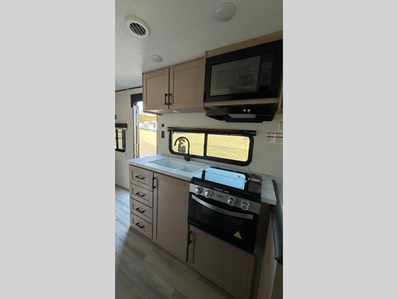 Weekend trips to the campground will be made unforgettable in this travel trailer for five to six. You will enjoy your own space in the front bedroom with a privacy curtain, RV queen bed and dual bedside wardrobes to keep your things tidy. If you have any guests staying over, then can convert the jack knife sofa and booth dinette back into seating spaces for breakfast in the morning. Speaking of breakfast, you'll have a three-burner cooktop and microwave oven to cook eggs and bacon, plus an 8-cu. ft. 12V refrigerator and pantry for food storage.