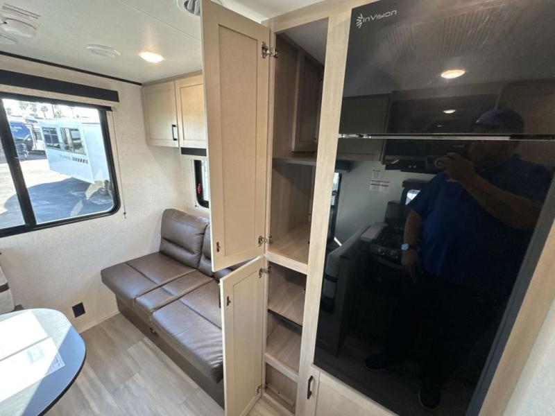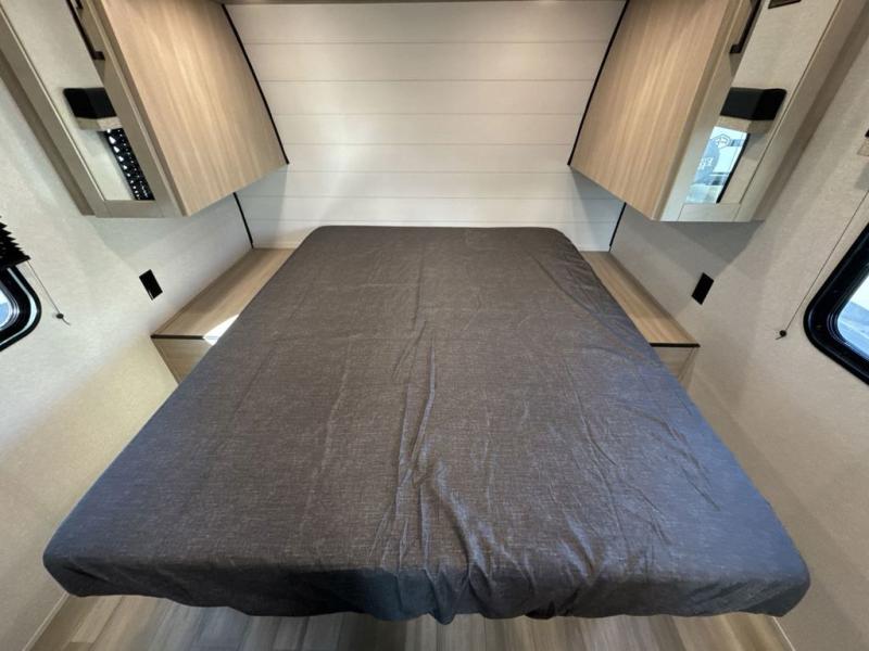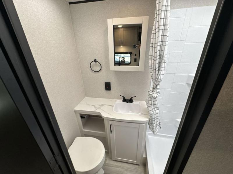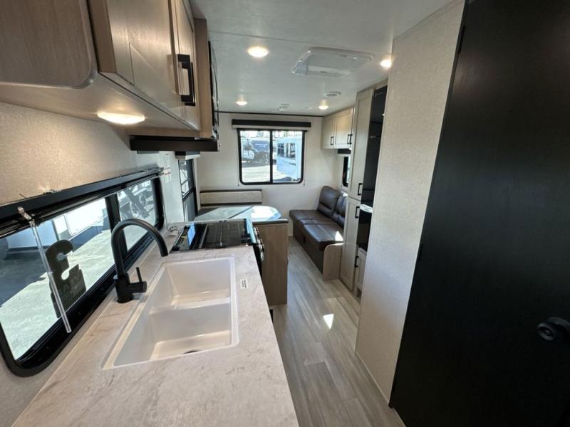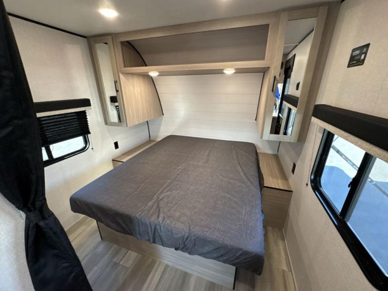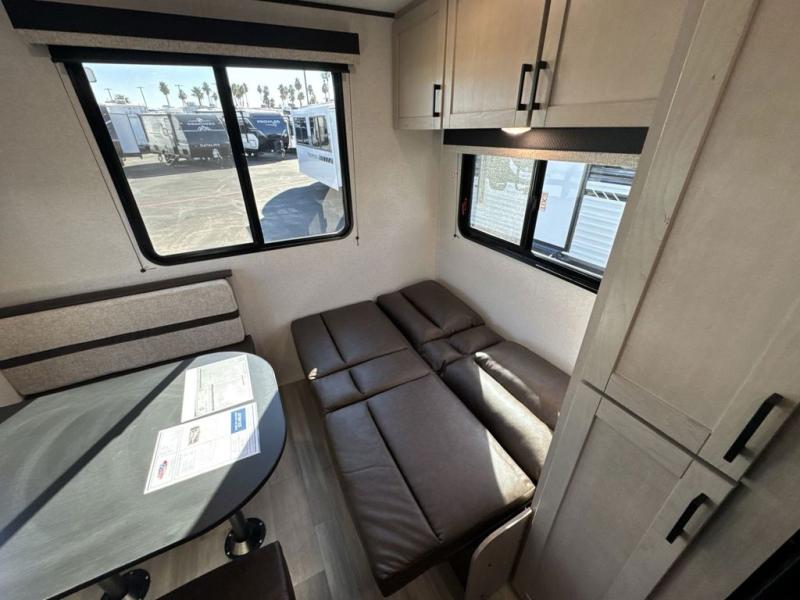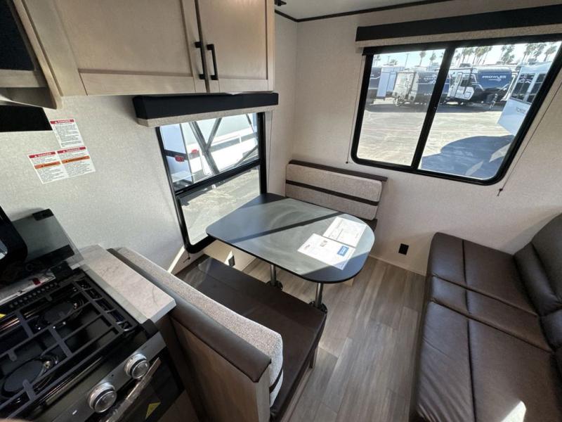Weekend trips to the campground will be made unforgettable in this travel trailer for five to six. You will enjoy your own space in the front bedroom with a privacy curtain, RV queen bed and dual bedside wardrobes to keep your things tidy. If you have any guests staying over, then can convert the jack knife sofa and booth dinette back into seating spaces for breakfast in the morning. Speaking of breakfast, you'll have a three-burner cooktop and microwave oven to cook eggs and bacon, plus an 8-cu. ft. 12V refrigerator and pantry for food storage.