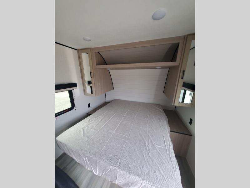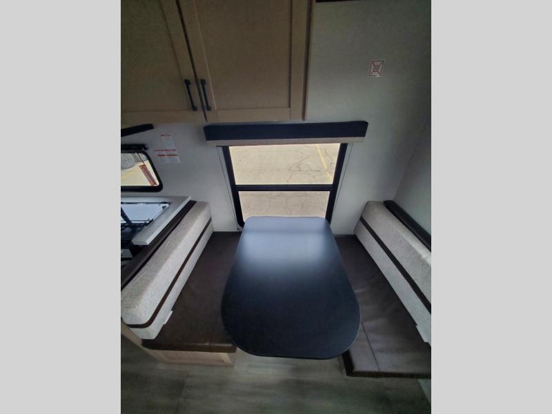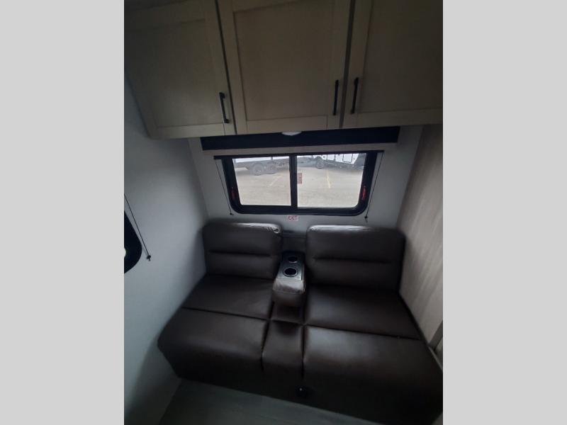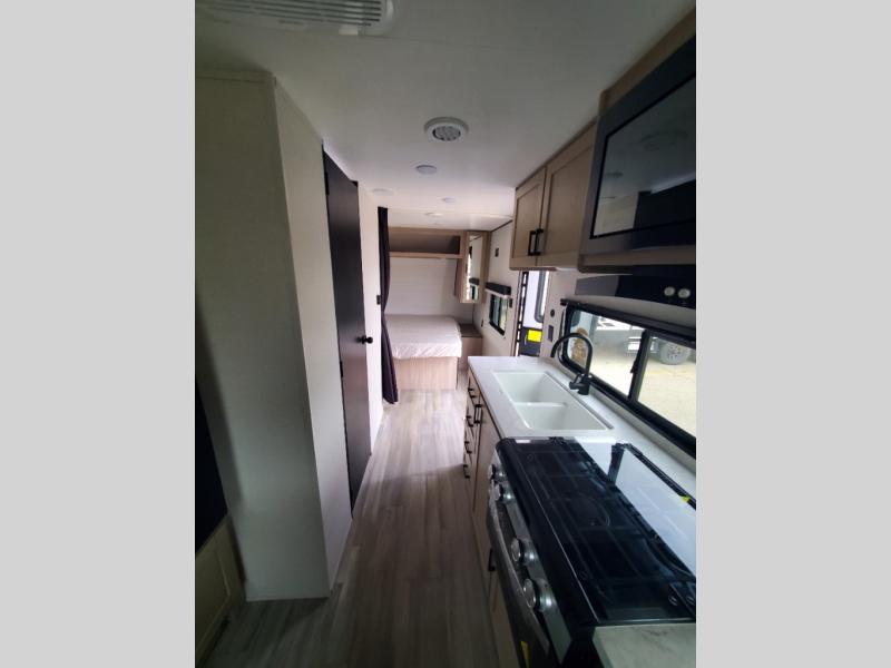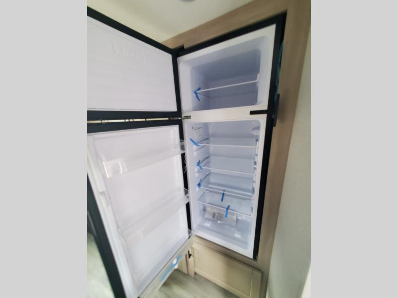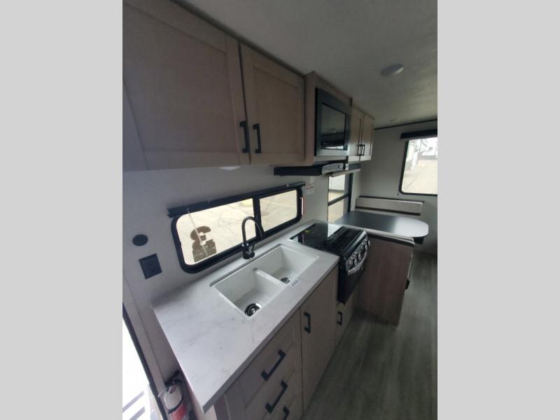 Weekend trips to the campground will be made unforgettable in this travel trailer for five to six. You will enjoy your own space in the front bedroom with a privacy curtain, RV queen bed and dual bedside wardrobes to keep your things tidy. If you have any guests staying over, then can convert the jack knife sofa and booth dinette back into seating spaces for breakfast in the morning. Speaking of breakfast, you'll have a three-burner cooktop and microwave oven to cook eggs and bacon, plus an 8-cu. ft. 12V refrigerator and pantry for food storage.