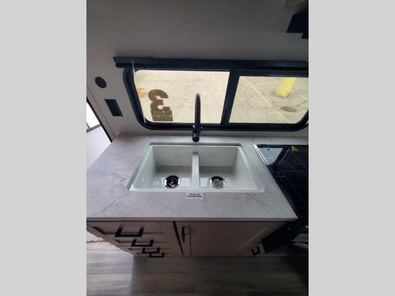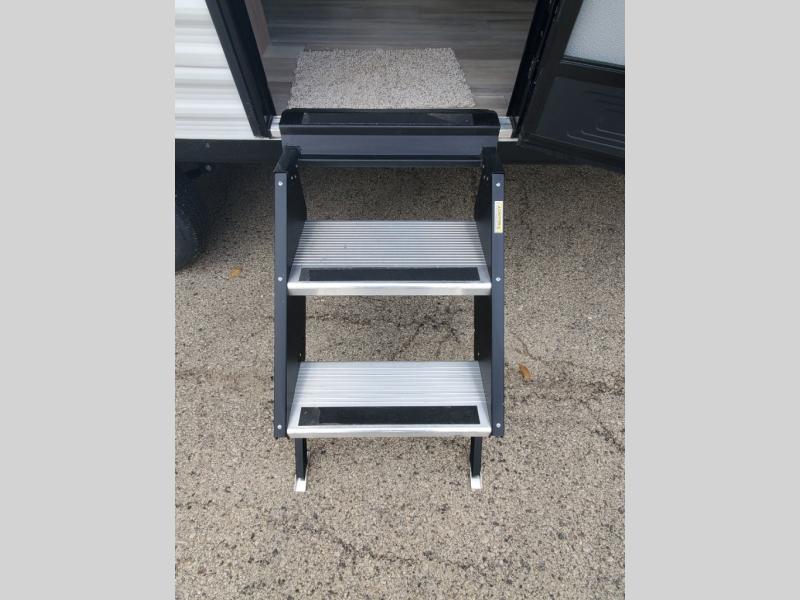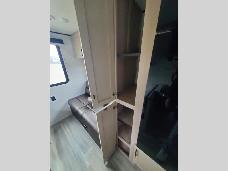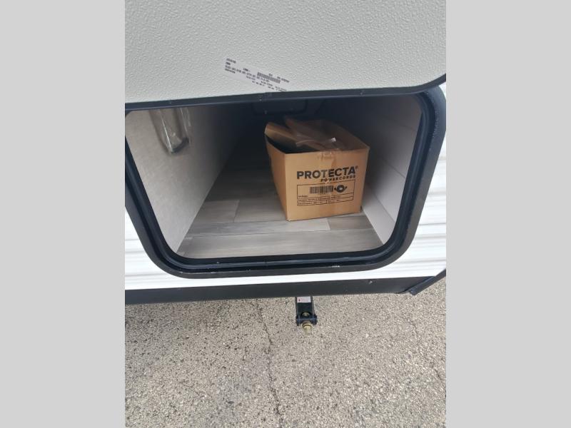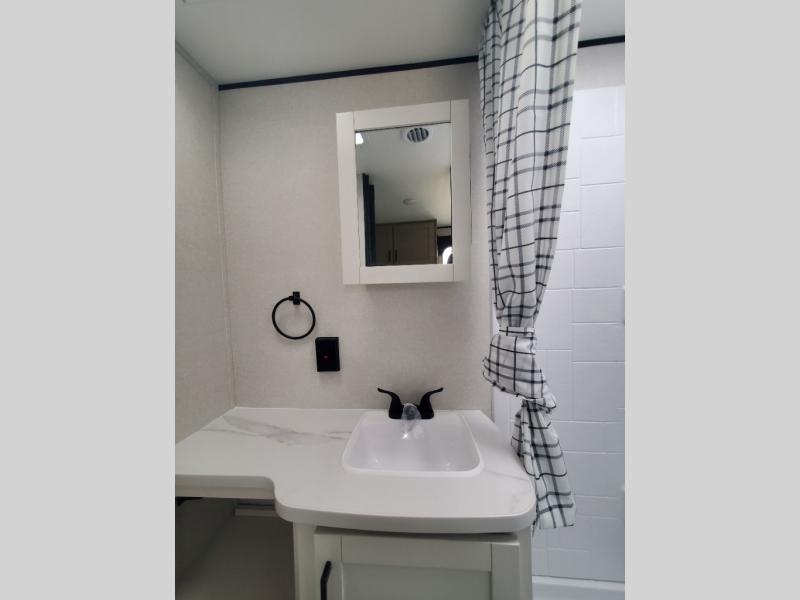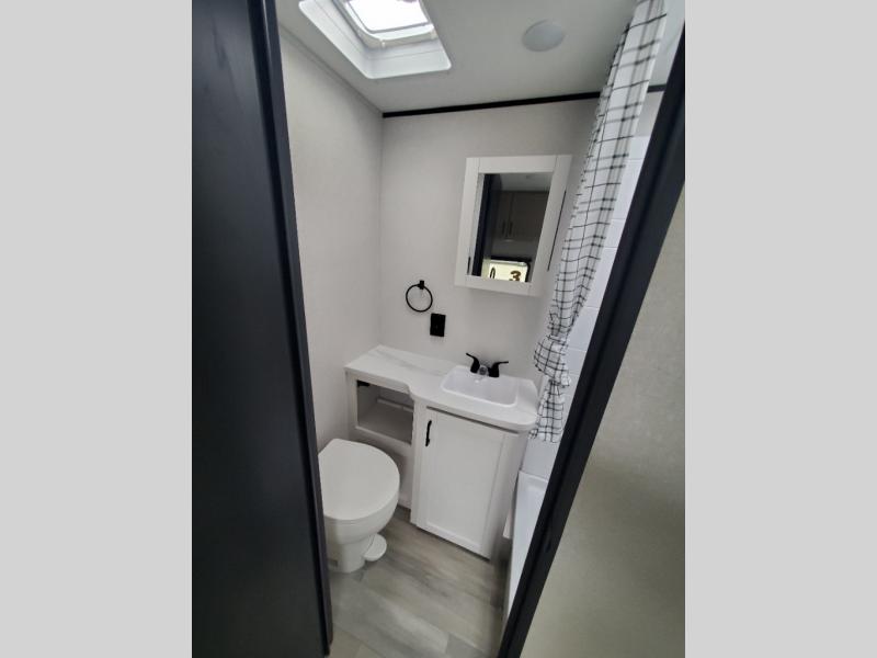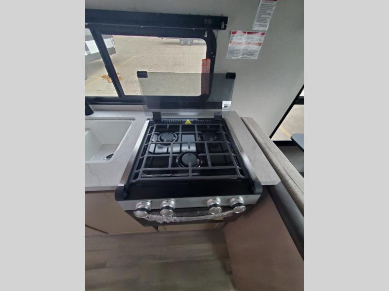 Weekend trips to the campground will be made unforgettable in this travel trailer for five to six. You will enjoy your own space in the front bedroom with a privacy curtain, RV queen bed and dual bedside wardrobes to keep your things tidy. If you have any guests staying over, then can convert the jack knife sofa and booth dinette back into seating spaces for breakfast in the morning. Speaking of breakfast, you'll have a three-burner cooktop and microwave oven to cook eggs and bacon, plus an 8-cu. ft. 12V refrigerator and pantry for food storage.