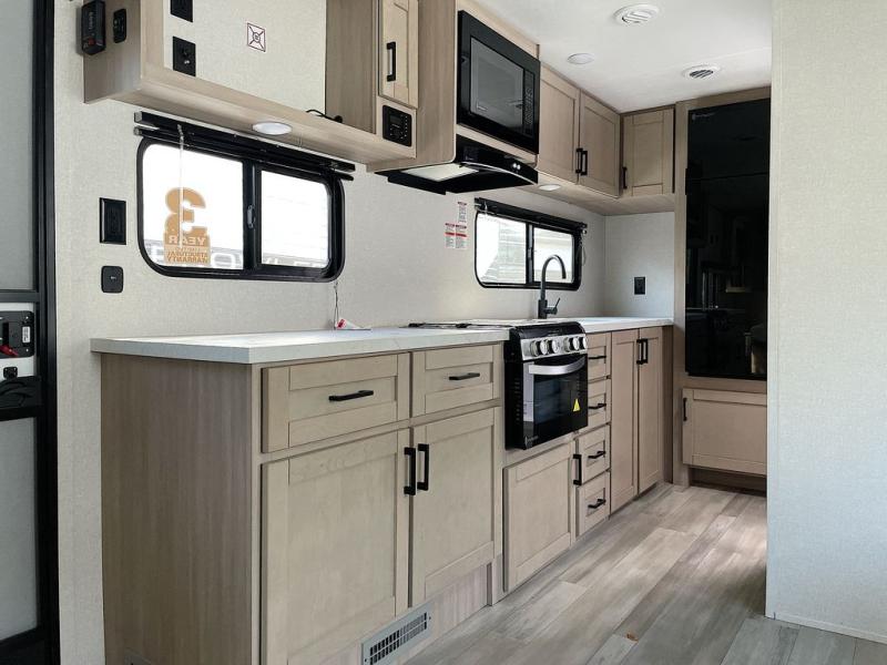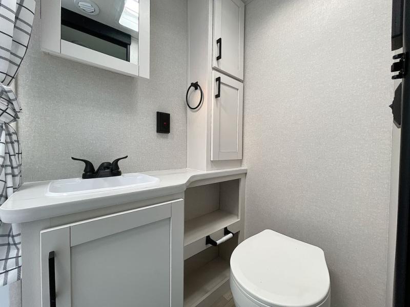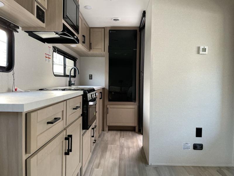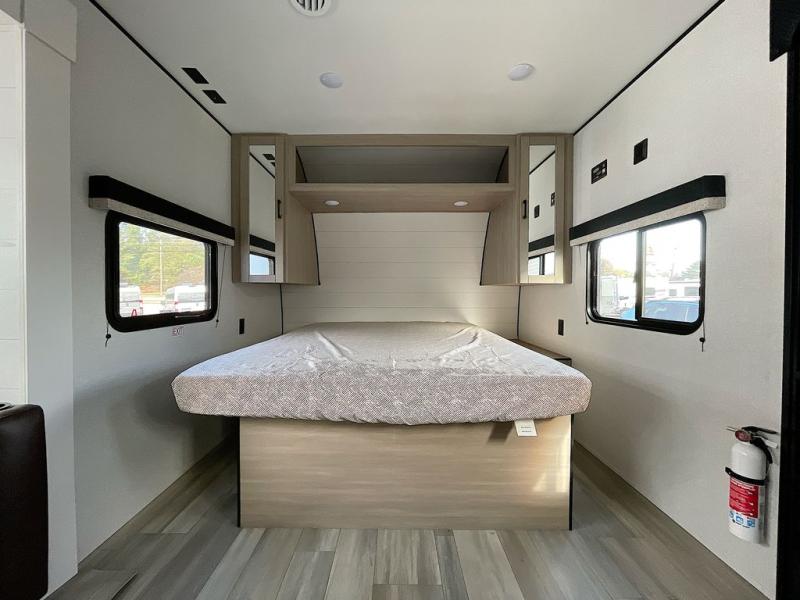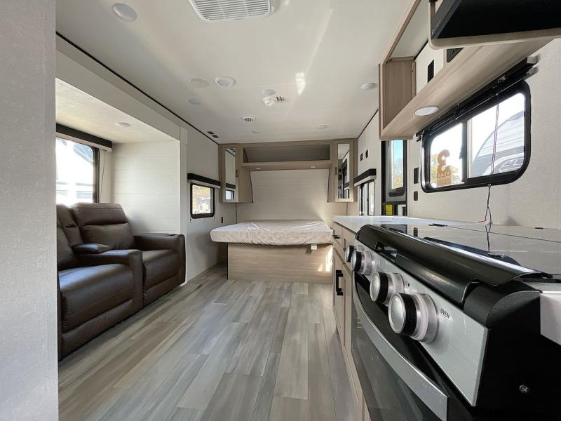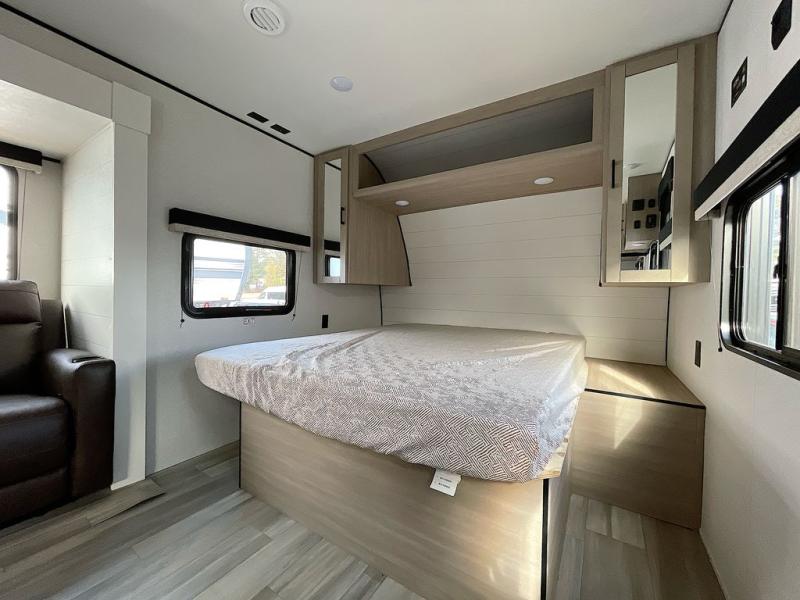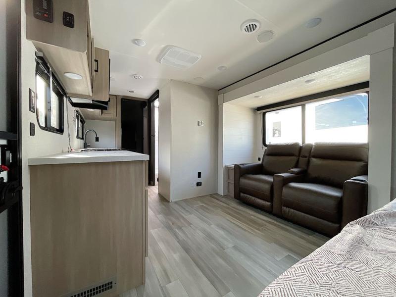 This is the perfect couple's trailer to take to the woods or lake! You can wake up each morning on the front queen bed, which also includes dual bedside wardrobes and overhead storage for your things. The rear corner kitchen includes a three-burner cooktop and microwave oven to make breakfast, and you can relax on the theater seating slide with cup holders and your coffee. And the full bath with a foot-flush toilet, sink, and 30" x 36" shower will let you clean up daily!