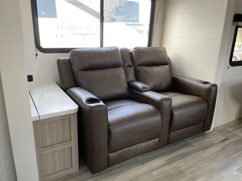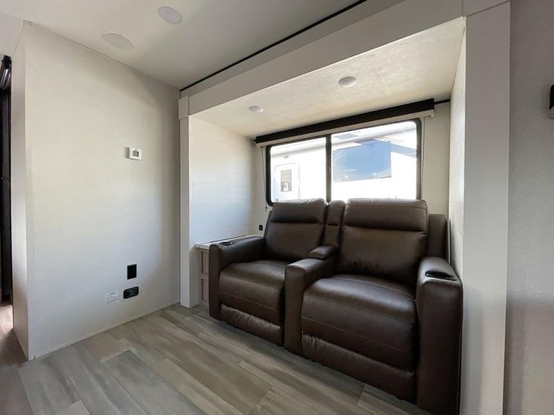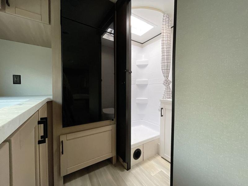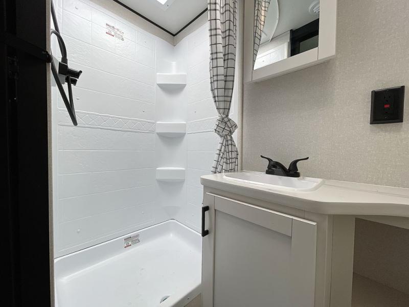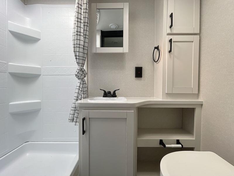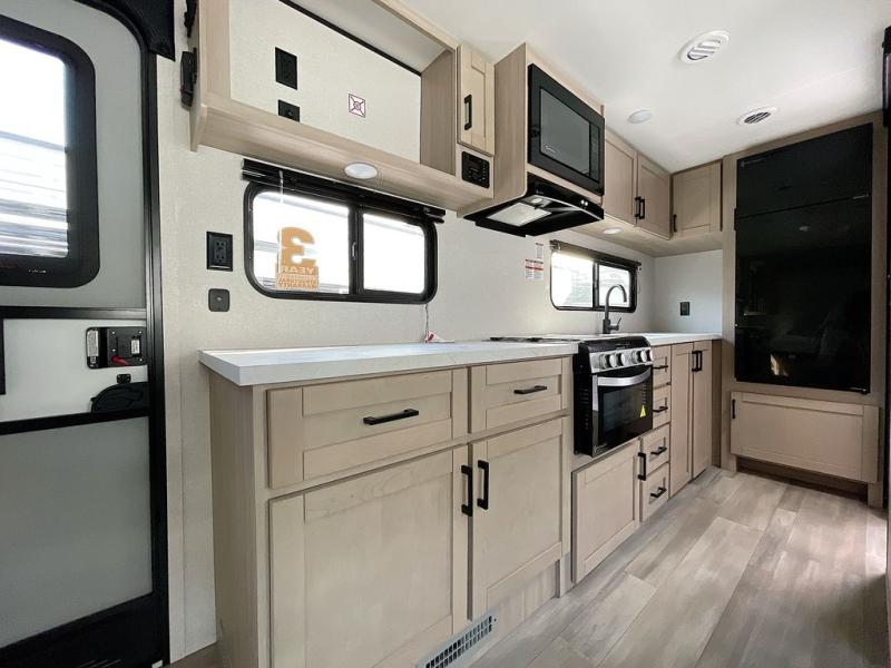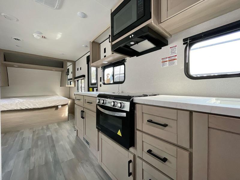 This is the perfect couple's trailer to take to the woods or lake! You can wake up each morning on the front queen bed, which also includes dual bedside wardrobes and overhead storage for your things. The rear corner kitchen includes a three-burner cooktop and microwave oven to make breakfast, and you can relax on the theater seating slide with cup holders and your coffee. And the full bath with a foot-flush toilet, sink, and 30" x 36" shower will let you clean up daily!