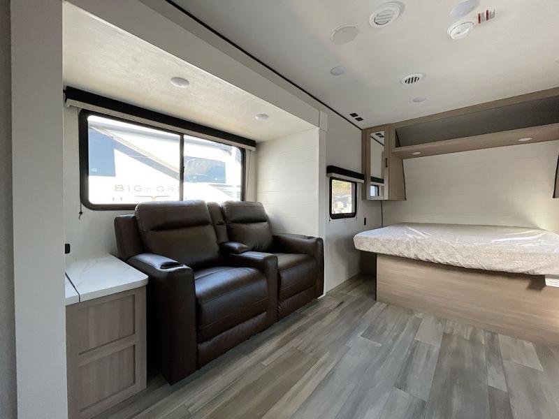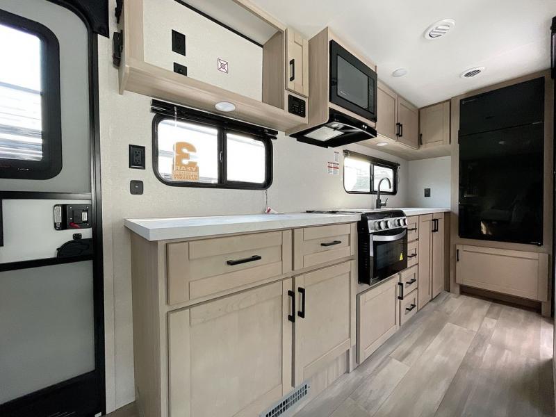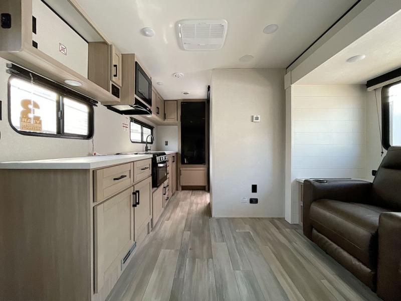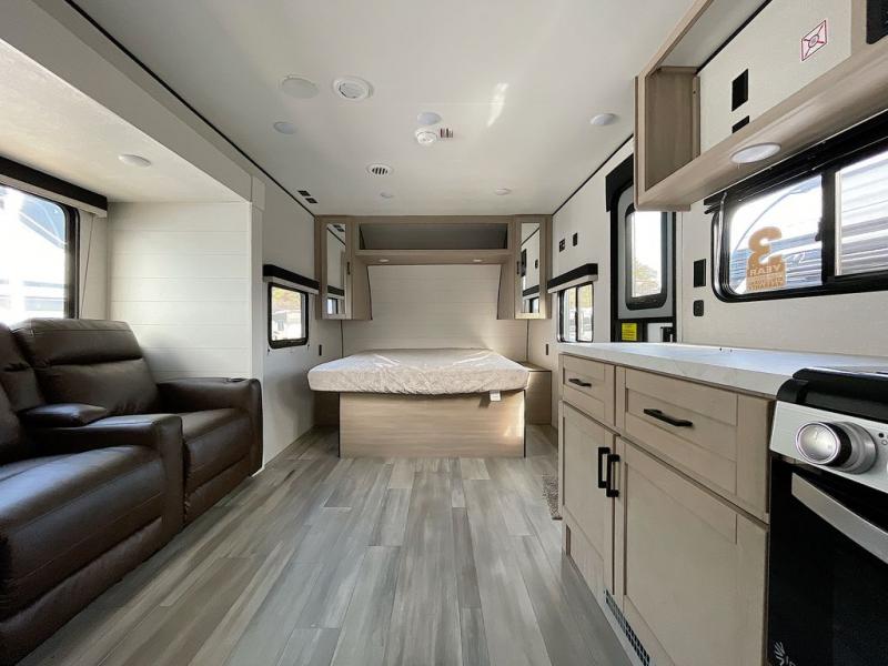 This is the perfect couple's trailer to take to the woods or lake! You can wake up each morning on the front queen bed, which also includes dual bedside wardrobes and overhead storage for your things. The rear corner kitchen includes a three-burner cooktop and microwave oven to make breakfast, and you can relax on the theater seating slide with cup holders and your coffee. And the full bath with a foot-flush toilet, sink, and 30" x 36" shower will let you clean up daily!