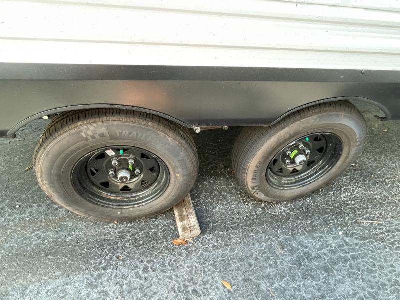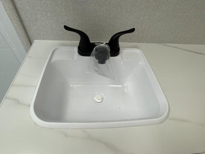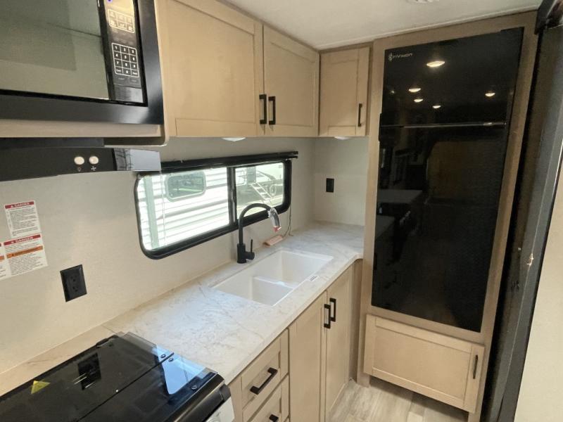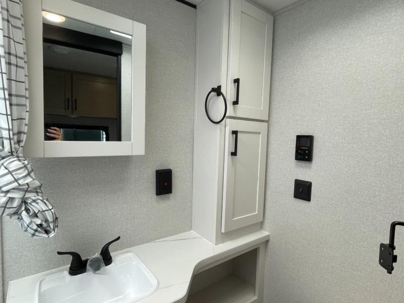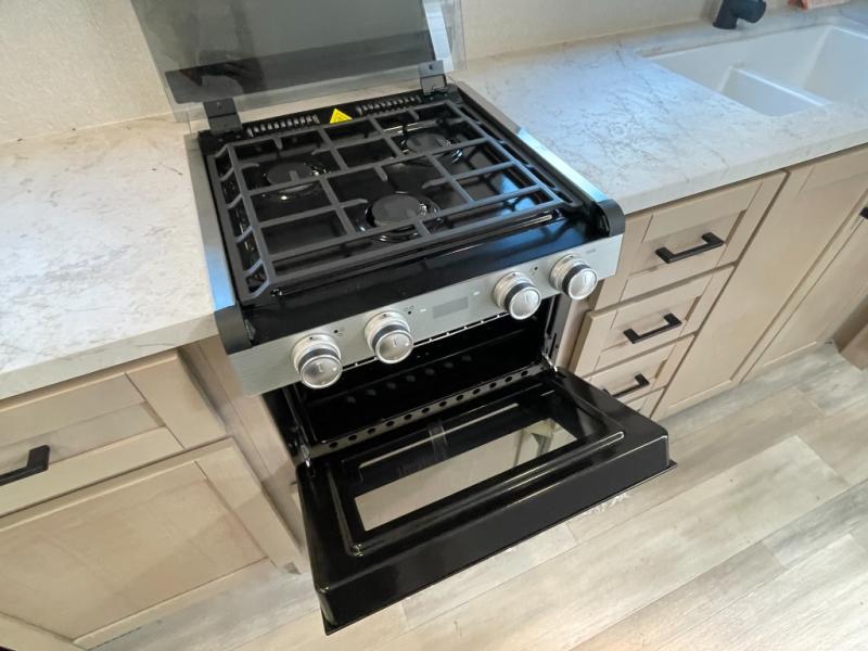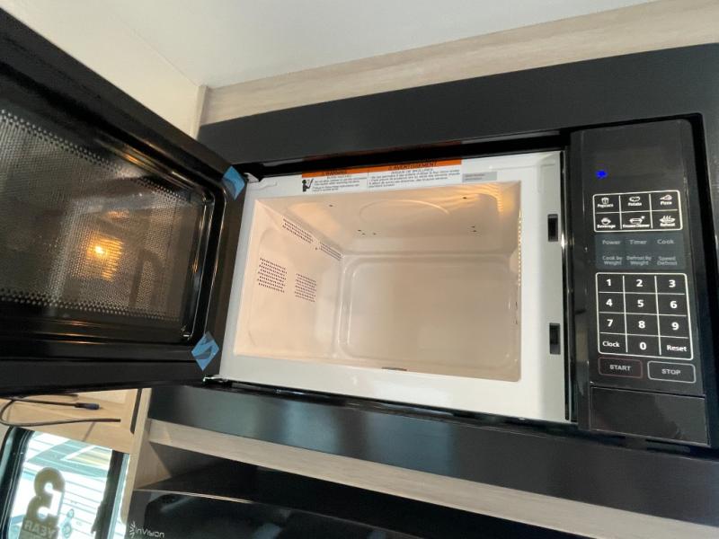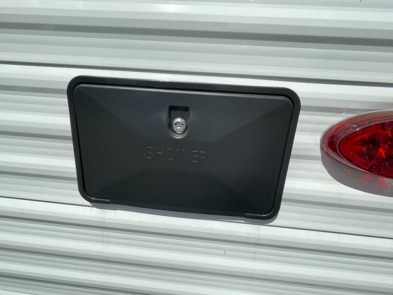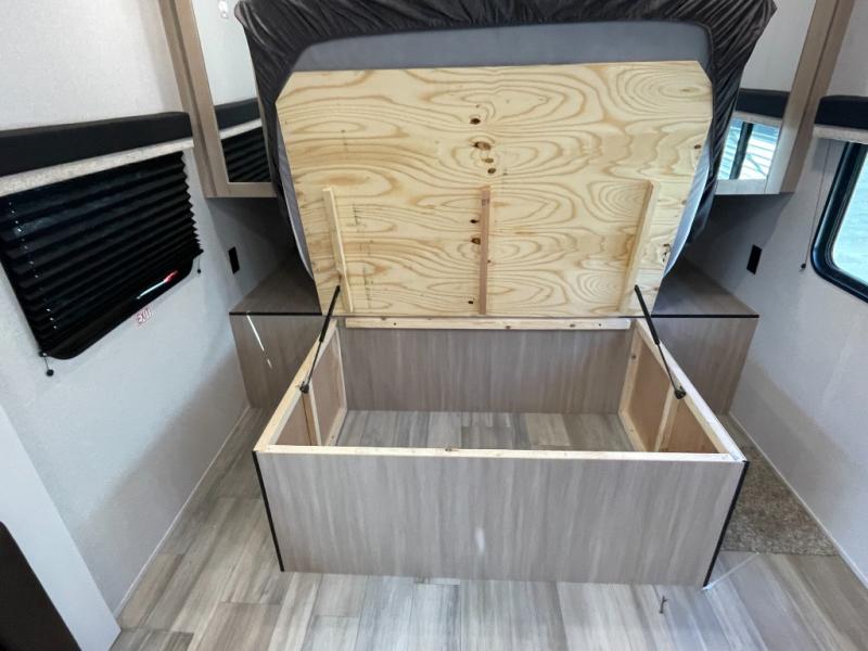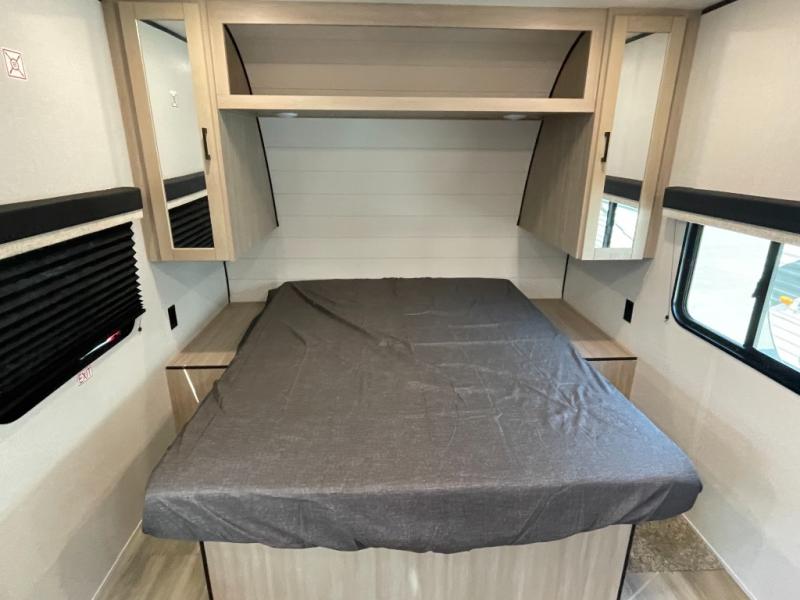 This is the perfect couple's trailer to take to the woods or lake! You can wake up each morning on the front queen bed, which also includes dual bedside wardrobes and overhead storage for your things. The rear corner kitchen includes a three-burner cooktop and microwave oven to make breakfast, and you can relax on the theater seating slide with cup holders and your coffee. And the full bath with a foot-flush toilet, sink, and 30" x 36" shower will let you clean up daily!