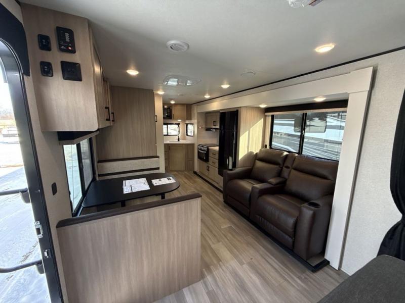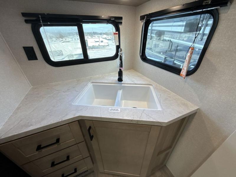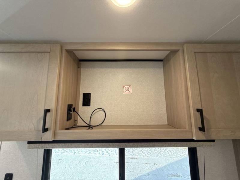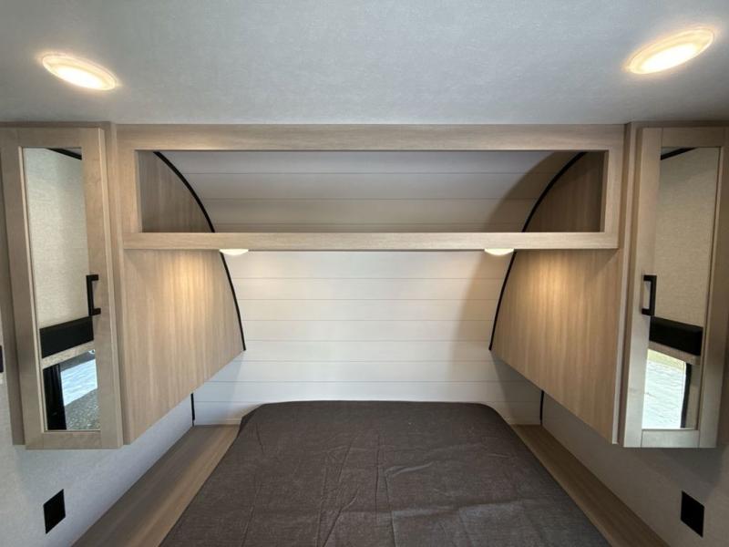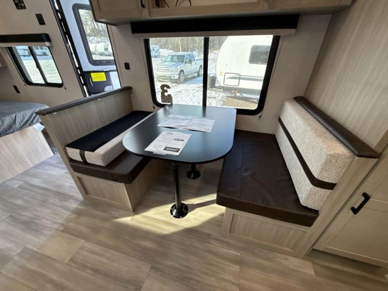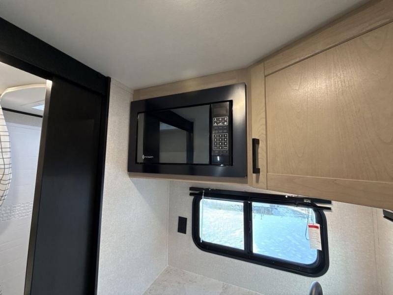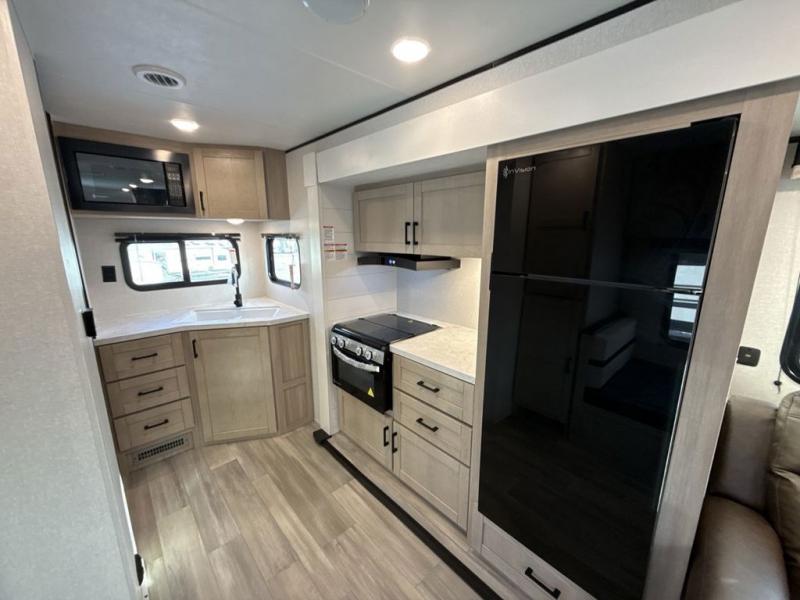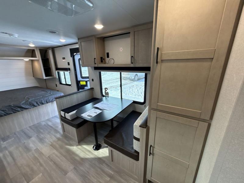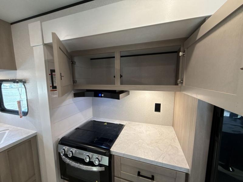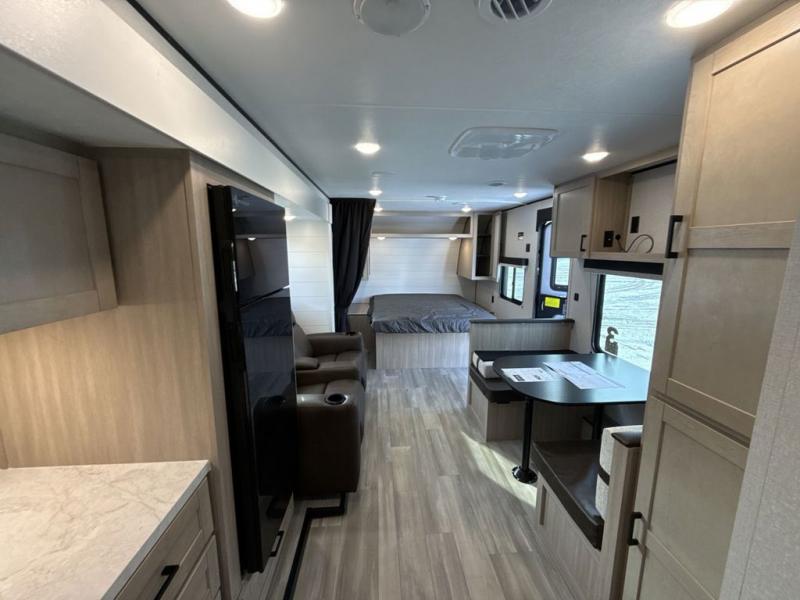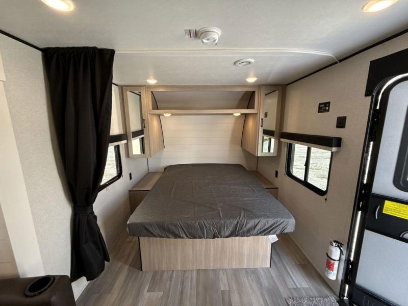 You'll love having your own space in this travel trailer thanks to the front bedroom with a queen bed, dual bedside wardrobes, and privacy curtain. A large slide out provides more space to move about, and there is theater seating here to relax in the evenings. You can make meals on the three-burner cooktop or in the microwave oven, and you can dine at the booth dinette. This unit also includes a 12V refrigerator and pantry for food storge plus ample overhead cabinets for your personal belongings.