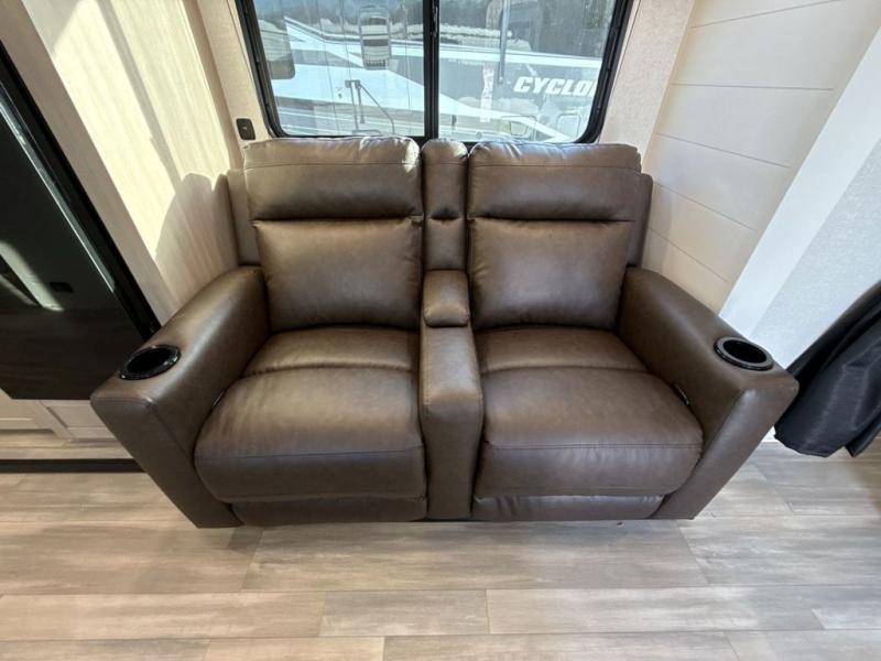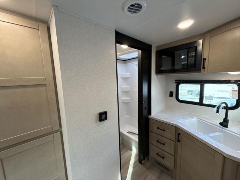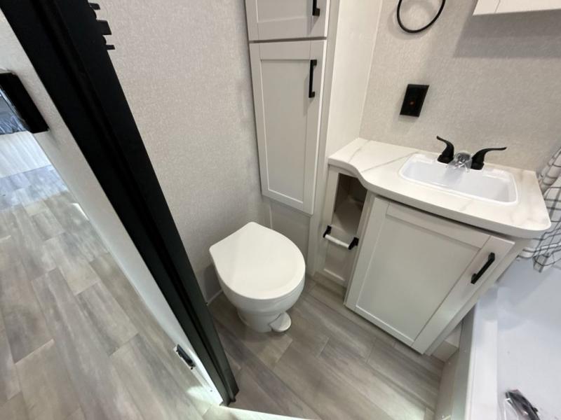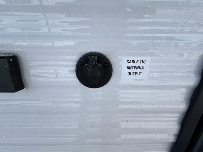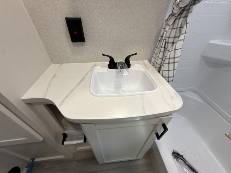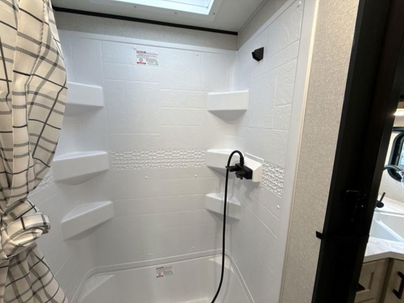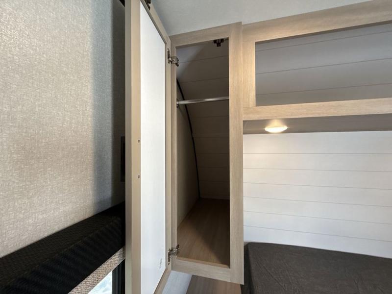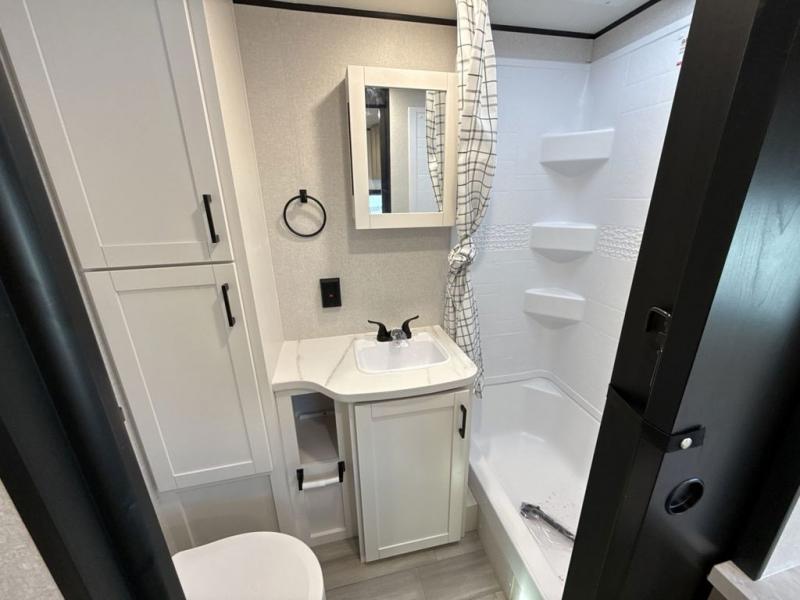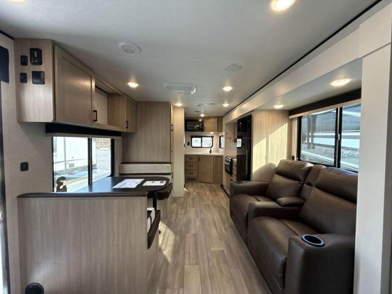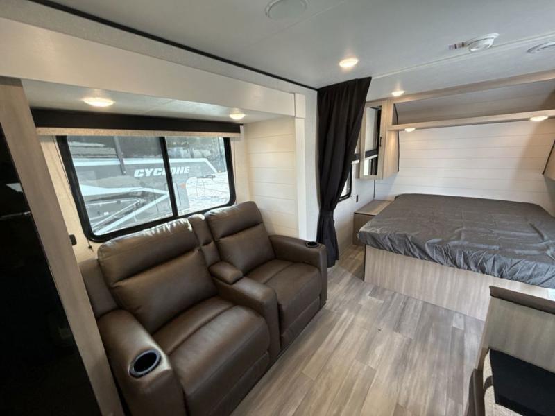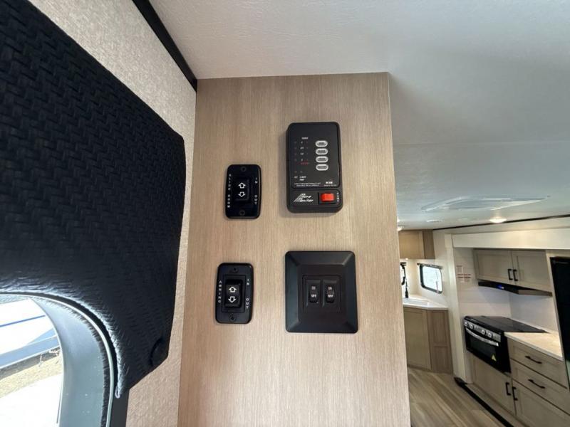 You'll love having your own space in this travel trailer thanks to the front bedroom with a queen bed, dual bedside wardrobes, and privacy curtain. A large slide out provides more space to move about, and there is theater seating here to relax in the evenings. You can make meals on the three-burner cooktop or in the microwave oven, and you can dine at the booth dinette. This unit also includes a 12V refrigerator and pantry for food storge plus ample overhead cabinets for your personal belongings.