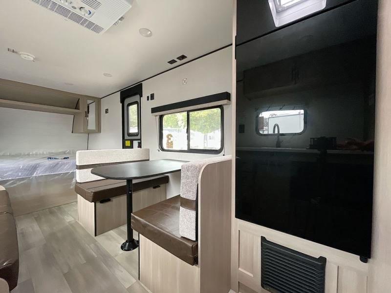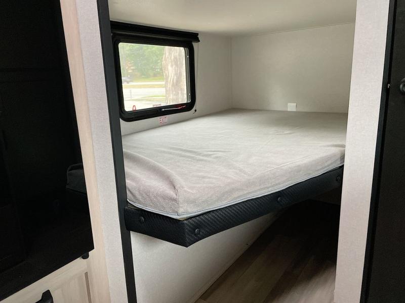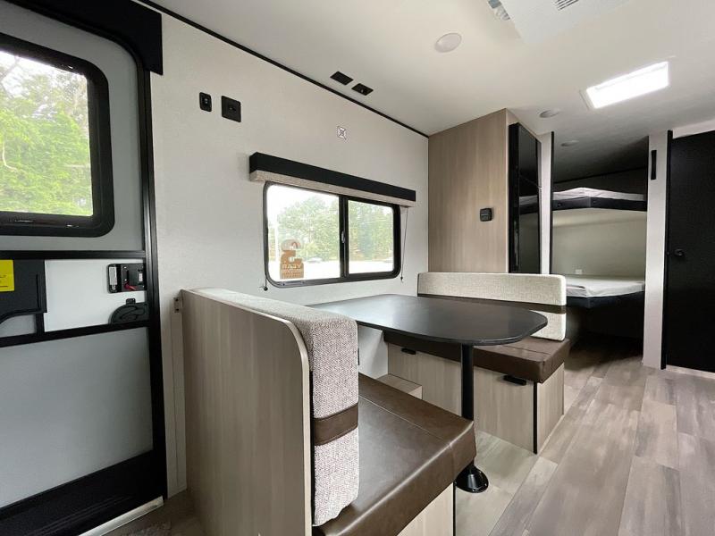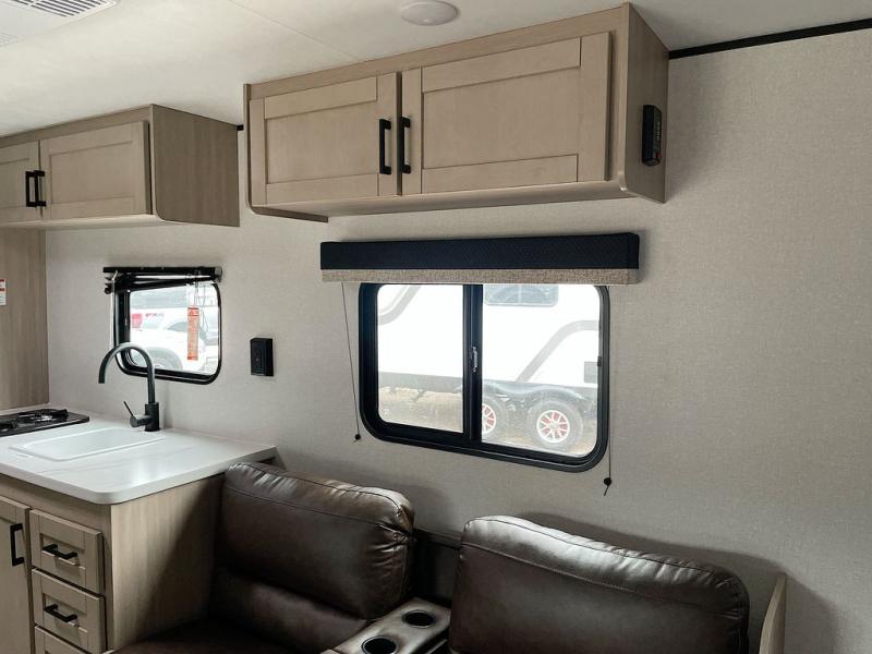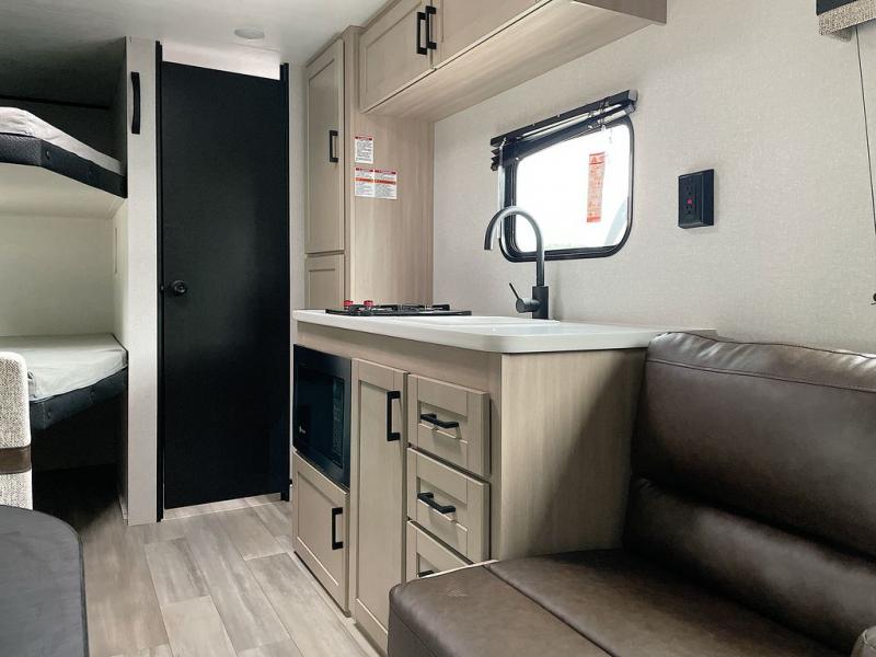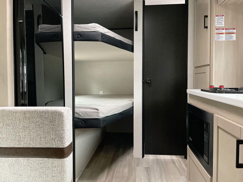 Camping trips are made easy in this Lynx Edition travel trailer with double-size bunk beds for guests or little ones. You'll find a front walk-around queen bed for a great night's rest, along with dual bedside wardrobes to keep your things tidy. The rear corner private bath includes a foot-flush toilet and a 40" shower, so you won't have to leave the camper in the middle of the night. A two-burner cooktop and microwave oven will let you make meals each day, and you'll find seating spaces at the booth dinette or on the sofa!