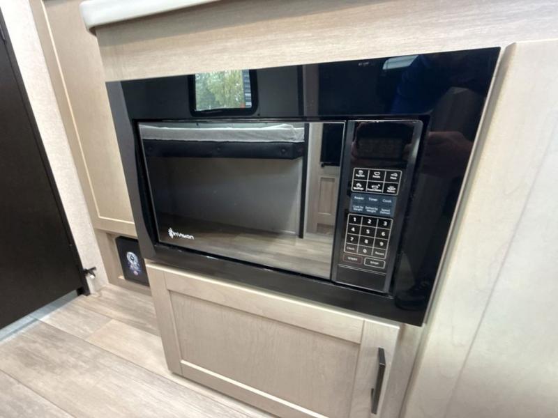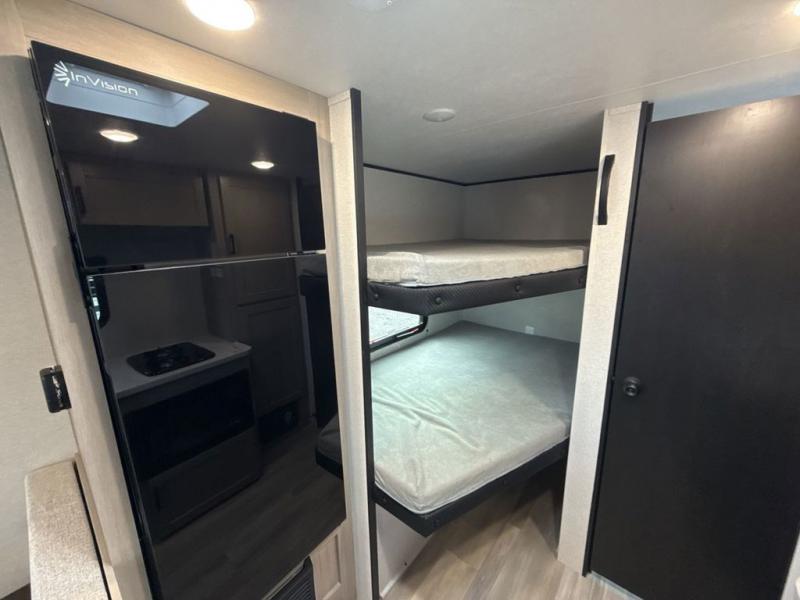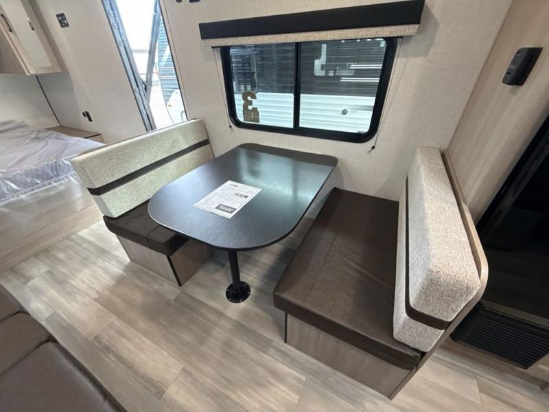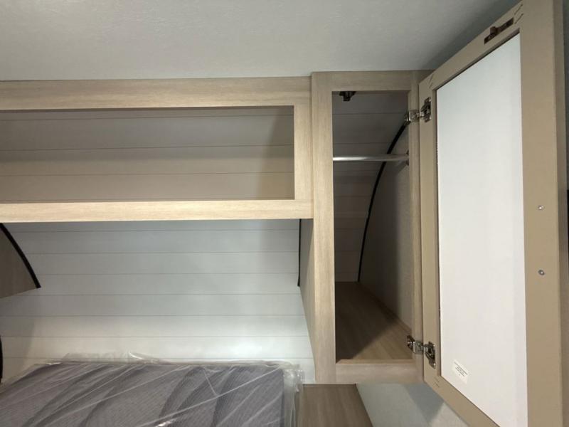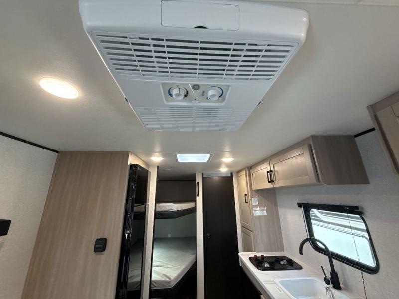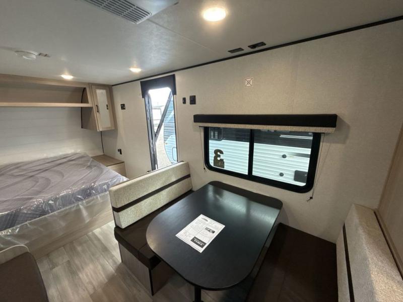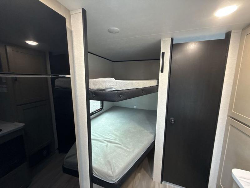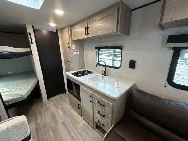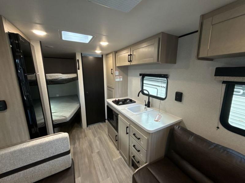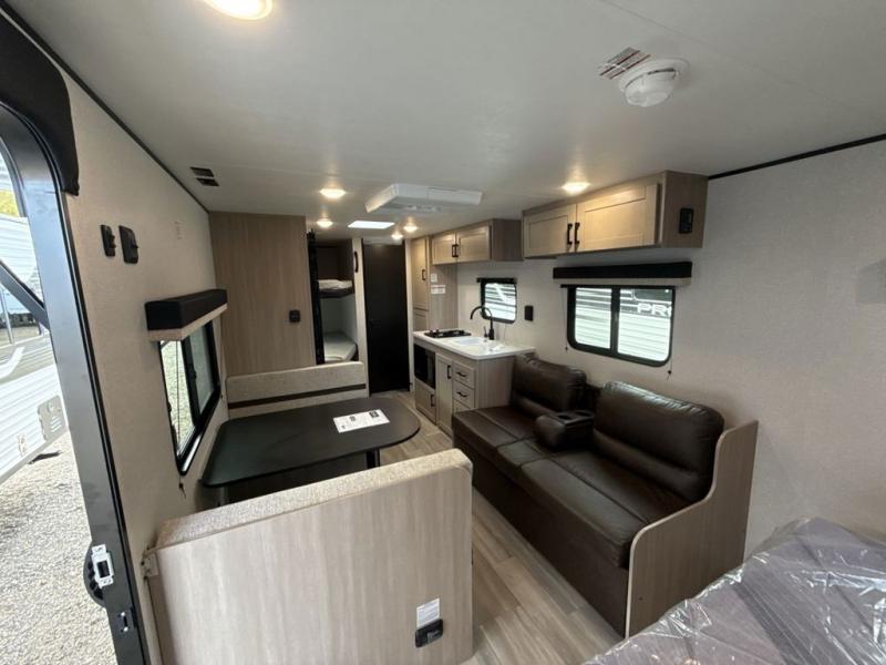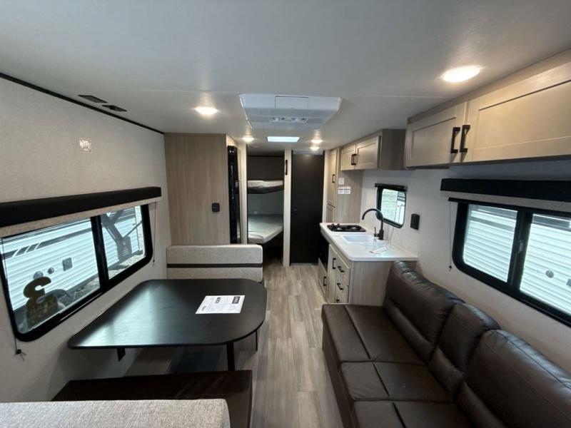 Camping trips are made easy in this Lynx Edition travel trailer with double-size bunk beds for guests or little ones. You'll find a front walk-around queen bed for a great night's rest, along with dual bedside wardrobes to keep your things tidy. The rear corner private bath includes a foot-flush toilet and a 40" shower, so you won't have to leave the camper in the middle of the night. A two-burner cooktop and microwave oven will let you make meals each day, and you'll find seating spaces at the booth dinette or on the sofa!