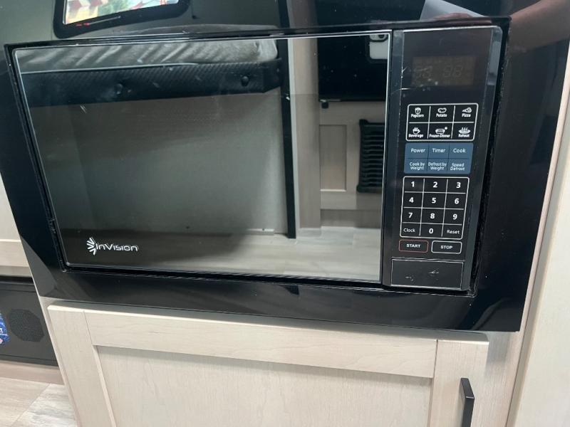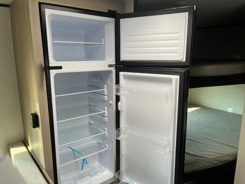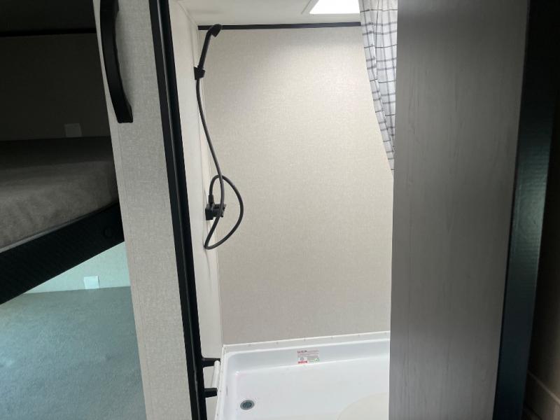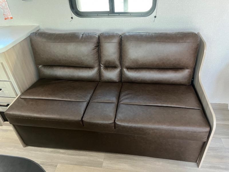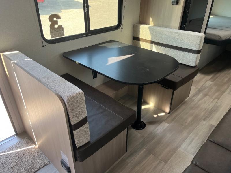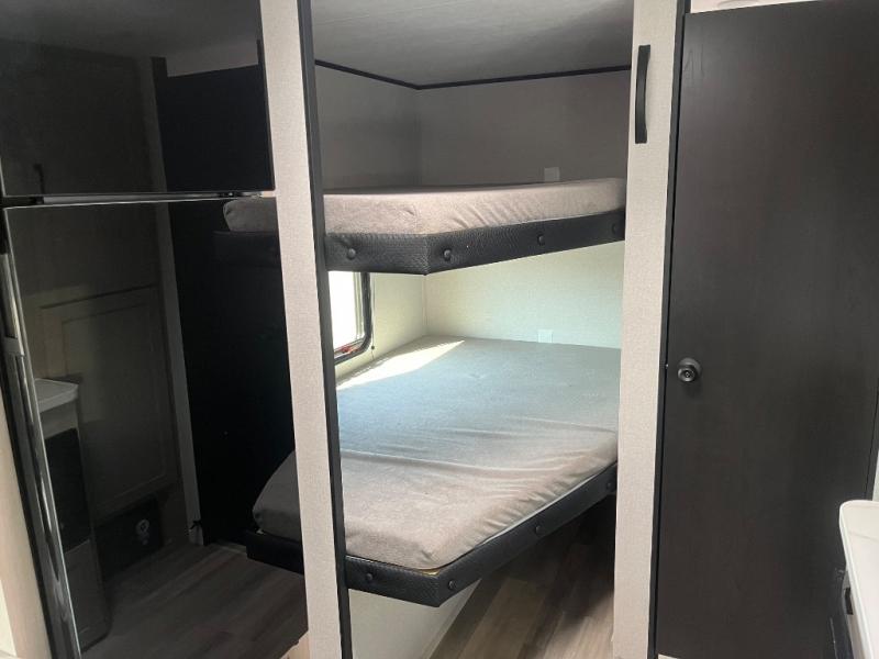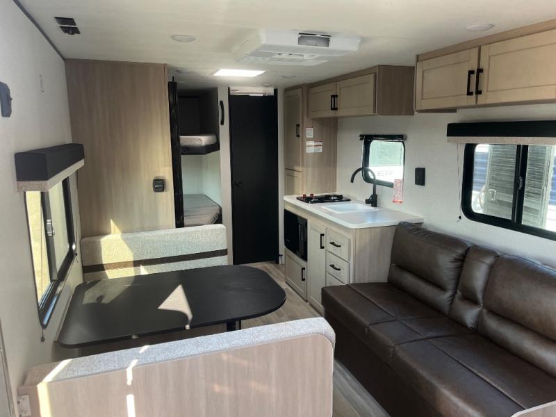 Camping trips are made easy in this Lynx Edition travel trailer with double-size bunk beds for guests or little ones. You'll find a front walk-around queen bed for a great night's rest, along with dual bedside wardrobes to keep your things tidy. The rear corner private bath includes a foot-flush toilet and a 40" shower, so you won't have to leave the camper in the middle of the night. A two-burner cooktop and microwave oven will let you make meals each day, and you'll find seating spaces at the booth dinette or on the sofa!